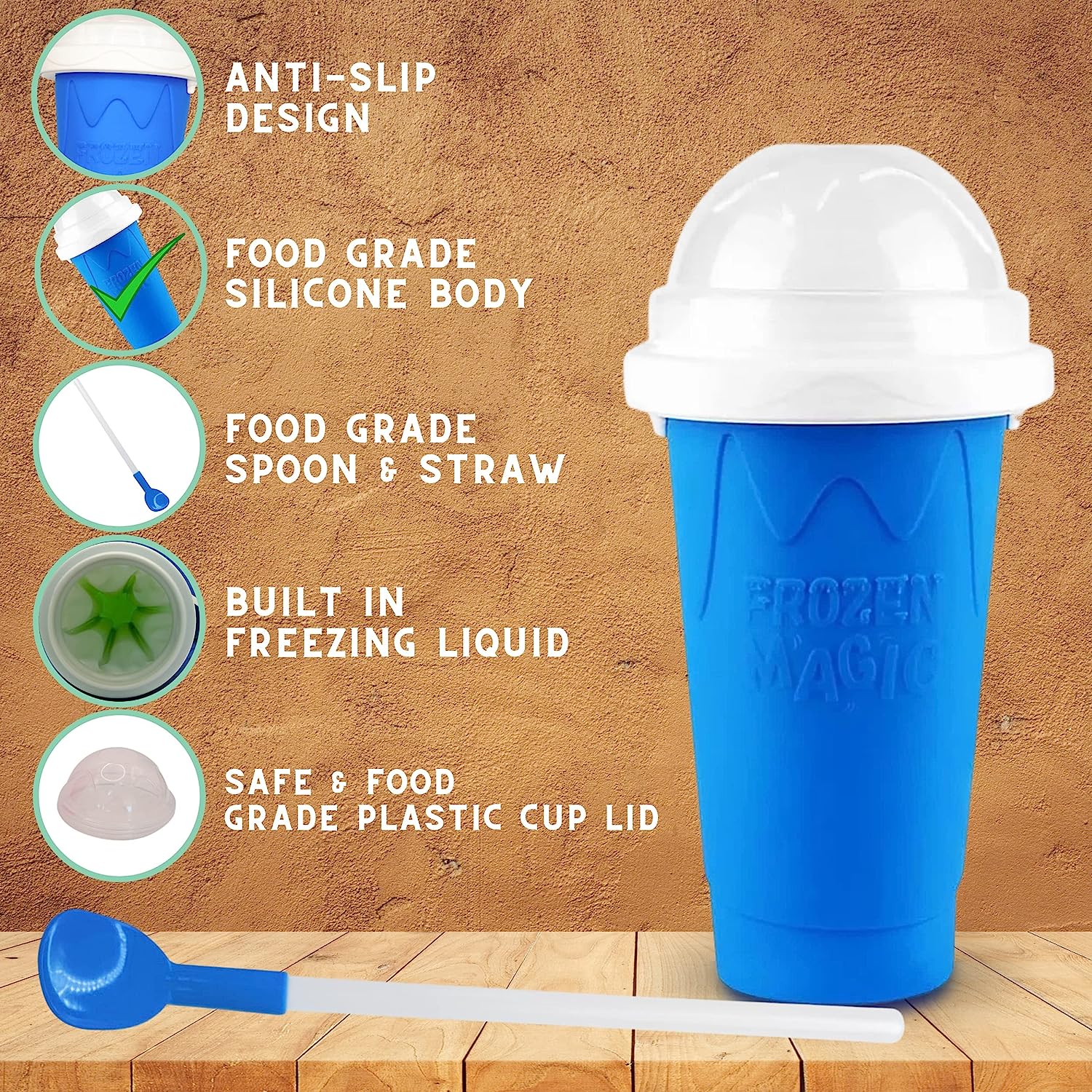 • Food Grade Material : Our EJ1 slushy cup is 100% safe with all of its parts made from non-toxic food grade material. The body is made from food-grade silicone, which is safe and environment friendly. And, the inner tank of slushie cup maker is made of high-quality food-grade TPU material, which never leaks. The outer body has comfortable grip, just wash the slushie maker cup with warm soapy water and you are good to go again.
