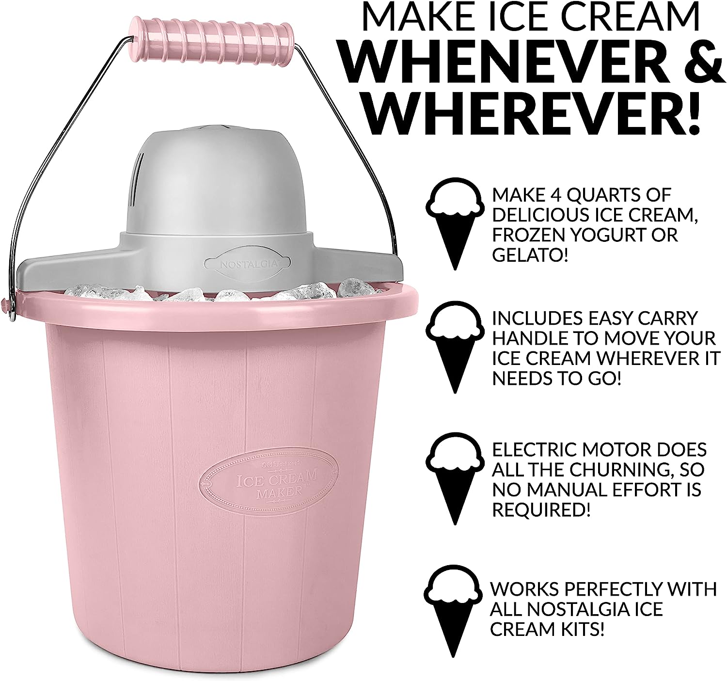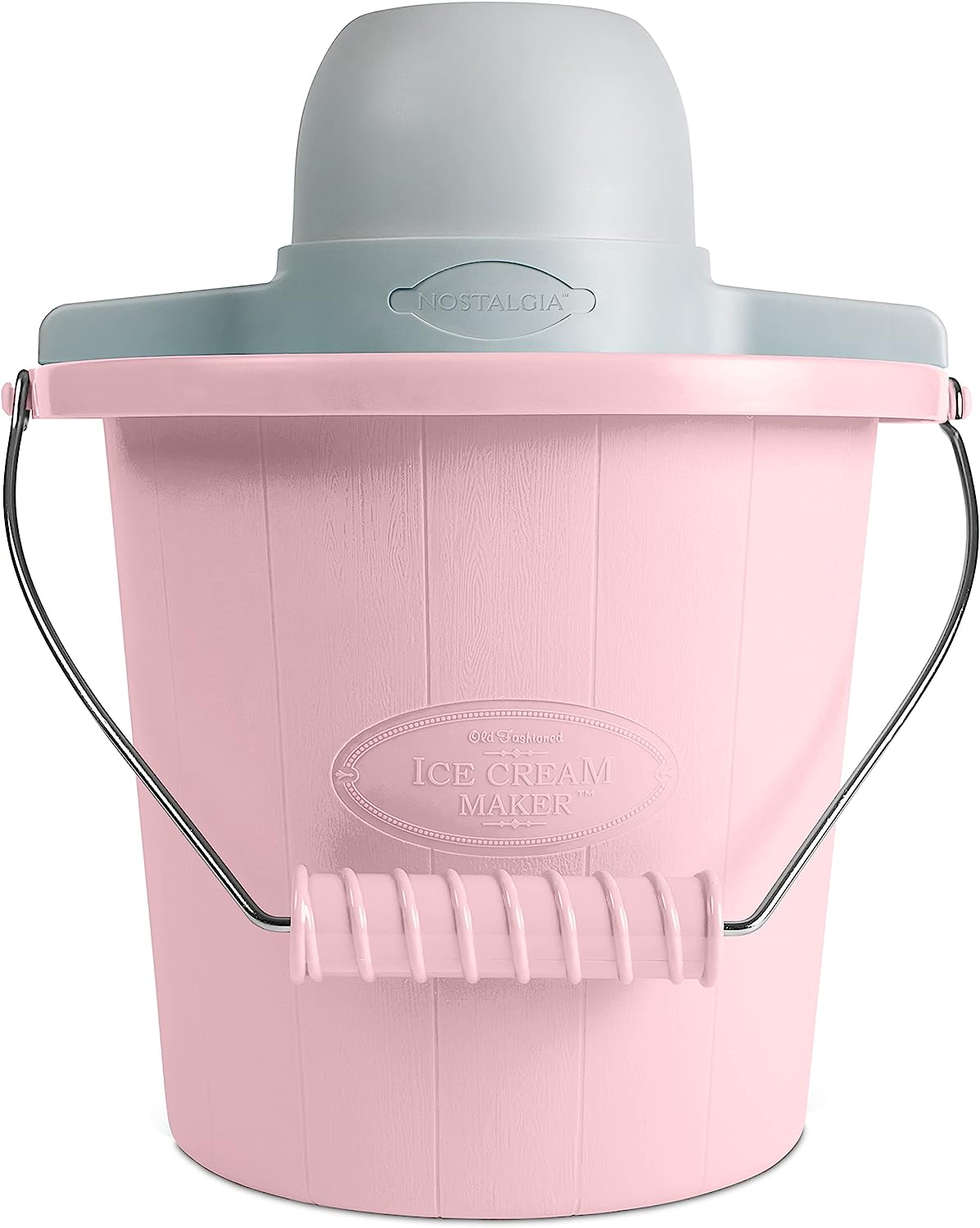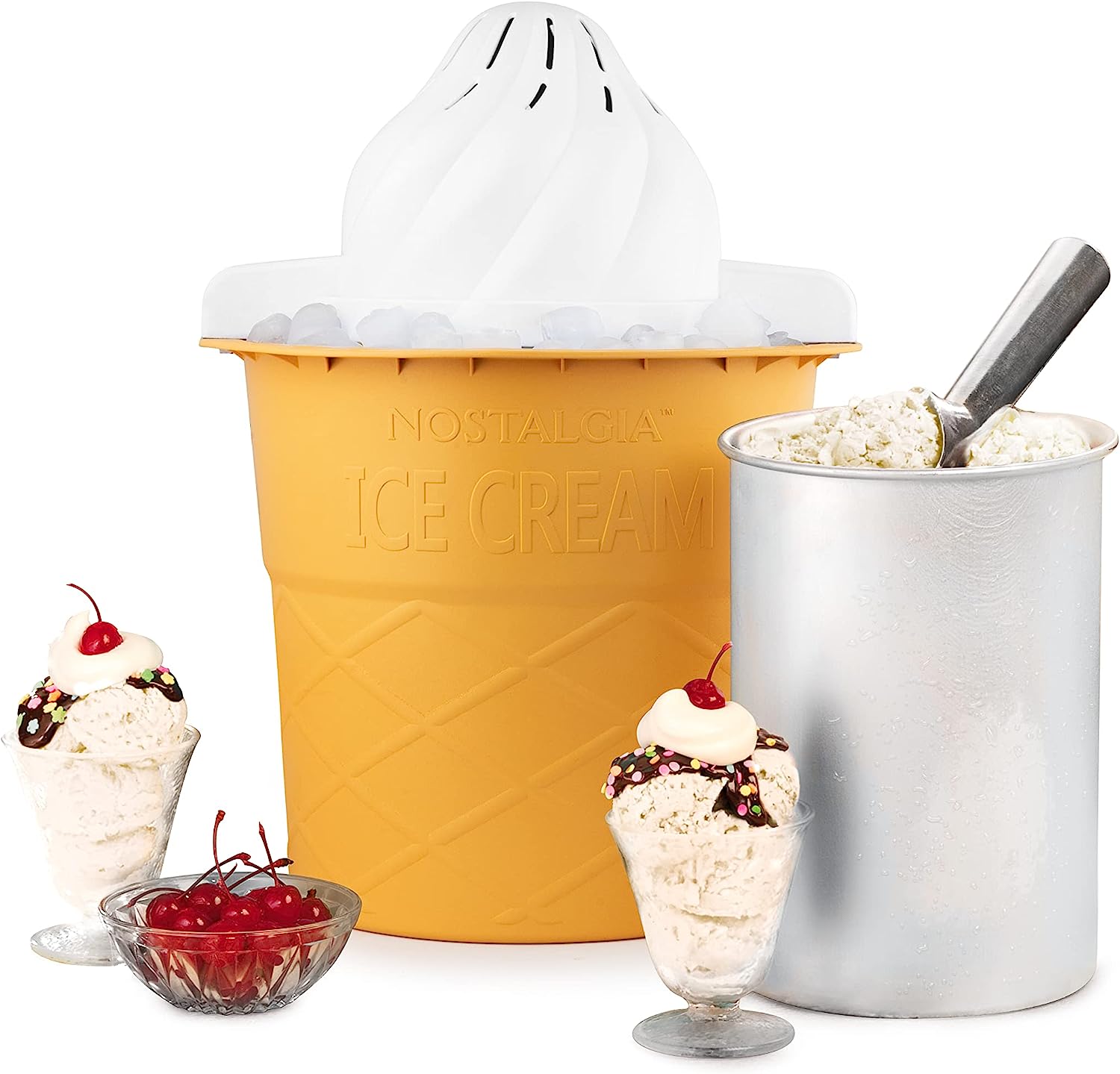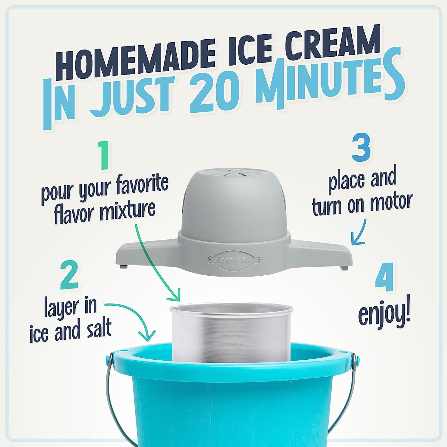 Gather the whole family and enjoy a fun-filled ice cream-making experience with Nostalgia's Electric Ice Cream Maker. You can make ice cream, sorbet, and gelato whenever and wherever you want. Add your ingredients into the aluminum canister, place in the middle of the bucket, layer with ice and salt, and let the electric motor do the rest. Customize each recipe by adding extras, like strawberry preserves, cookie dough, candy, and cookie pieces. When you're all done, use the included lid and cap to store leftover ice cream in the freezer.