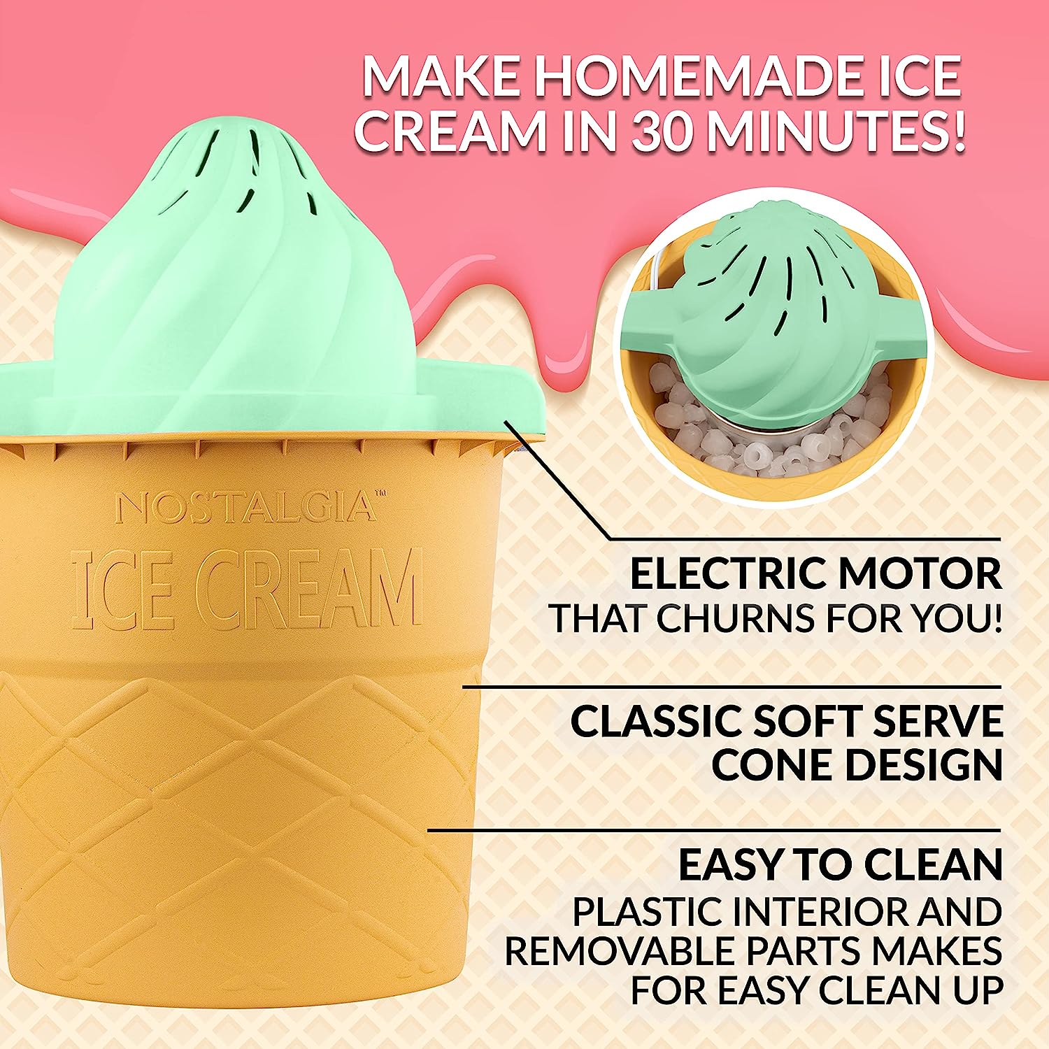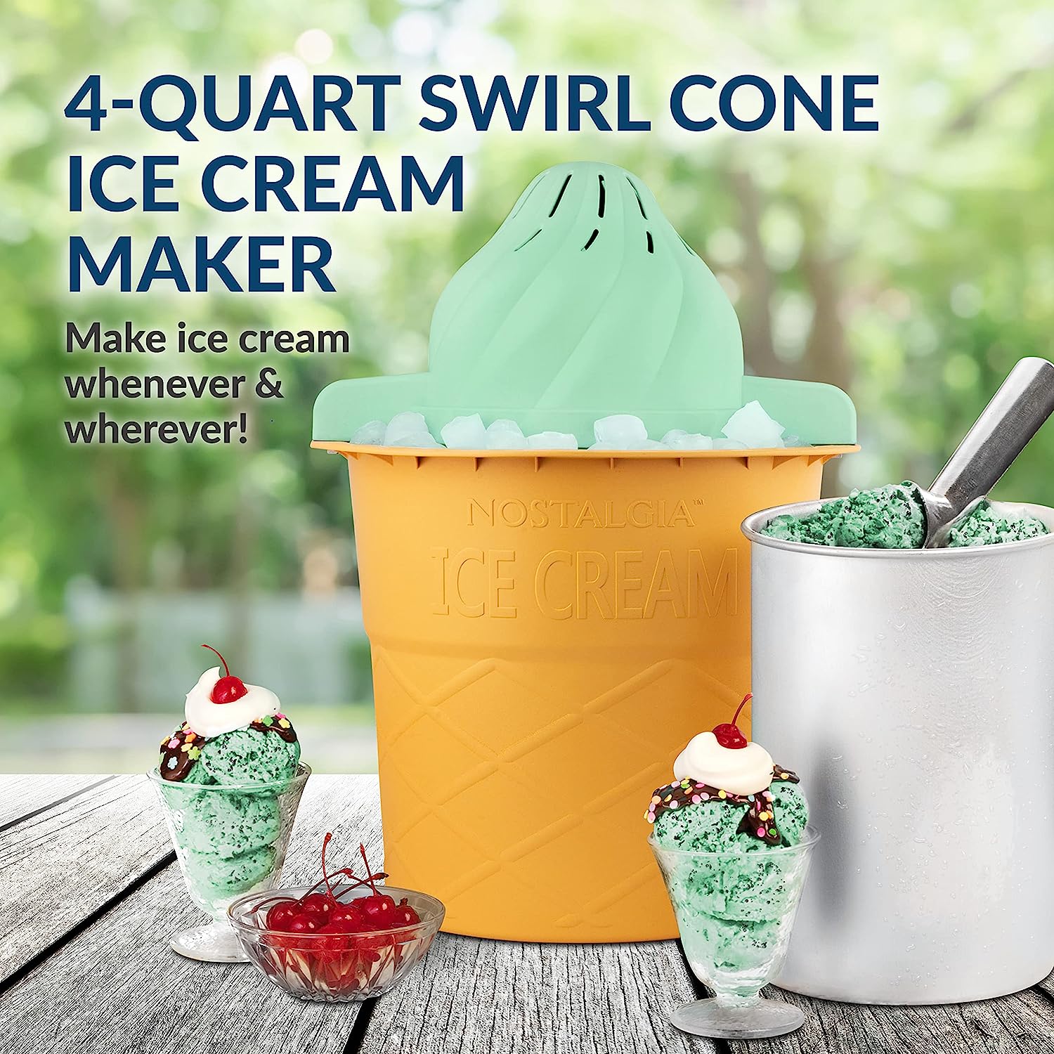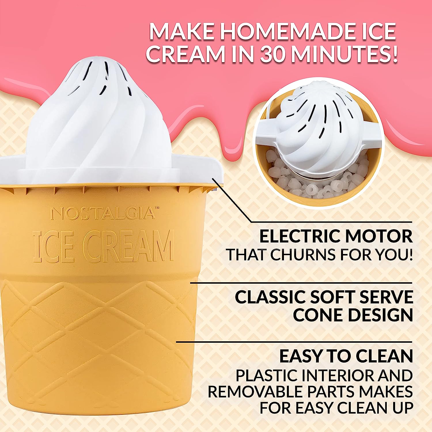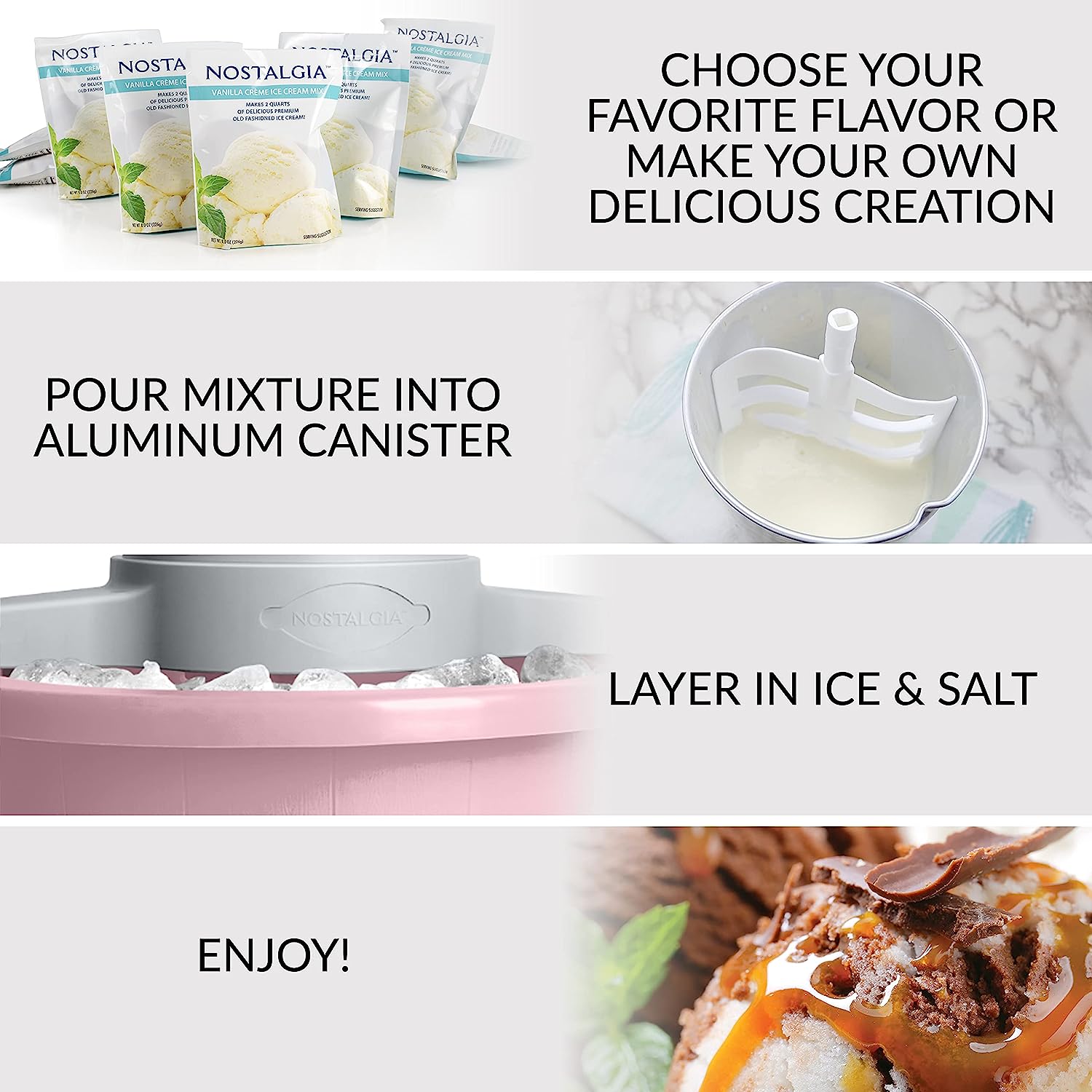 Gather the whole family and enjoy a fun-filled ice cream-making experience with Nostalgia's Electric Ice Cream Maker. You can make ice cream, sorbet, and gelato whenever and wherever you want. Add your ingredients into the aluminum canister, place in the middle of the bucket, layer with ice and salt, and let the electric motor do the rest. Customize each recipe by adding extras, like strawberry preserves, cookie dough, candy, and cookie pieces. When you're all done, use the included lid and cap to store leftover ice cream in the freezer.
