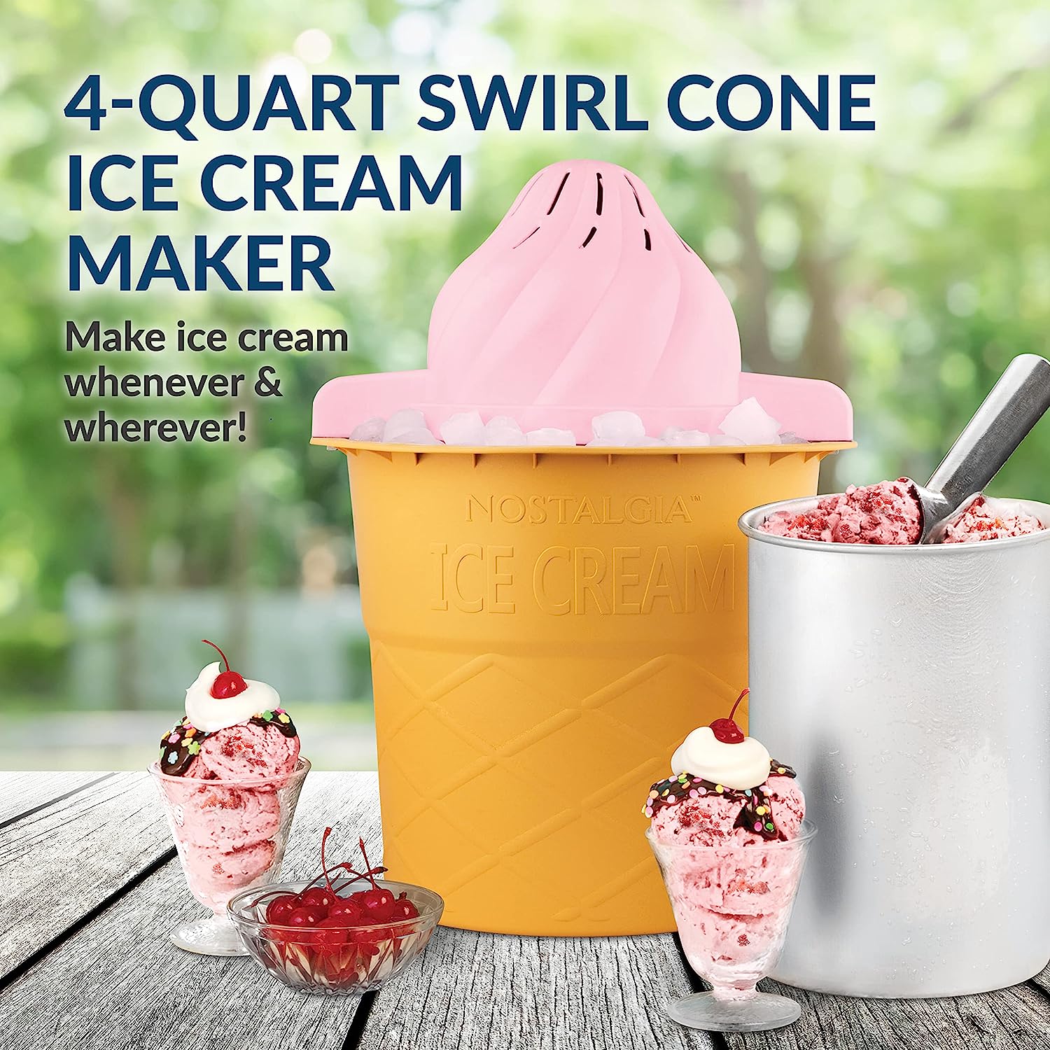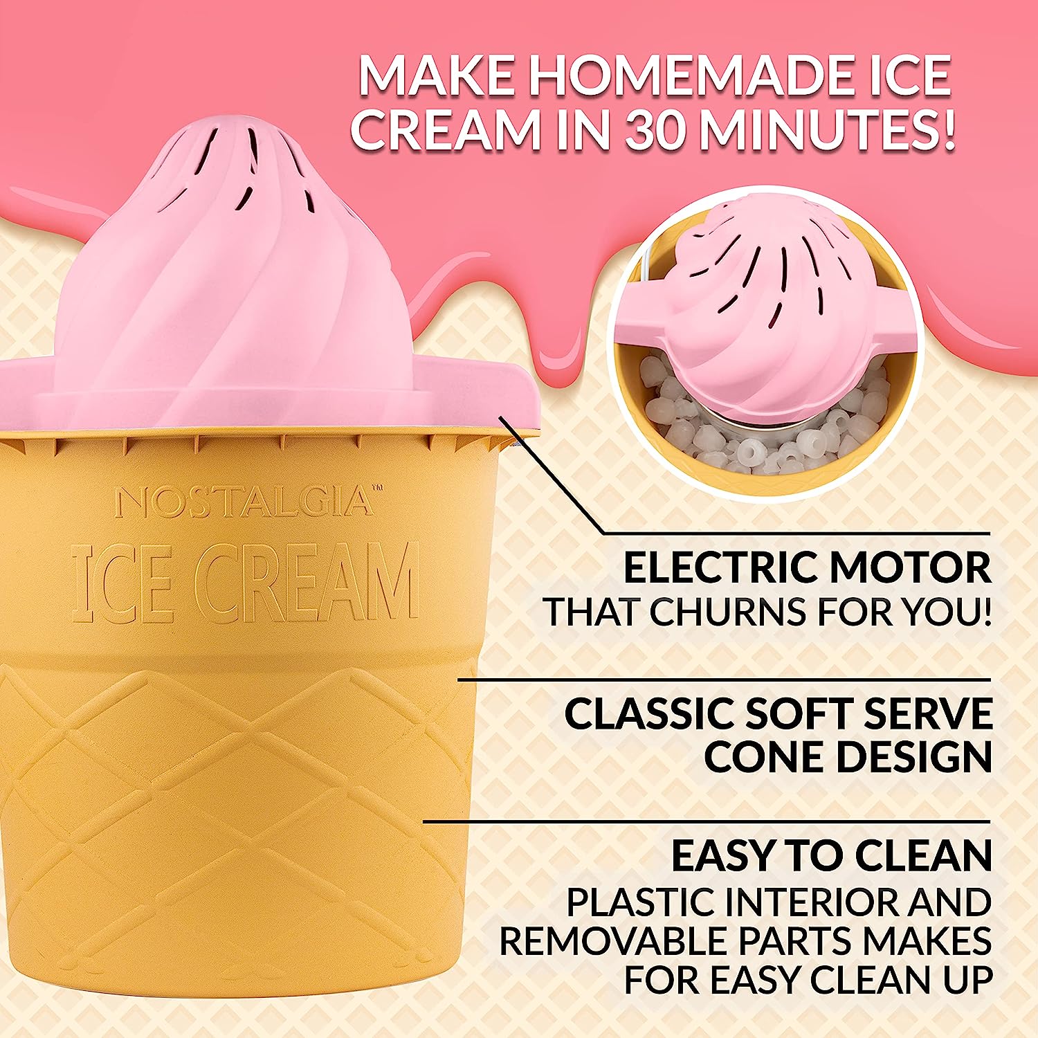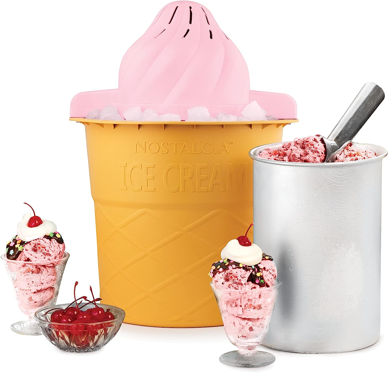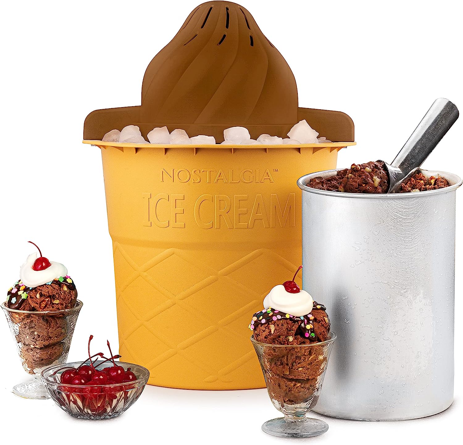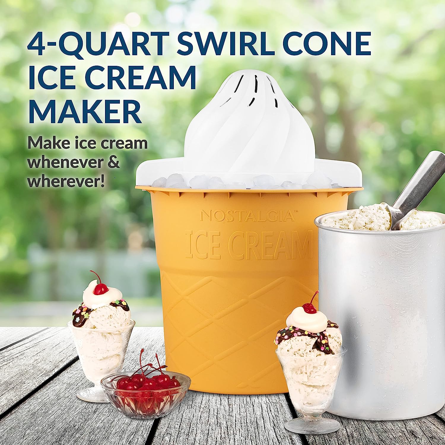 Gather the whole family and enjoy a fun-filled ice cream-making experience with Nostalgia's Electric Ice Cream Maker. You can make ice cream, sorbet, and gelato whenever and wherever you want. Add your ingredients into the aluminum canister, place in the middle of the bucket, layer with ice and salt, and let the electric motor do the rest. Customize each recipe by adding extras, like strawberry preserves, cookie dough, candy, and cookie pieces. When you're all done, use the included lid and cap to store leftover ice cream in the freezer.