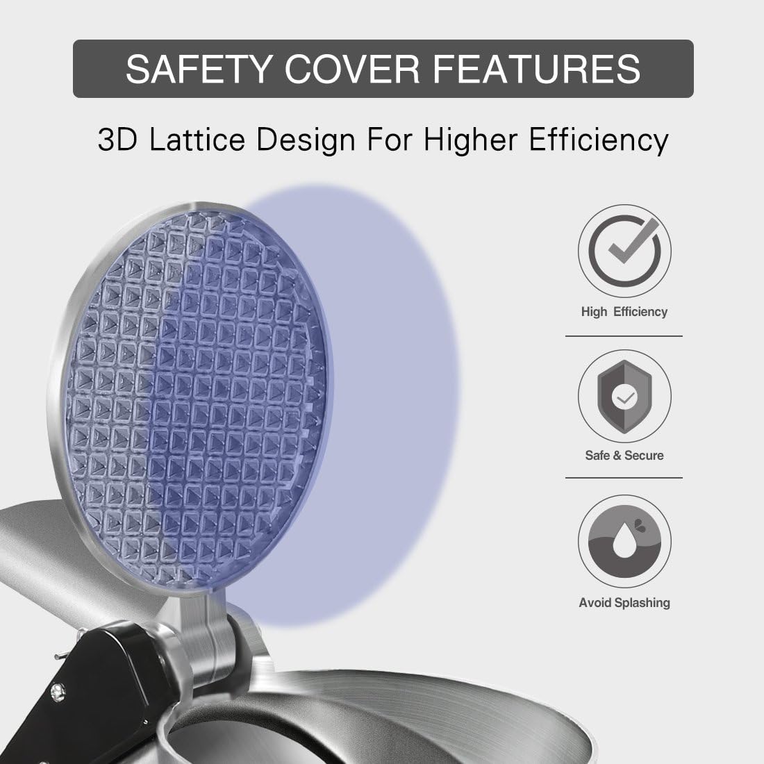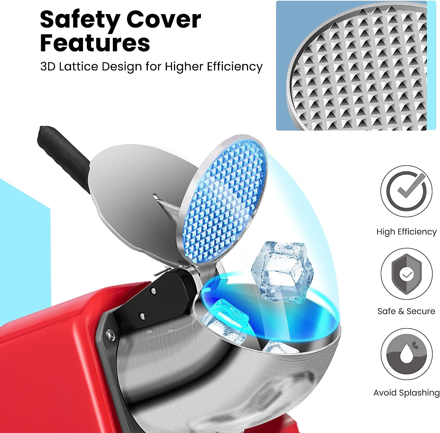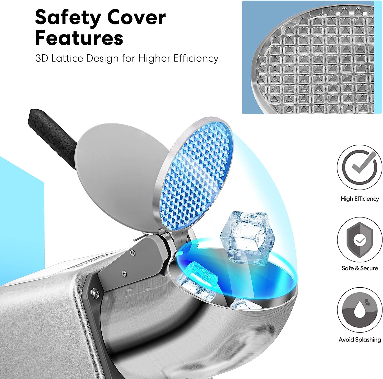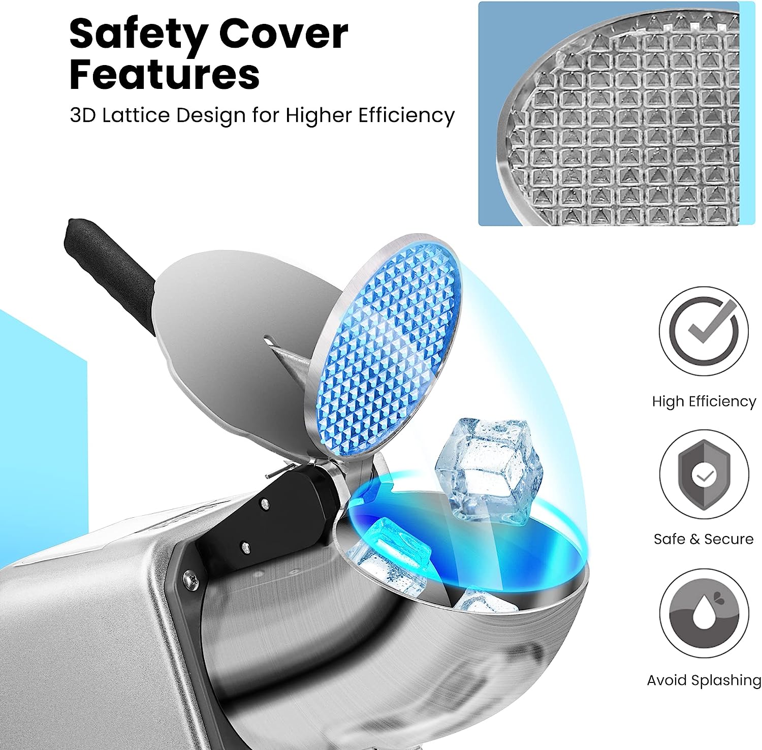 • SMART DESIGN - Our waterproof “on/off” switch guarantees safety, convenience, and peace of mind; Blades stop rotating and the power shuts off automatically when the hopper handle is open to avoid injury; The roller on the outlet is helpful to prevent ice from splashing, giving you an enjoyable ice-making experience