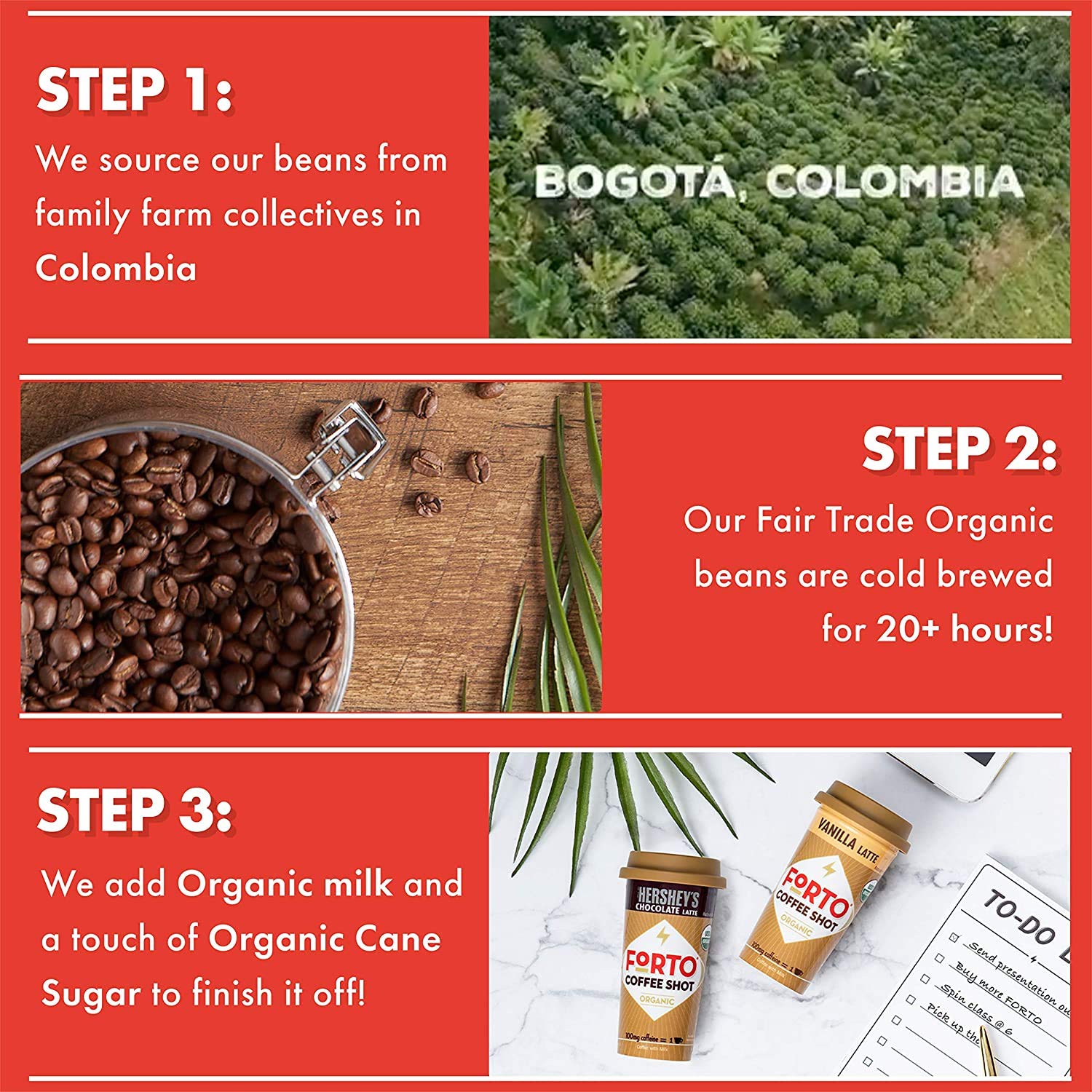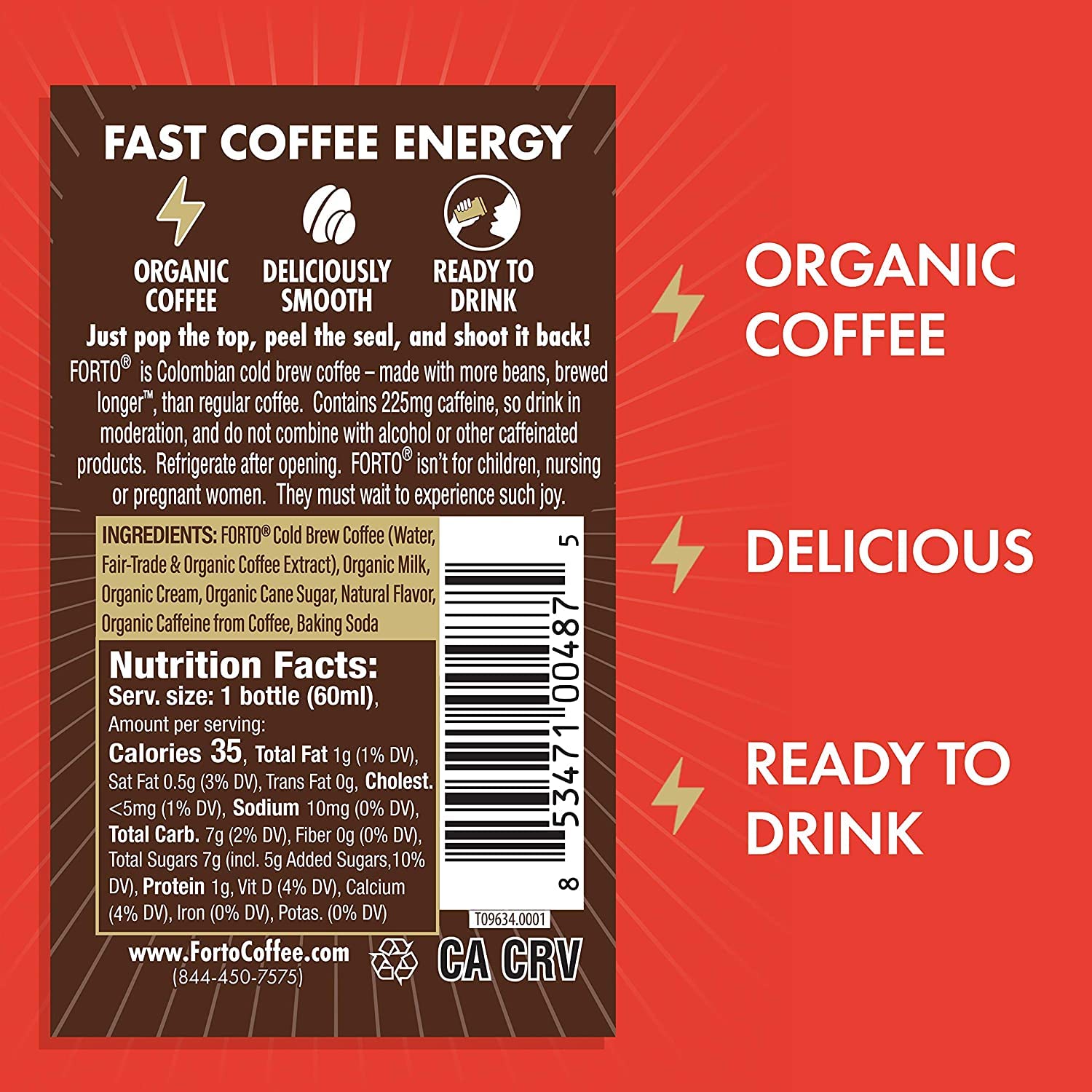 • USDA ORGANIC CERTIFIED & DELICIOUS - FORTO High Caffeine Cold Brew Coffee is made by using more beans, brewed longer than regular coffee. Made using only simple, natural ingredients like farm fresh organic whole milk and Arabica coffee sourced from family-owned farms in Colombia