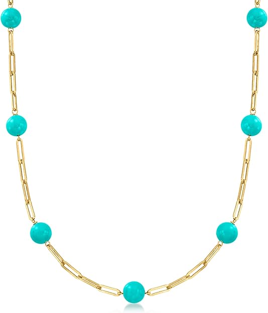 Ross-Simons Italian 8mm Turquoise Bead Paper Clip Link Necklace in 18kt Gold Over Sterling