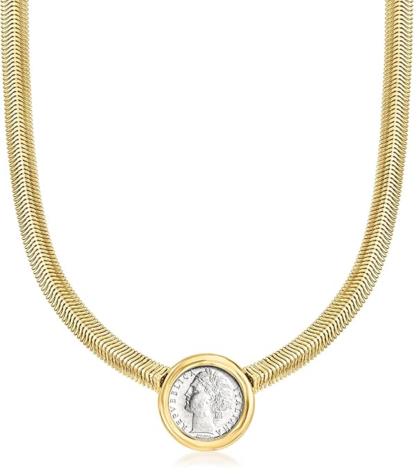Ross-Simons Italian Genuine 100-Lira Coin Snake-Chain Necklace in 18kt Gold Over Sterling. 18 inches