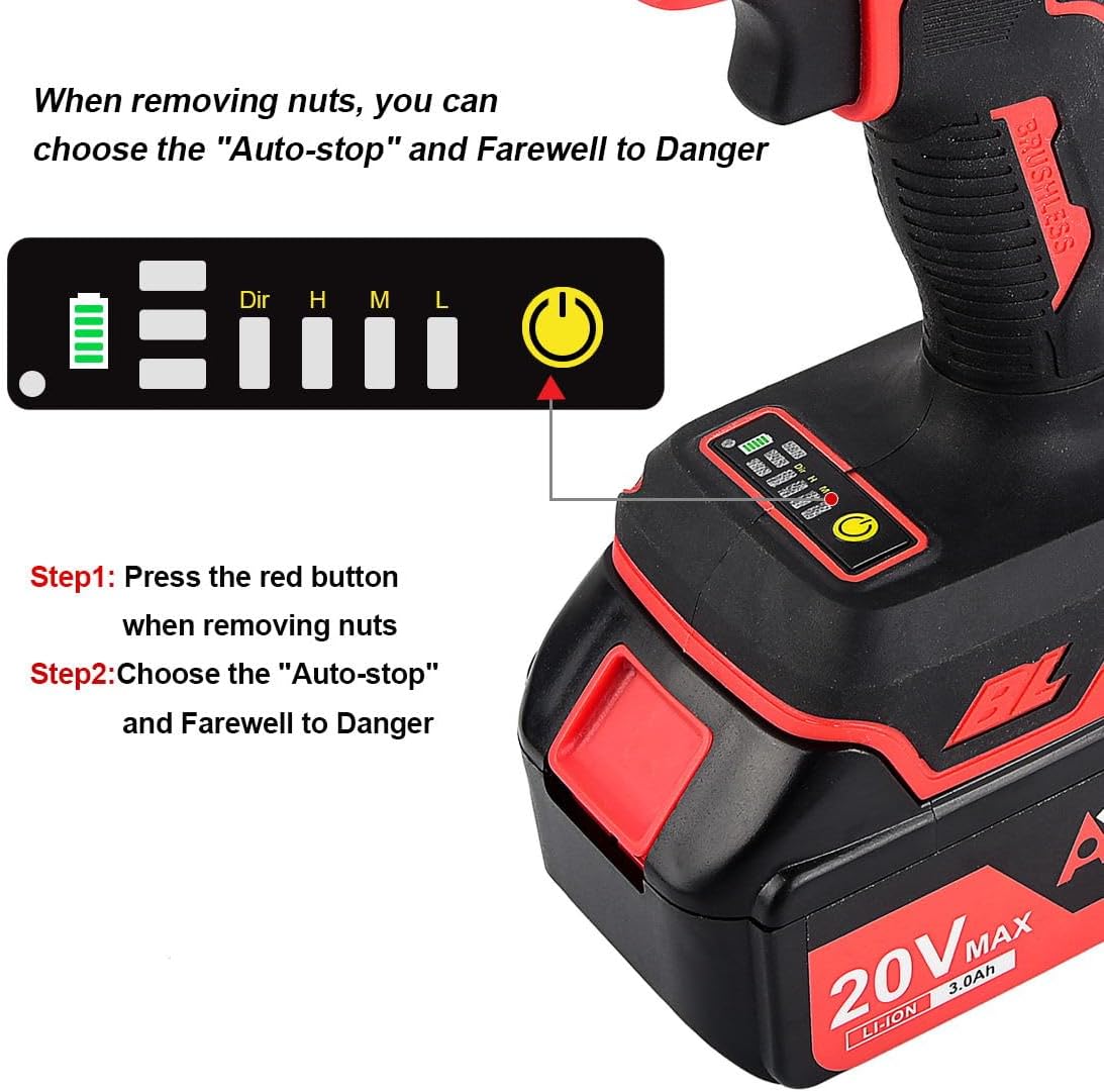 • "Auto-stop" function: When removing nuts, can choose the "Auto-stop" function to prevent the screw nut falling down. Attention:Please note If you do not need "Auto-stop" function, kindly press the red button, and then the tool will work continuously.