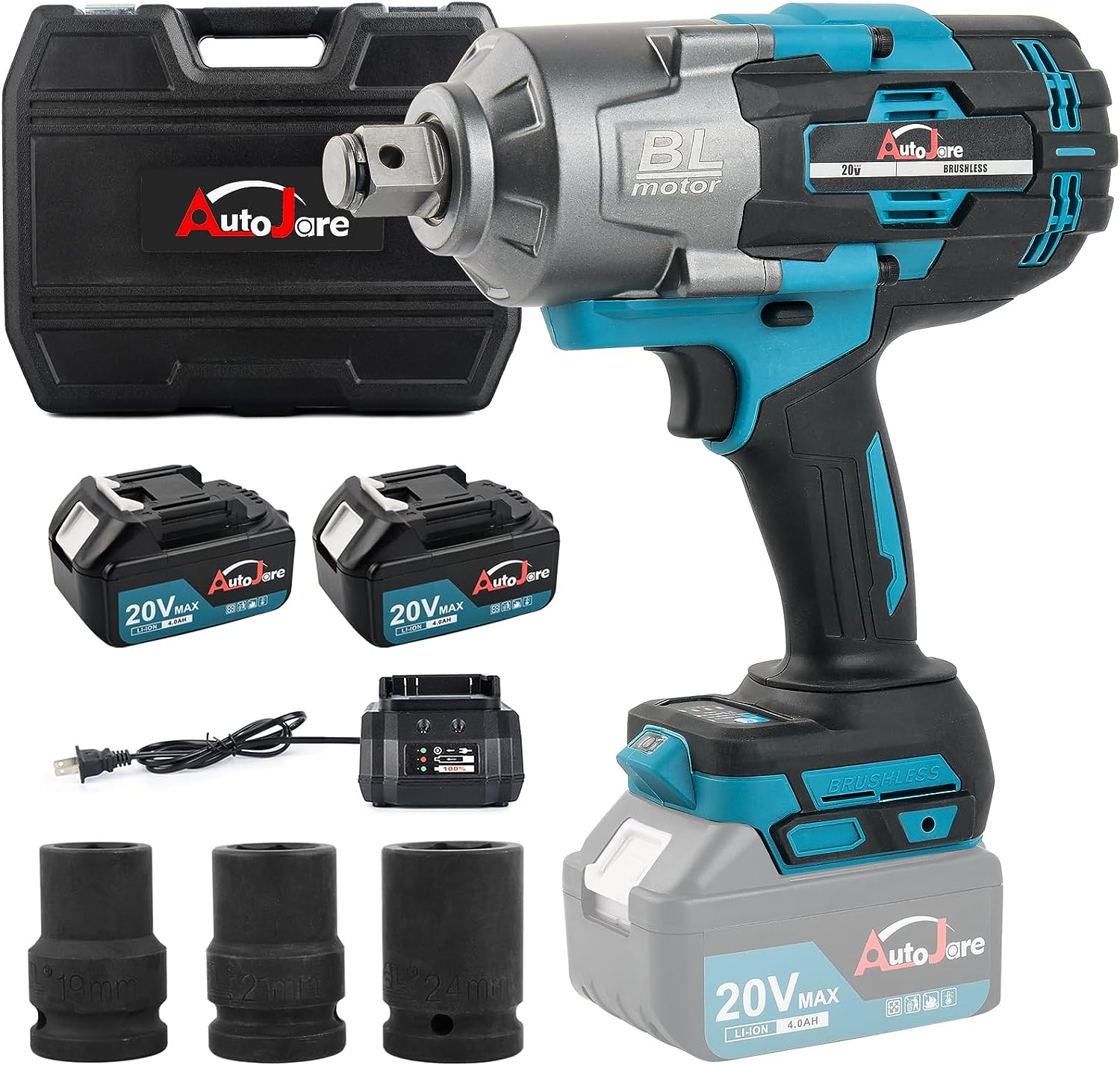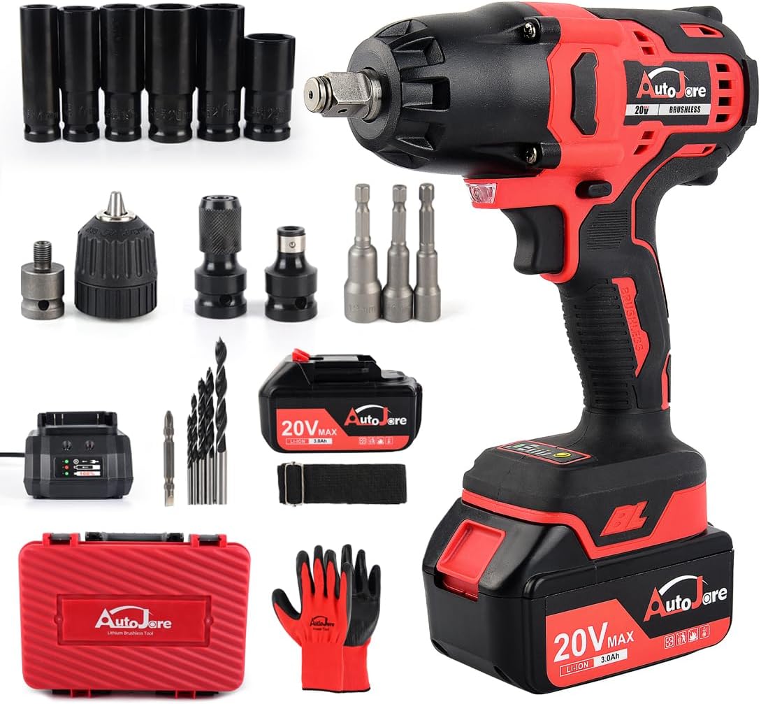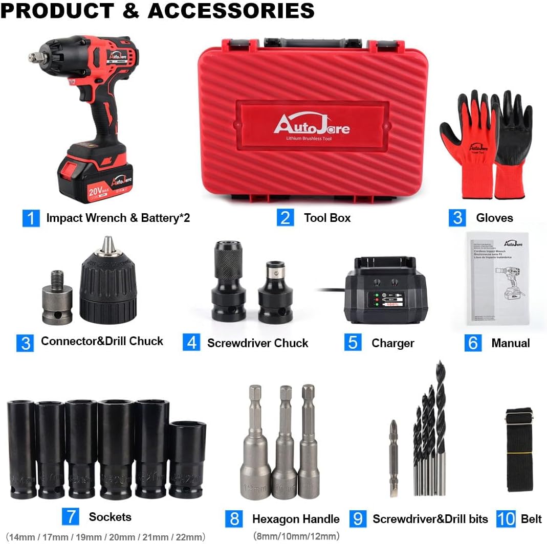 AUTOJARE Cordless Impact Wrench Kit 1/2 inch,Electric Powerful Brushless Motor 20V Max Rechargeable Lithium-Ion Battery with Charger 6pcs Sockets Cordless Wrench Kit