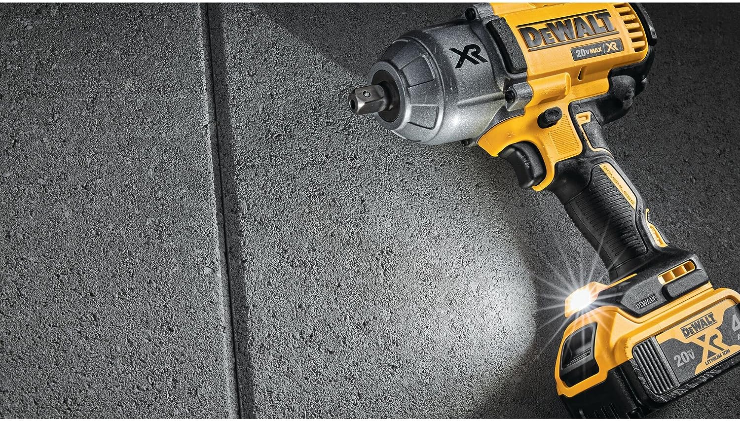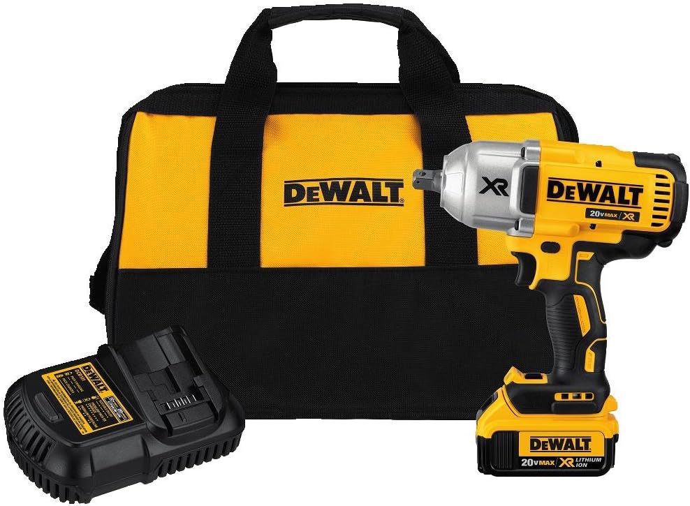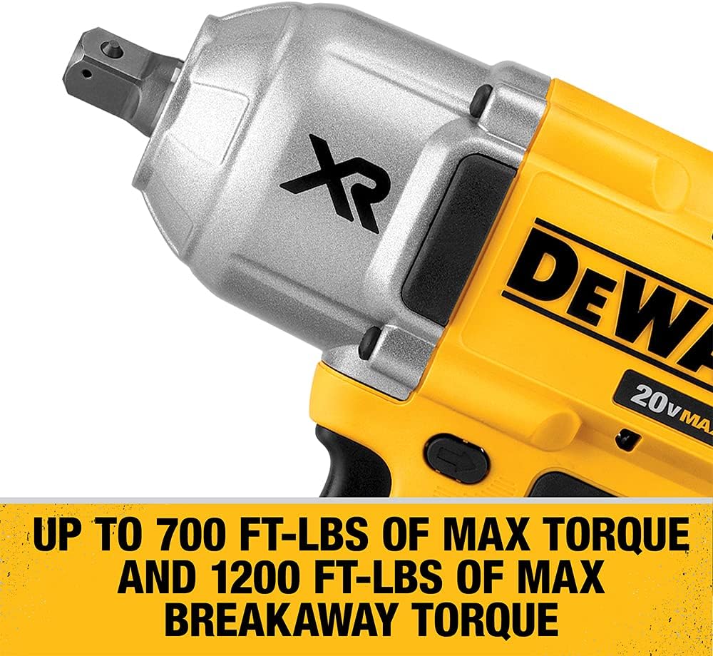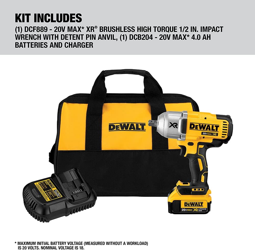The DEWALT DCF899M1 20v MAX XR Brushless High Torque 1/2-inch Impact Wrench with Dentent Pin Anvil (4.0 Ah) features up to 700 ftpounds of MAX Torque and 1200 ftpounds of MAX breakaway torque. This DEWALT impact wrench has a compact design of 8 13/16-inch in length and weighs only 7.2pounds for ease of use. It also has multi speed control for a variety of applications (0 400/1,200/1,900 RPM). A heavy duty 1/2-inch Anvil with detent pinch An LED light with 20 second delay allows for increased visibility in dark or tight workspaces. Includes: (1) DCF899 20v MAX XR Brushless High Torque 1/2-inch Impact Wrench with Dentent Pin Anvil, (1) 20V XR Lith Ion battery (4.0 Ah), (1) Fast Charger, (1) Tool bag.