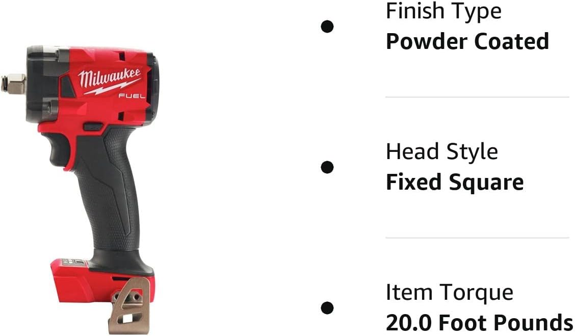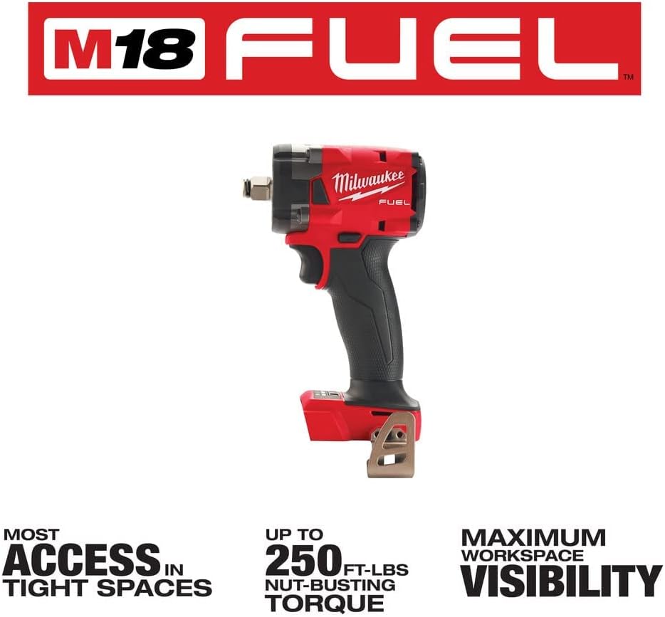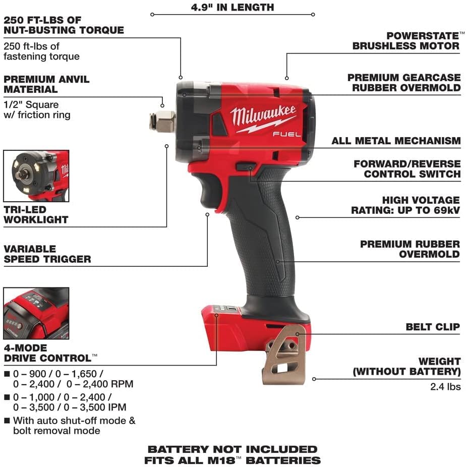 The MILWAUKEE M18 FUEL 3/8 in. Compact Impact Wrench w/ Friction Ring is the most compact in its class, delivering the most access in tight spaces, up to 250 ft-lbs. of nut-busting torque, and maximum workspace visibility. The Milwaukee cordless impact wrench measures only 4.9 in. in length with a POWERSTATE Brushless motor to provide the power to remove stubborn fasteners, even in confined spaces. The Milwaukee 3/8 in. in. impact wrench has tri-LEDs that surround the anvil to deliver brighter light with fewer shadows. 4-Mode DRIVE CONTROL offers greater precision with a range of pre-set RPM and IPM levels, selectable from a single button on the tool. By selecting Mode 4, AUTO SHUT-OFF control applies no more than 20 ft-lbs. of torque for hand-tight fastening applications to prevent overtightening. Mode 4 also features Bolt Removal Control delivers full torque output, then decreases RPM once the bolt is loosened to prevent fastener drops. REDLINK PLUS Intelligence electronics make these controls possible while ensuring maximum performance, protecting the tool against overloads, over-heating, and over-discharge. The included M18 REDLITHIUM 2 Ah Lithium-Ion battery fits M18 tools, delivering more work per charge and more work over the life of the pack. Auto Shut-Off mode provides 20 ft-lbs. of fastening torque, shutting the impact off once that torque spec is reached to prevent overtightening Rated for work in 69kV environments DRIVE CONTROL Speeds (RPM): 0-900 (Mode 1) / 0-1,650 (Mode 2) / 0-2400 (Mode 3) / 0-2400 (Bolt Removal Mode) DRIVE CONTROL Impacts (IPM): 0-1000 (Mode 1) / 0-2400 (Mode 2) / 0-3500 (Mode 3) / 0-3500 (Auto Shut-Off Mode) Compatible with all M18 REDLITHIUM batteries Includes: M18 FUEL 1/2 in. Compact Impact Wrench with Friction Ring (Tool Only) - 2855-20,Belt Clip,Batteries and Charger Sold Separately.