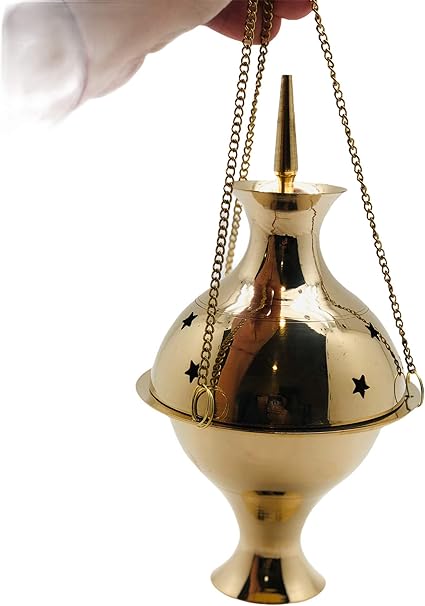 Brass Burning Hanging Censer, Charcoal Incense Burner, Censer Incense Burner, Censer Incense Burner with Chains 7" High and 3.5" Diameter (Incense Burner)