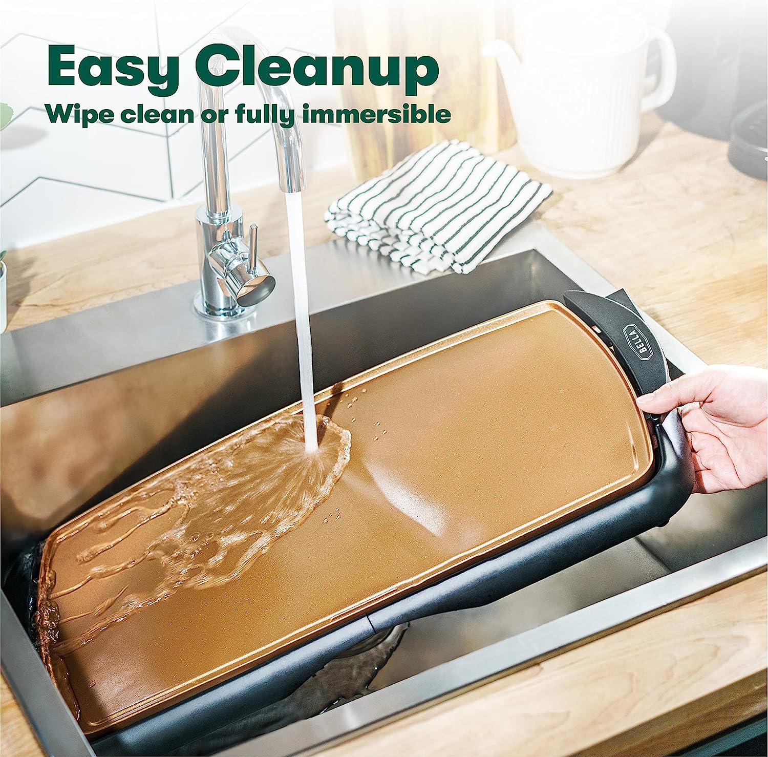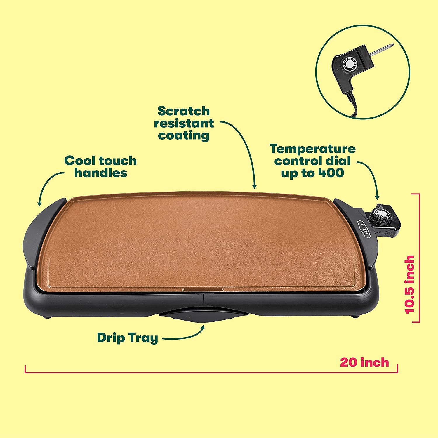 Whip up breakfast for the whole gang or grill your favorite meats, all with one simple turn of a knob. This BELLA Griddle with Copper Ceramic Titanium Coating allows you to go from keep warm to 400 degrees giving you the option to cook virtually anything you would cook on a stove while using less energy. This versatile cooking surface is BPA Free and features specialized Copper Titaniun non-stick coating which is highly durable and cooks faster than the traditional coatings. Safer than a stove, this unit has heat protection so you never have to worry about over heating. Not to mention, it is super easy to clean. Fully immersible in water, simply toss the cooking plate in sink for ultra easy cleaning