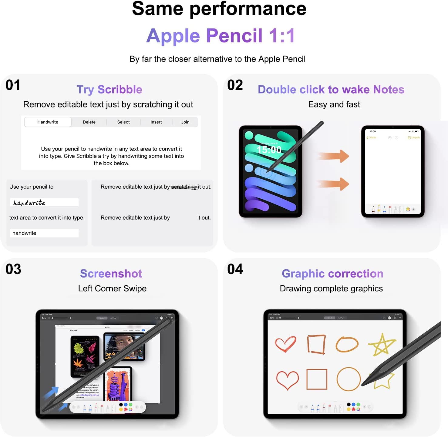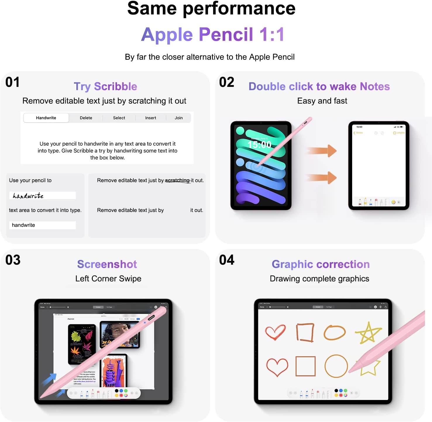 • 【Stable & Easy To use】This ipad pencil uses a physical button, so there is no accidental on/off compared to other touch switches. Turn on this stylus pen by clicking the touch button on the top of the pen for 1s. One click return to the main screen, double-click back to the APP selection page. The ipad pen automatically turns off when not used for 10 minutes.