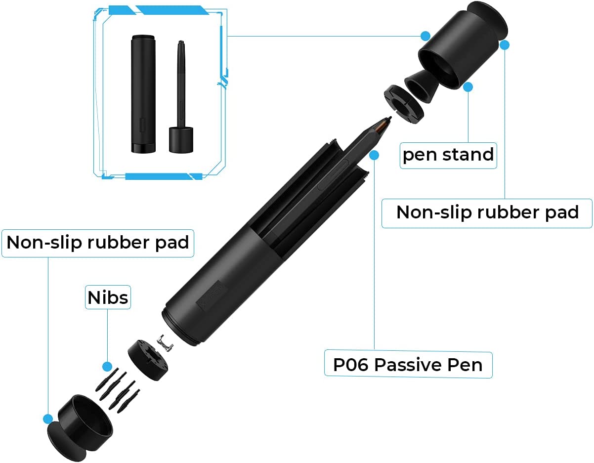 • Battery-free stylus with a digital eraser at the end: XP-PEN advanced P06 passive pen was made for a traditional pencil-like feel! Featuring a unique hexagonal design, non-slip & tack-free flexible glue grip, partial transparent pen tip, and an eraser at the end! Delivering technical sense, high efficiency, with a fashionable and comfortable grip, and there are 8 replacement pen nibs included with the multi-function pen holder