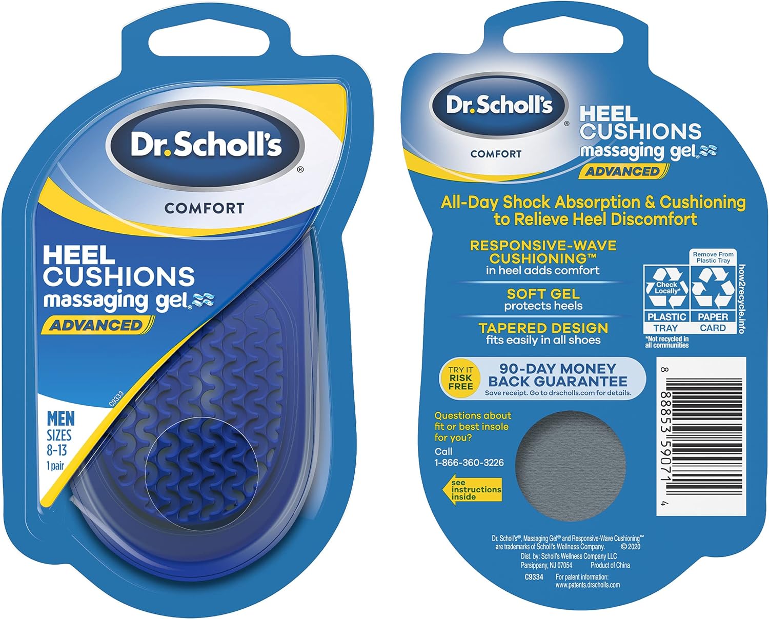 We designed Dr. Scholl’s Comfort Heel Cushions especially for people who experience discomfort in their heels and want extra cushioning. Built with Massaging Gel Technology, they provide all day cushioning. The package contains one pair of gel cushions to fit men's shoe sizes 8-13. Dr. Scholl's has been a trusted brand in foot care since 1904 when Dr. William Mathias Scholl, grandson of a cobbler, launched the company under the name Dr. Scholl Inc.
