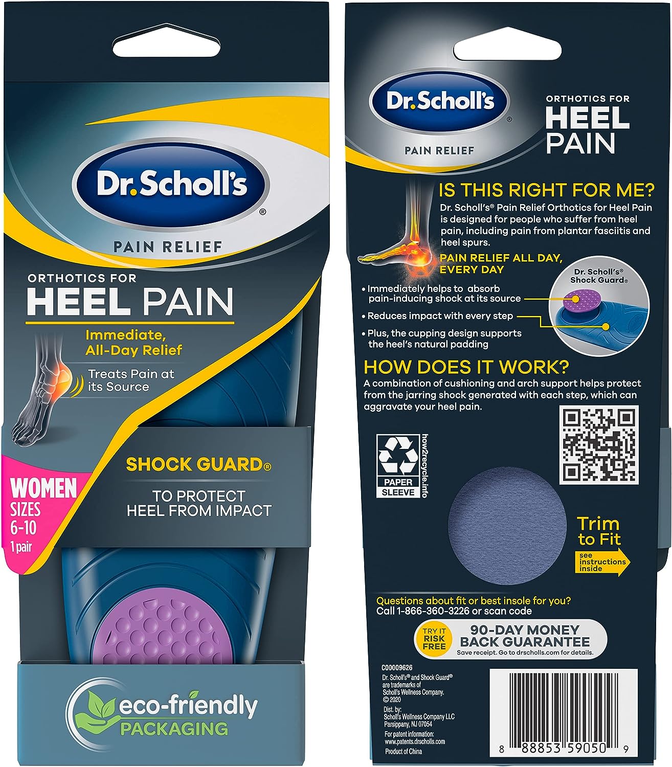 We designed Dr. Scholl’s Pain Relief Orthotics for Heel Pain specifically for people who suffer from heel pain, including pain from plantar fasciitis and heel spurs. They have Shock Guard Technology to treat pain at the source, so you can feel immediate and all-day relief. The package contains one pair of insoles to fit women's shoe sizes 5-12. Dr. Scholl's has been a trusted brand in foot care since 1904 when Dr. William Mathias Scholl, grandson of a cobbler, launched the company under the name Dr. Scholl Inc.