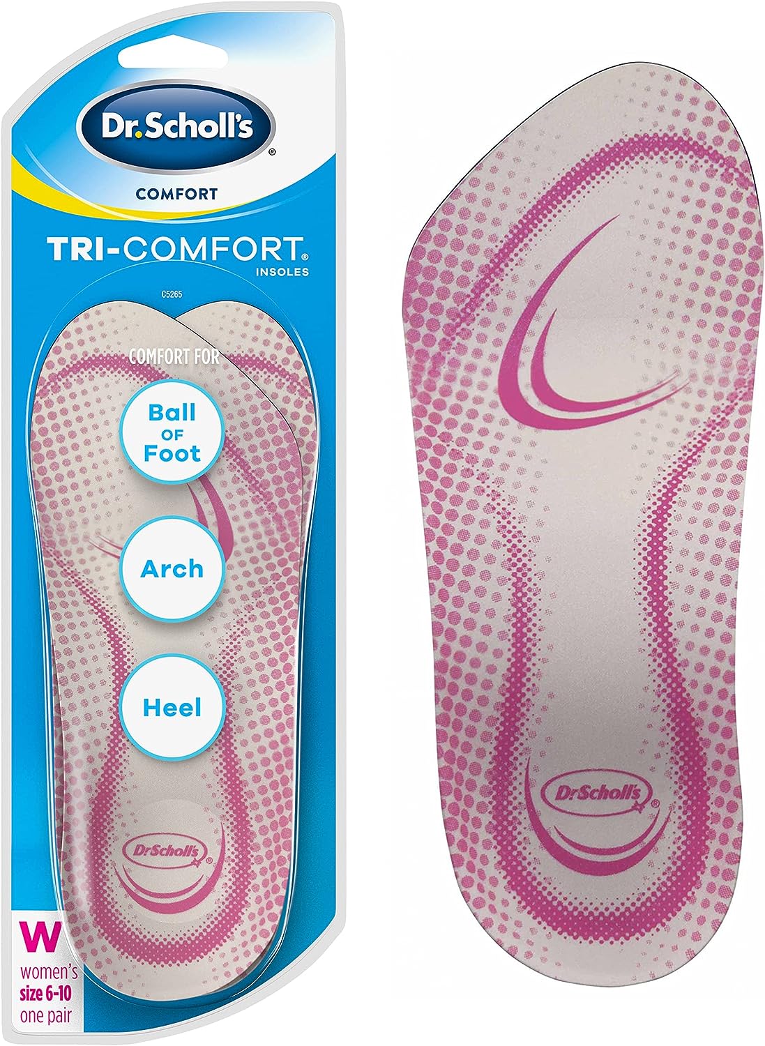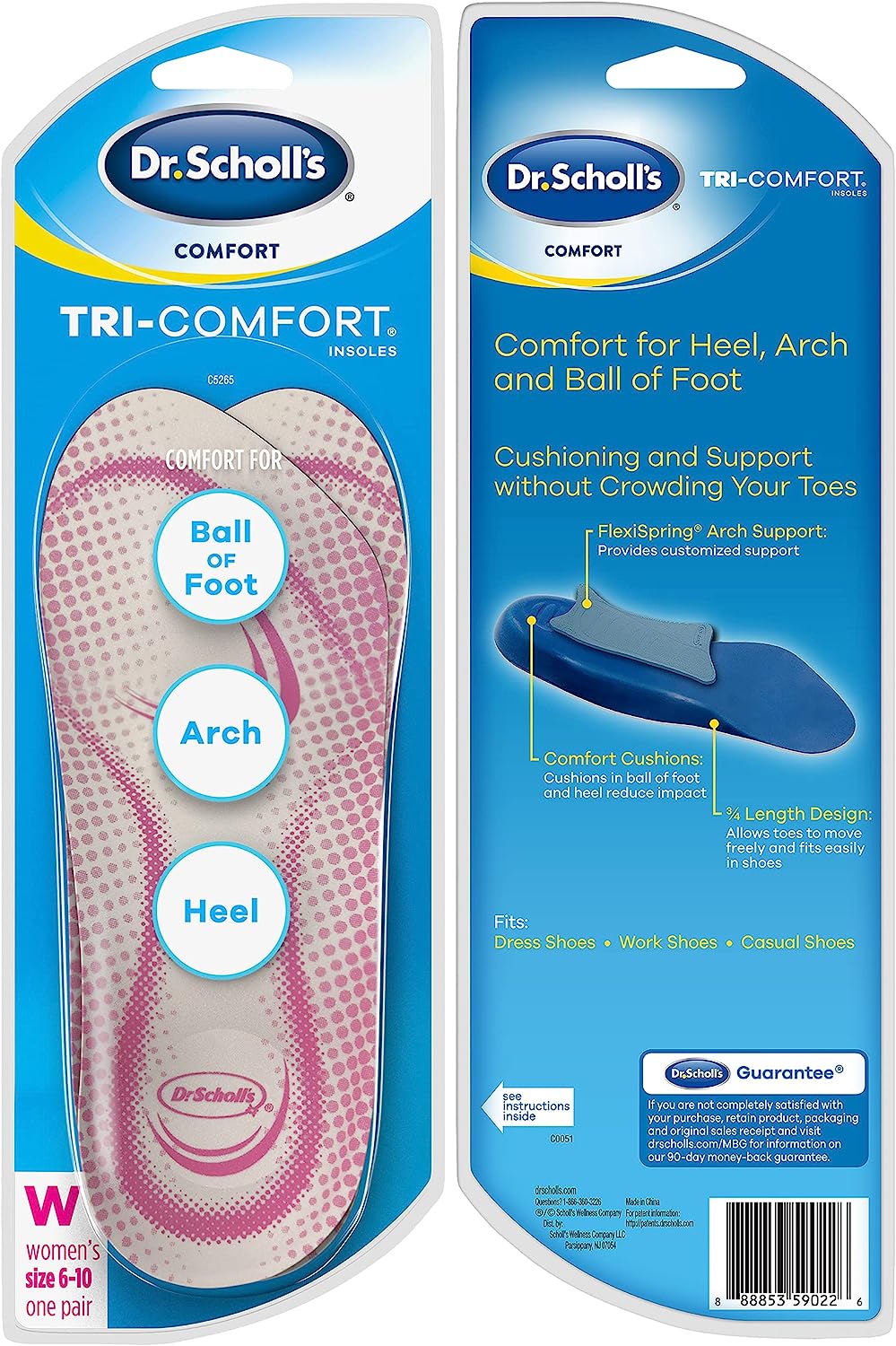 We designed Dr. Scholl’s Comfort Tri-Comfort Insoles especially for people whose feet experience discomfort during the day. Designed to provide comfort for the heel, arch and ball of foot. The package contains one pair of insoles to fit women's shoe sizes 6-10. Dr. Scholl's has been a trusted brand in foot care since 1904 when Dr. William Mathias Scholl, grandson of a cobbler, launched the company under the name Dr. Scholl Inc.