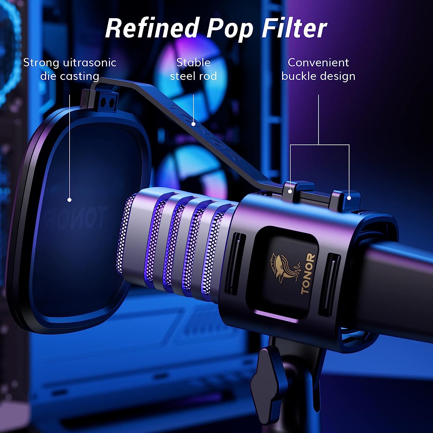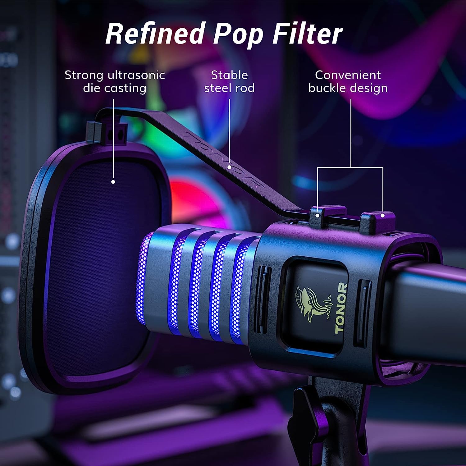 • Strong Arm Stand: Included adjustable boom arm stand provides great flexibility when gaming or podcasting. The double layer pop filter of this podcast microphone effectively filters and minimizes popping and cracking sounds caused by air flow impact.