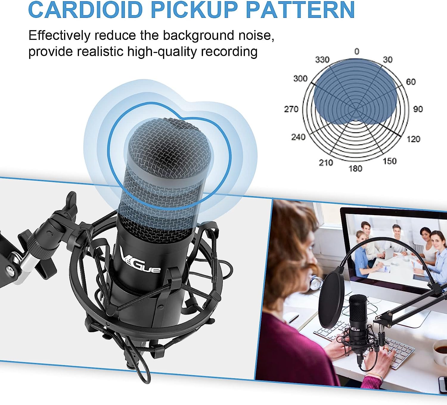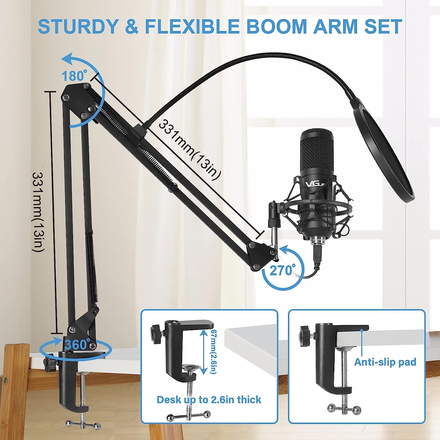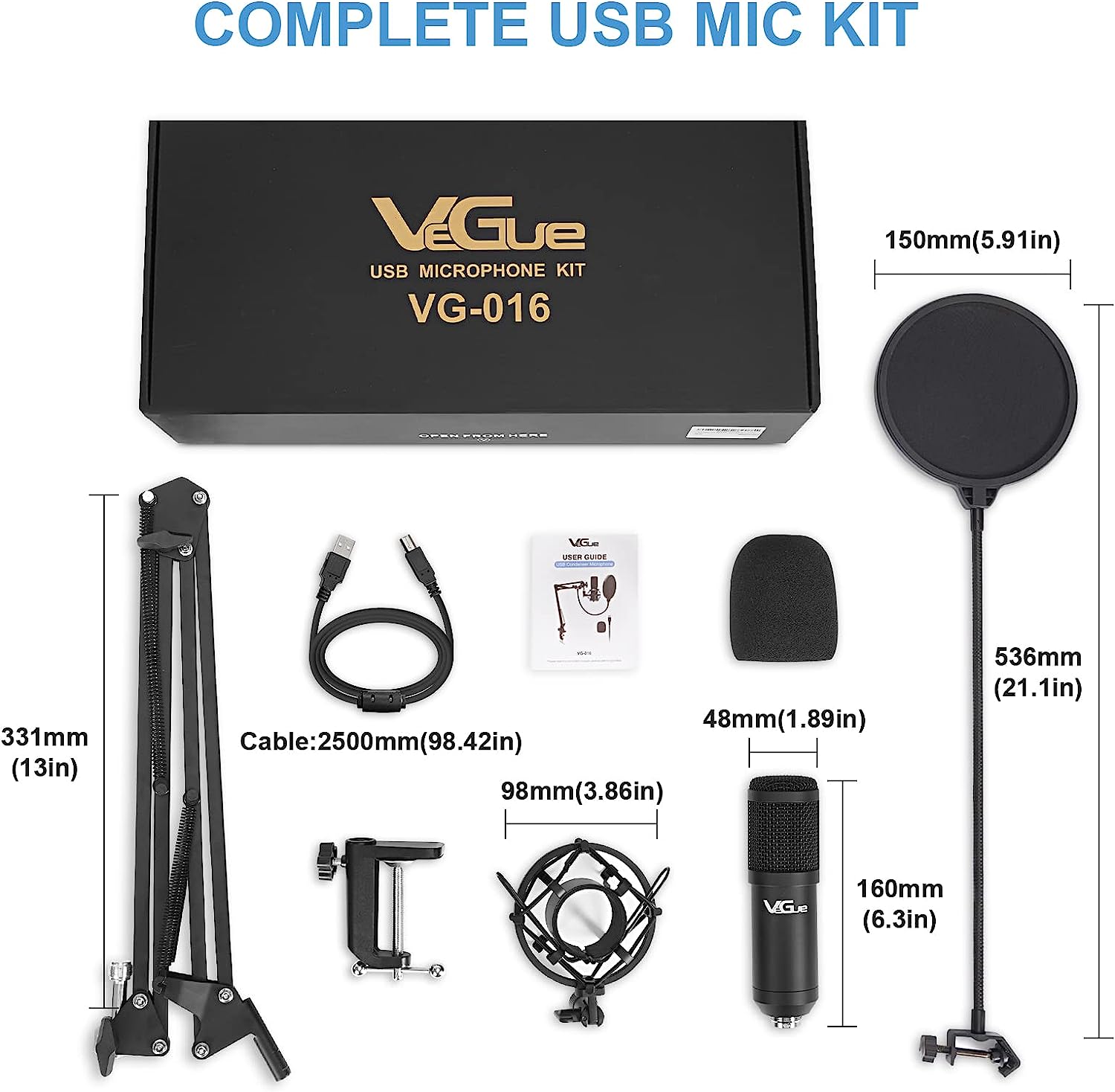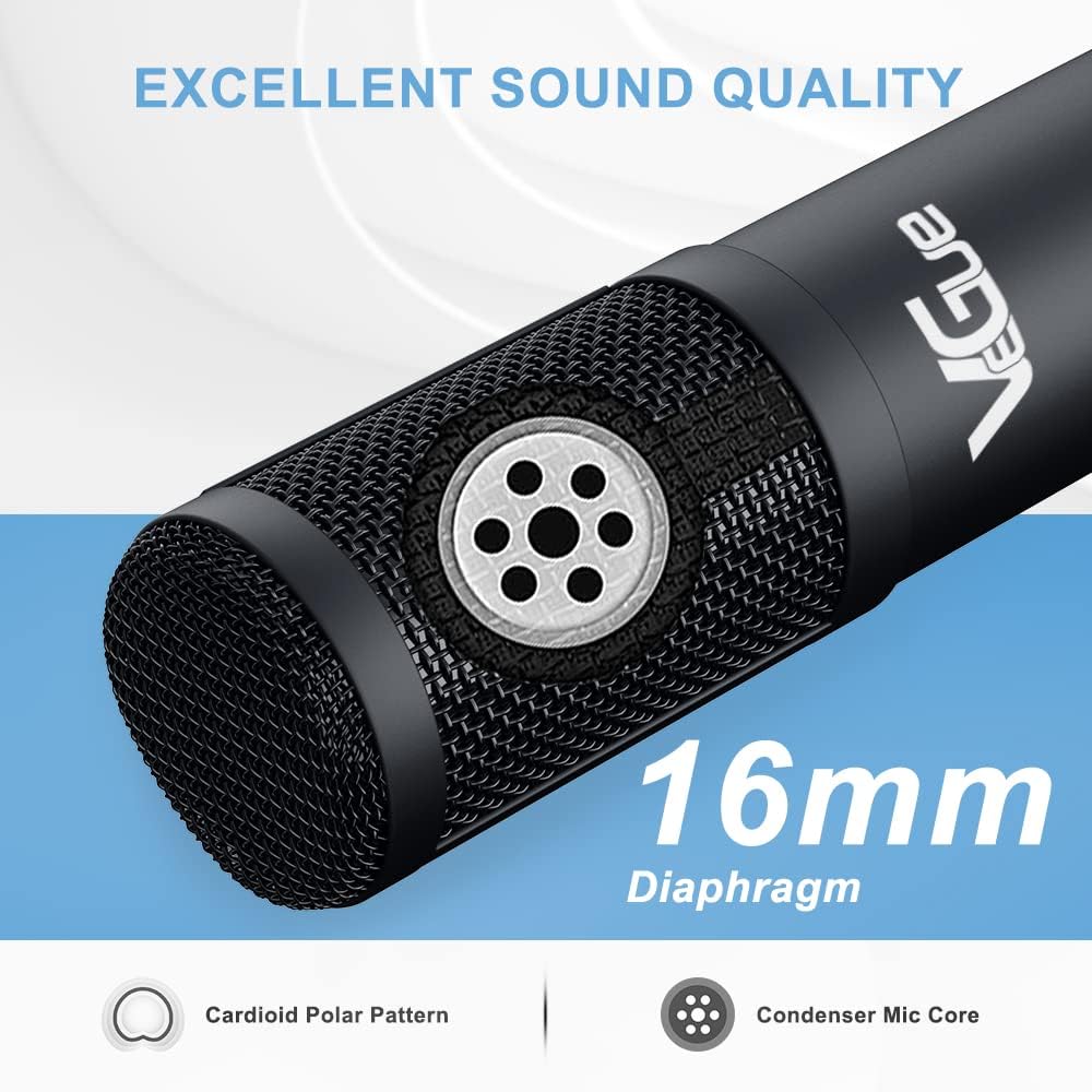 • COMPLETE VEGUE USB MICROPHONE KIT: Package includes 1 x usb condenser microphone, 1 x extended boom arm, 1 x metal shock mount, 1 x desk clamp, 1 x pop filter, 1 x mic cover, 1 x 8.2FT USB cable and 1 x manual. All premium accessories are contained in one package, which makes the microphone with boom arm to be your best choice.