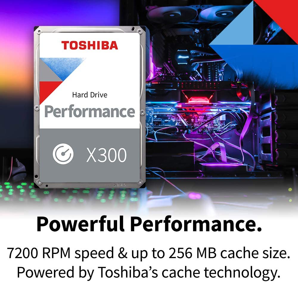 The Toshiba X300 Performance Internal Hard Drive is designed for professional systems, home media computers, and gaming PCs. The X300 Hard Drive offers 7200 RPM, large cache size, and Toshiba Cache Technology to take your gaming to the next level along with massive capacity to store your growing gaming library. Plus, the X300 comes with data protection technologies to help mitigate vibrations and improve tracking accuracy all of which means more reliability than ever for backing up your digital content. Put the extreme performance, capacity, and reliability of the Toshiba X300 Performance Internal Hard Drive behind your game and graphics intensive projects. [Note]: (1) One Terabyte (1TB) means 10{12] = 1,000,000,000,000 bytes using powers of 10. Actual formatted storage capacity may vary. For details, please visit Toshiba's Consumer HDD website. (2) Compatibility may vary depending on user’s hardware configuration & operating system. (3) Product specifications, colors, configurations and components are subject to change without notice. (4) "2.5-inch" & "3.5-inch" mean the form factor of HDDs. They do not indicate drive's physical size. (5) For "Drive Bays Supported", please contact your Solutions Provider as compatibility with host device will vary based on the system. (6) Workload is a measure of the data throughput of the year, and it is defined as the amount of data written, read or verified by commands from the host system. (7) MTTF (Mean Time to Failure) is not a guarantee or estimate of product life; it is a statistical value related to mean failure rates for a large number of products which may not accurately reflect actual operation. Actual operating life of the product may be different from the MTTF. (8) Read and write speed may vary depending on the host device, read and write conditions, and file size. (9) Drive life may vary depending on usage and workload. (10) Standard limited warranty terms apply. The warranty brochure can be viewed at Toshiba's Consumer HDD website.