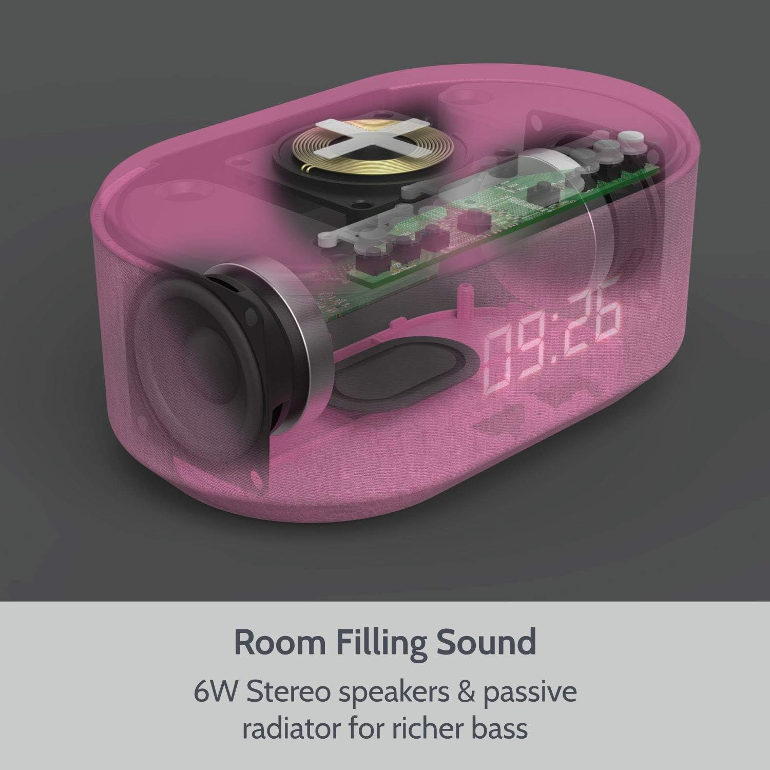 i-box Bedside Radio Alarm Clock with USB Charger, Bluetooth Speaker, QI Wireless Charging, Dual Alarm Dimmable LED Display (Grey)