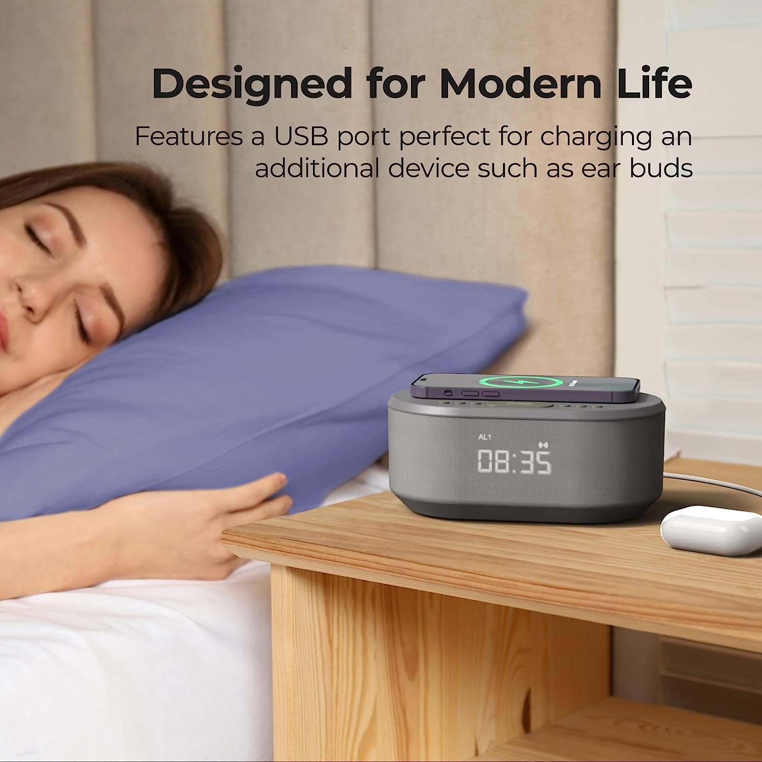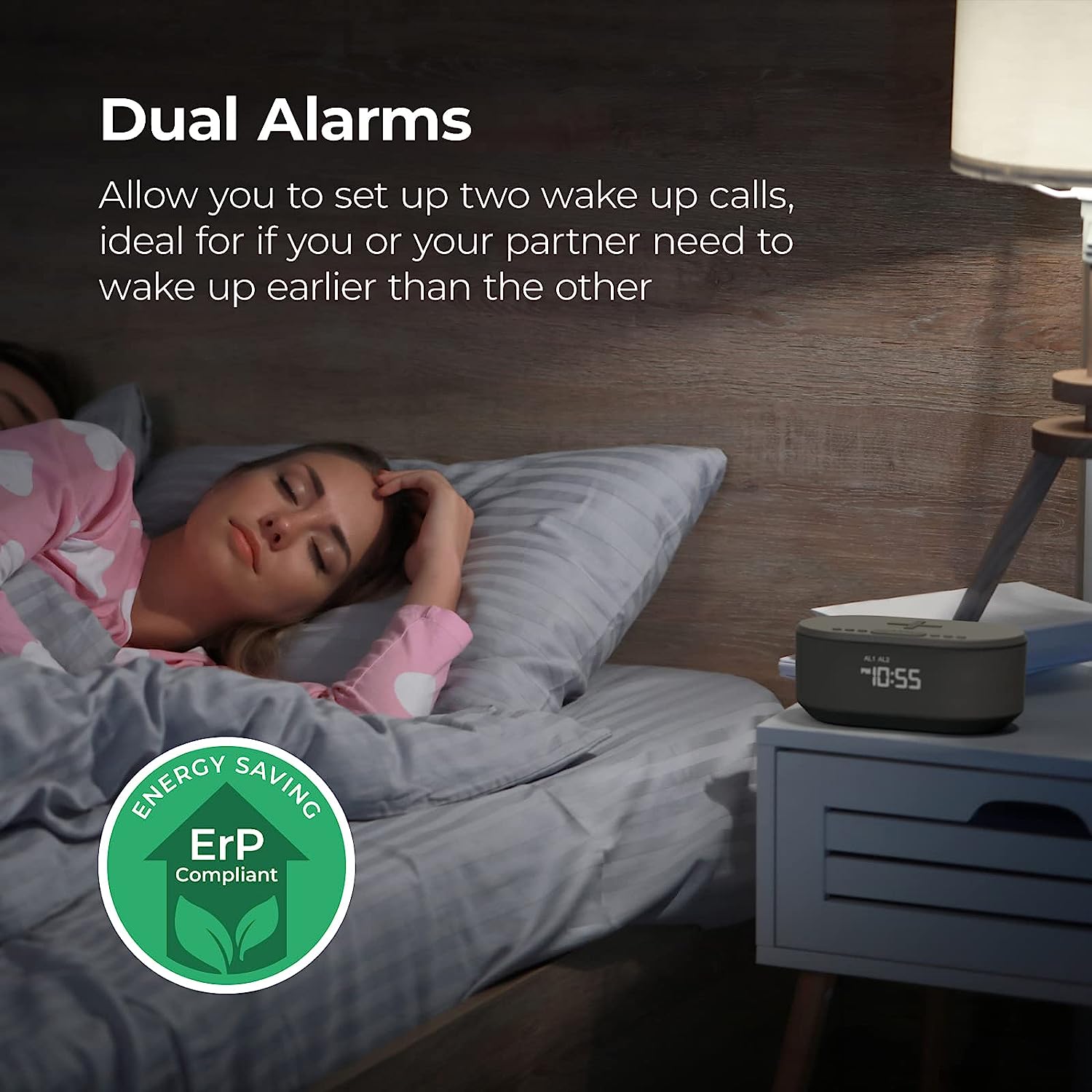 • ✔️ STYLE AND FUNCTION: The Dawn Bedside Alarm Clock combines premium materials with its soft touch top face and fabric wrap surround to look amazing in any setting whether in the bedroom or on a kitchen counter. This all in one solution is the perfect bedside hub for all of you needs