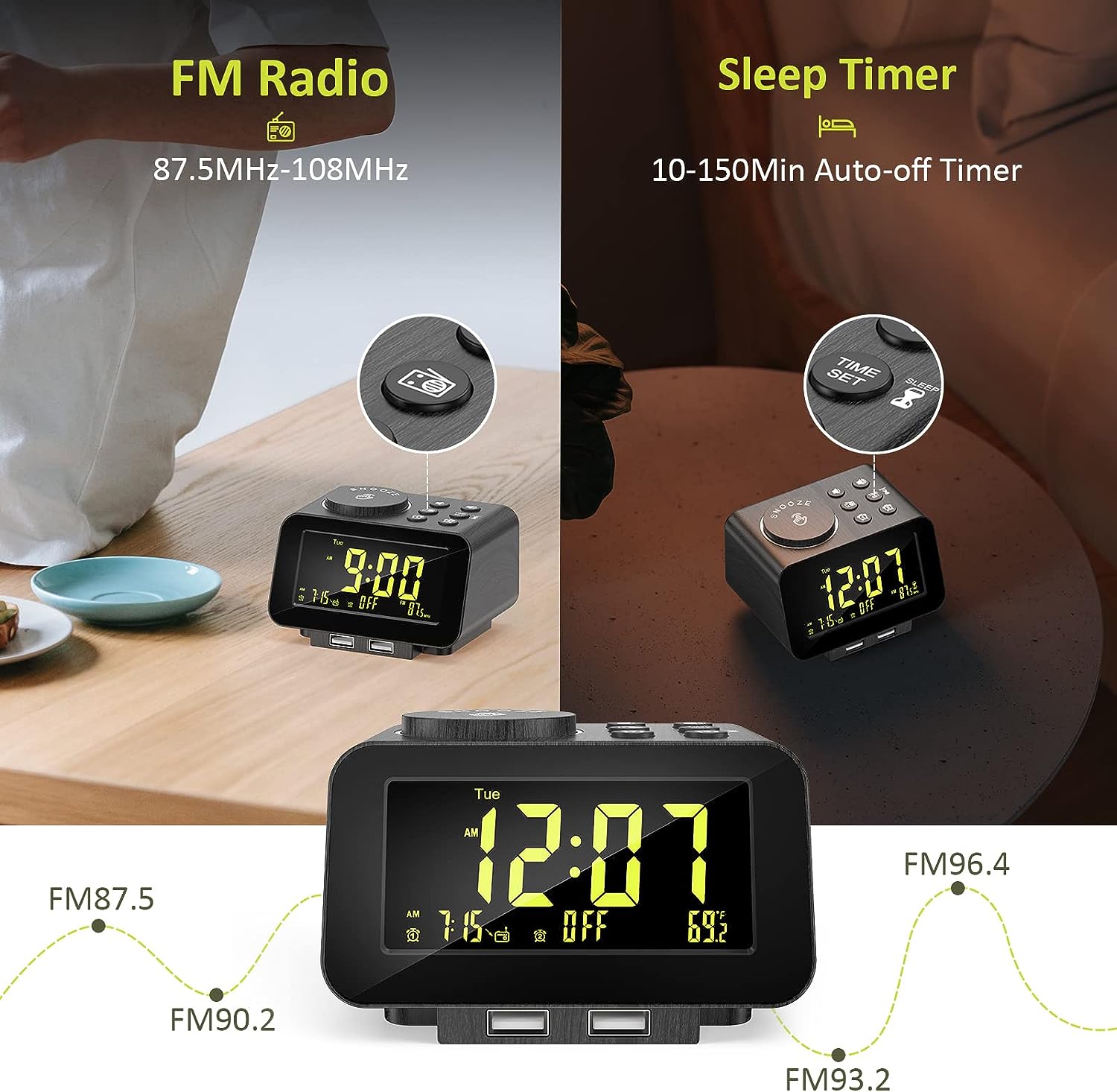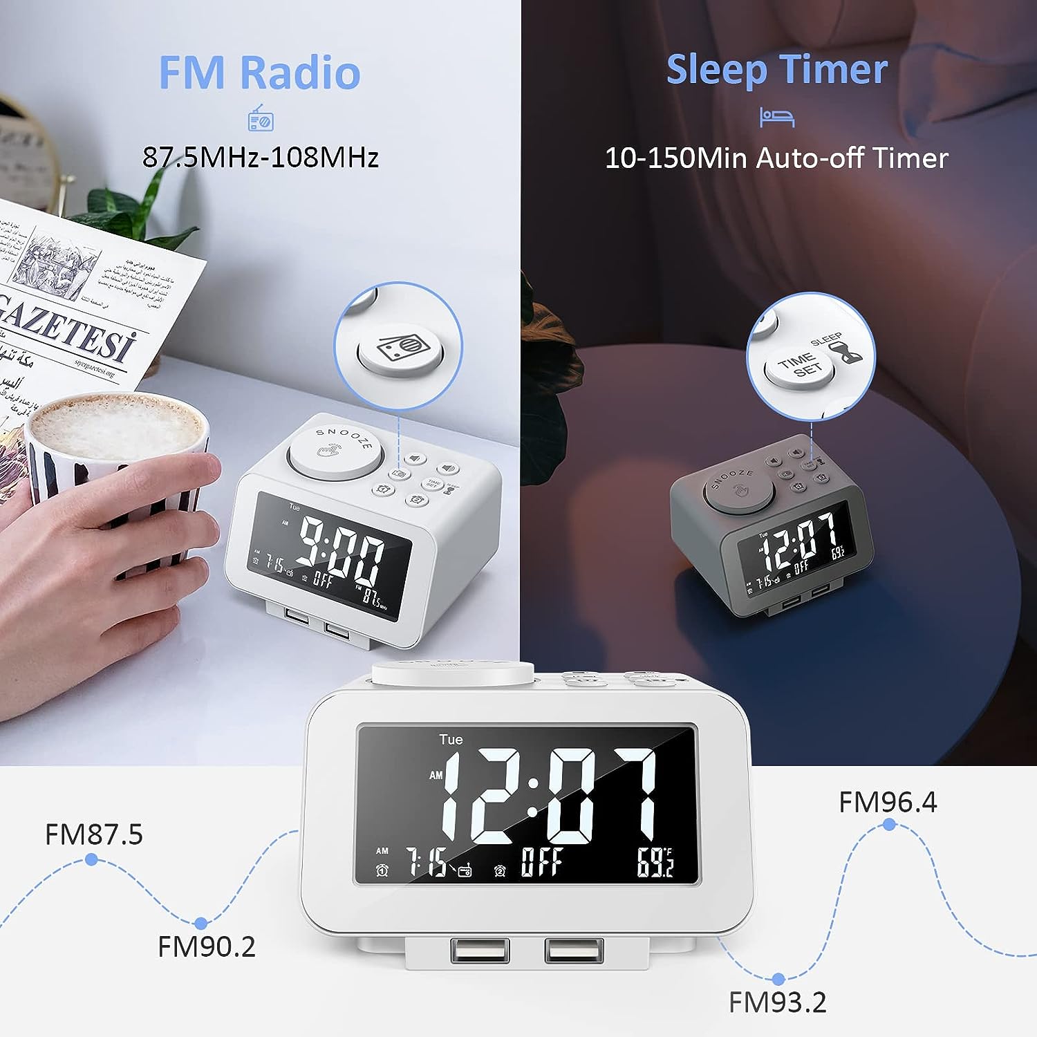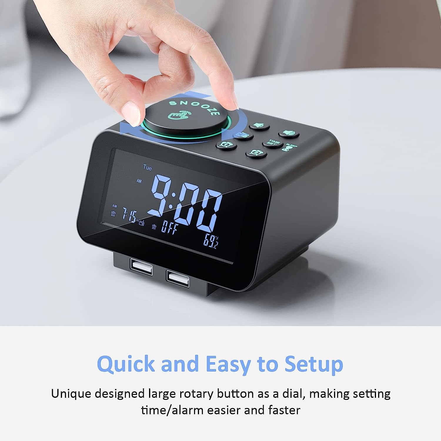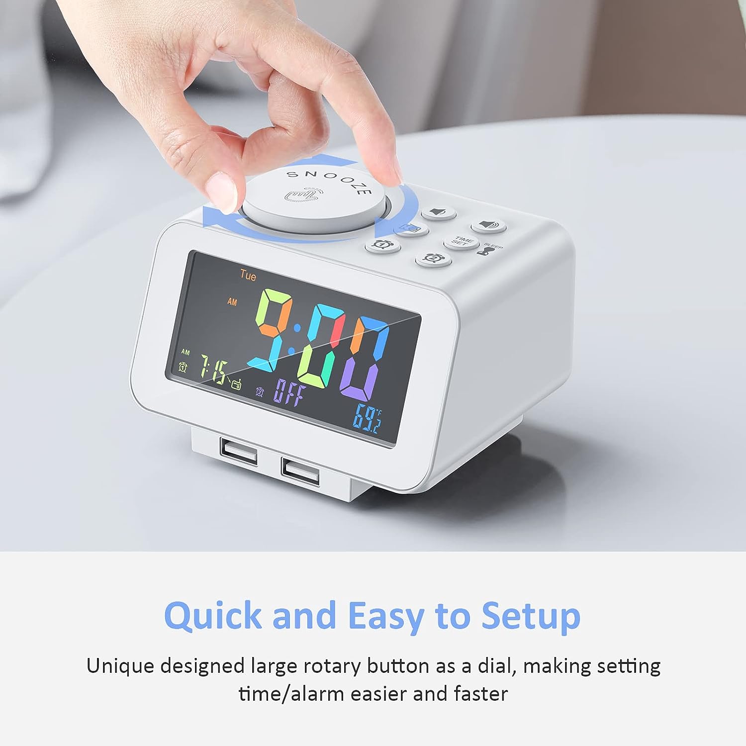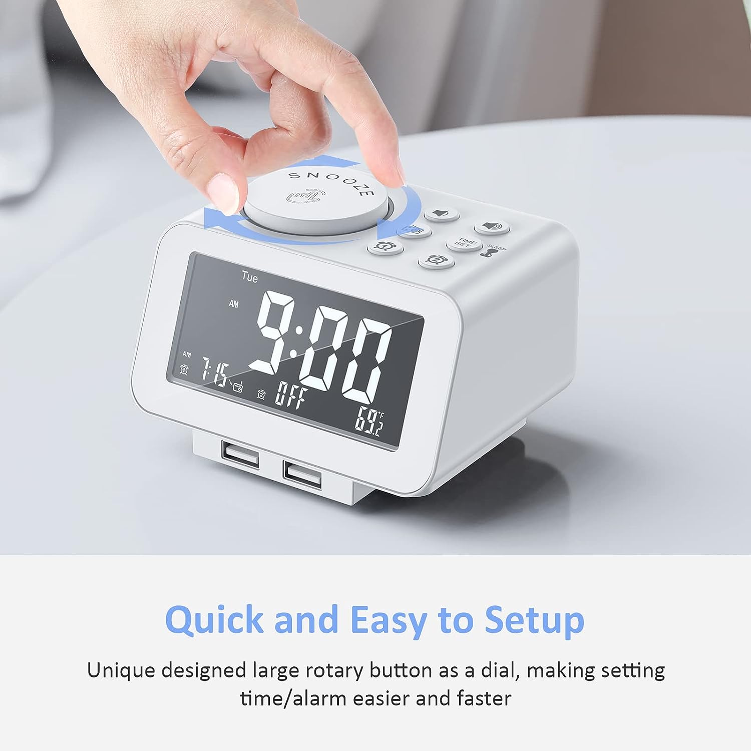 • MORE THAN JUST AN ALARM - FM radio saves up to 40 stations, and the sleep timer function (10-150min) offers the luxury to fall asleep with your favorite station playing. 3.5mm headphone jack comes handy not disturbing others nearby. 2 USB ports will charge your phone or other mobile devices while you sleep. (Headphones and charging cable NOT included).