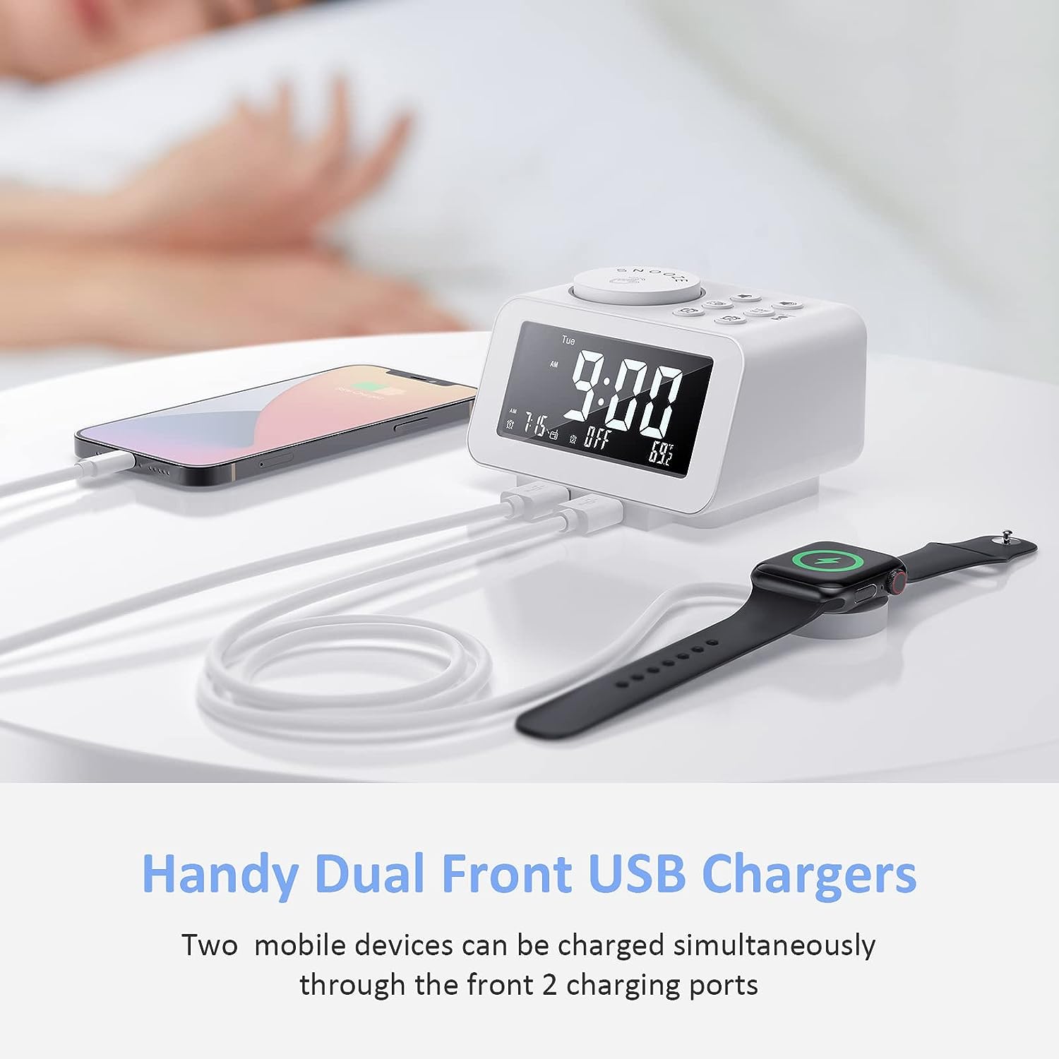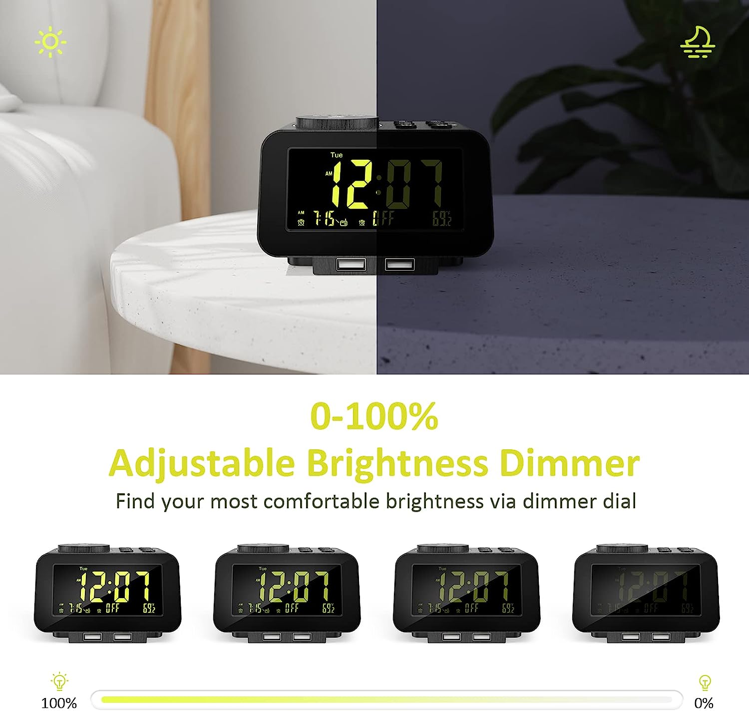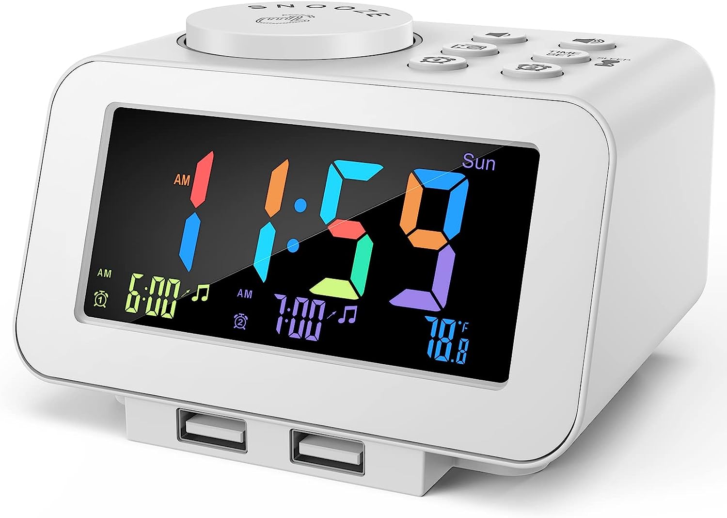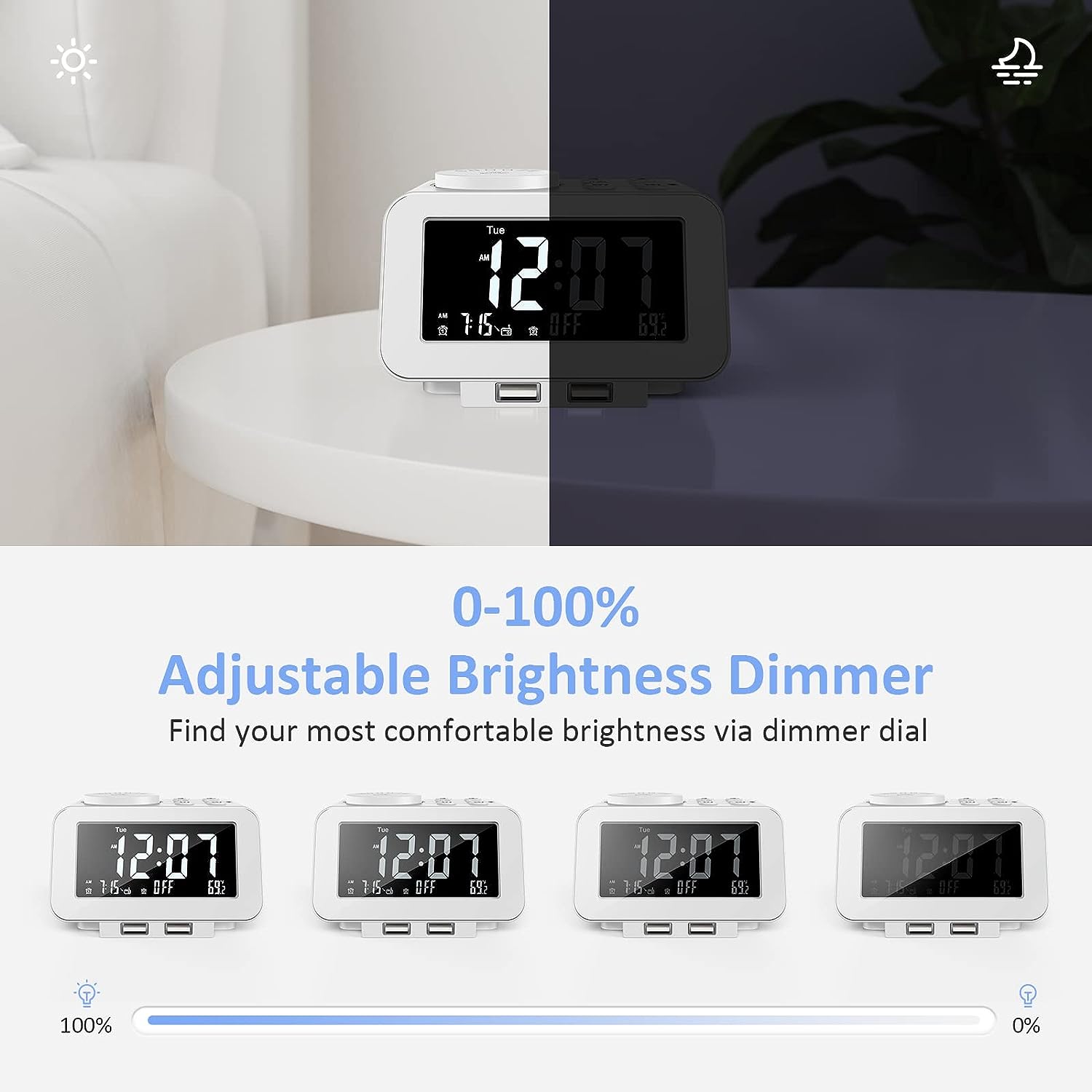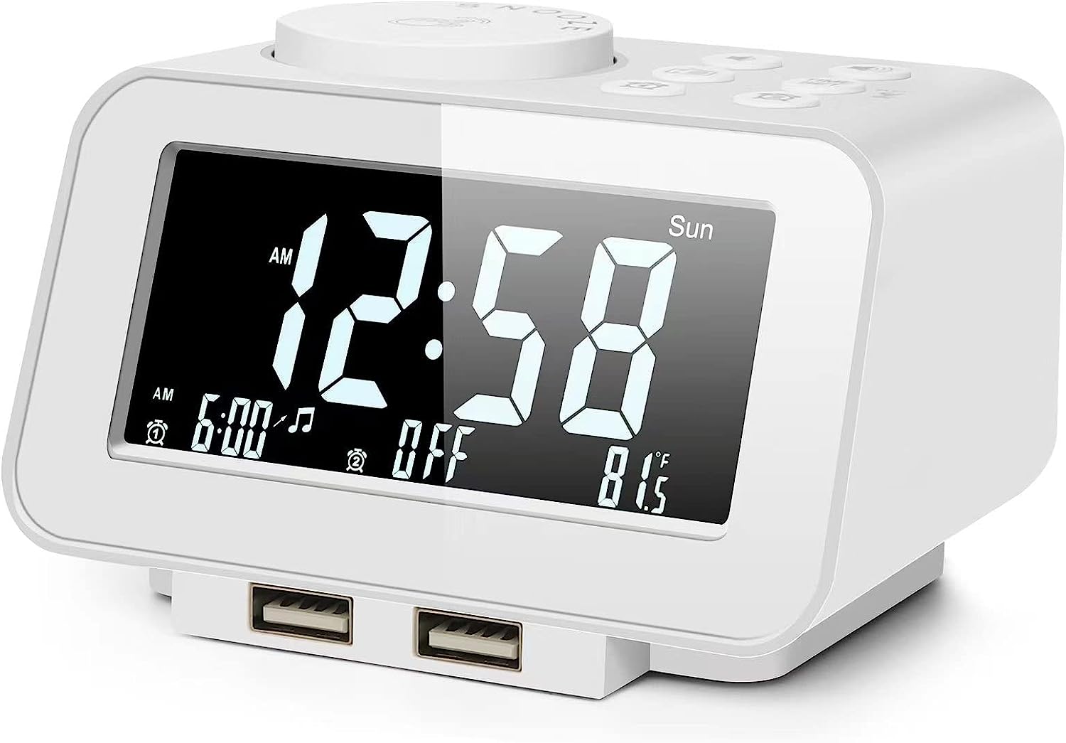 • MORE THAN JUST AN ALARM - FM radio saves up to 40 stations, and the sleep timer function (10-150min) offers the luxury to fall asleep with your favorite station playing. 3.5mm headphone jack comes handy not disturbing others nearby. 2 USB ports will charge your phone or other mobile devices while you sleep. (Headphones and charging cable NOT included).