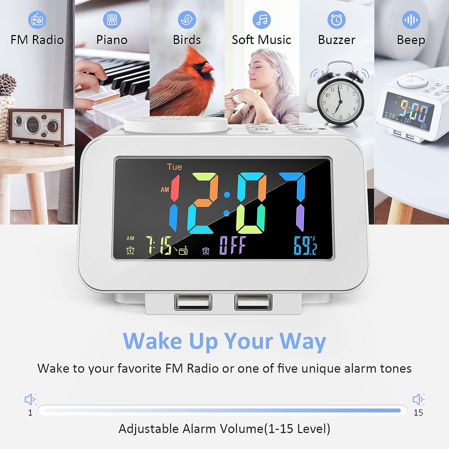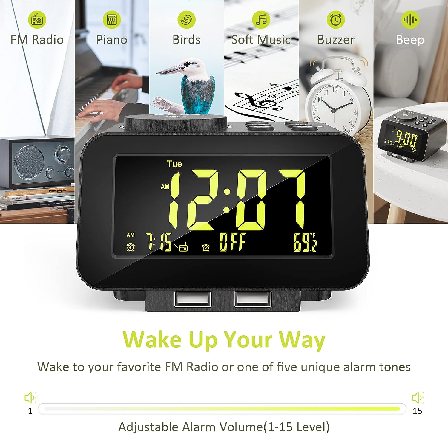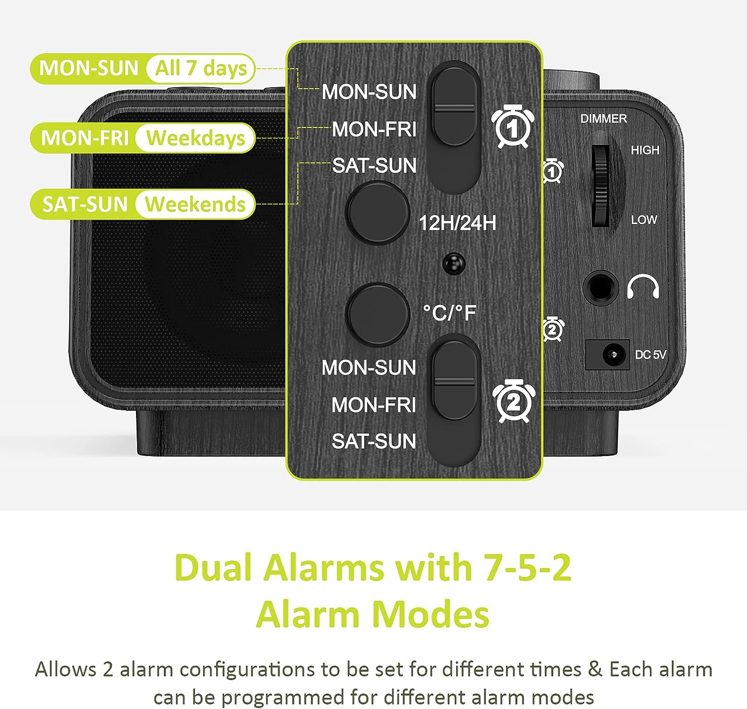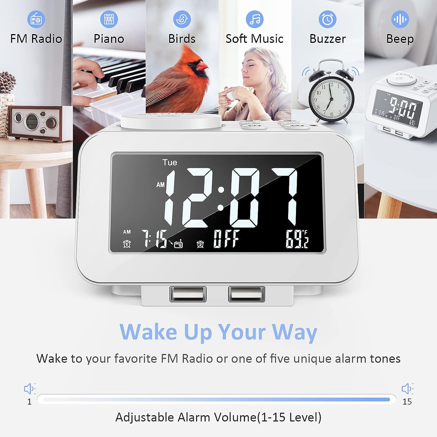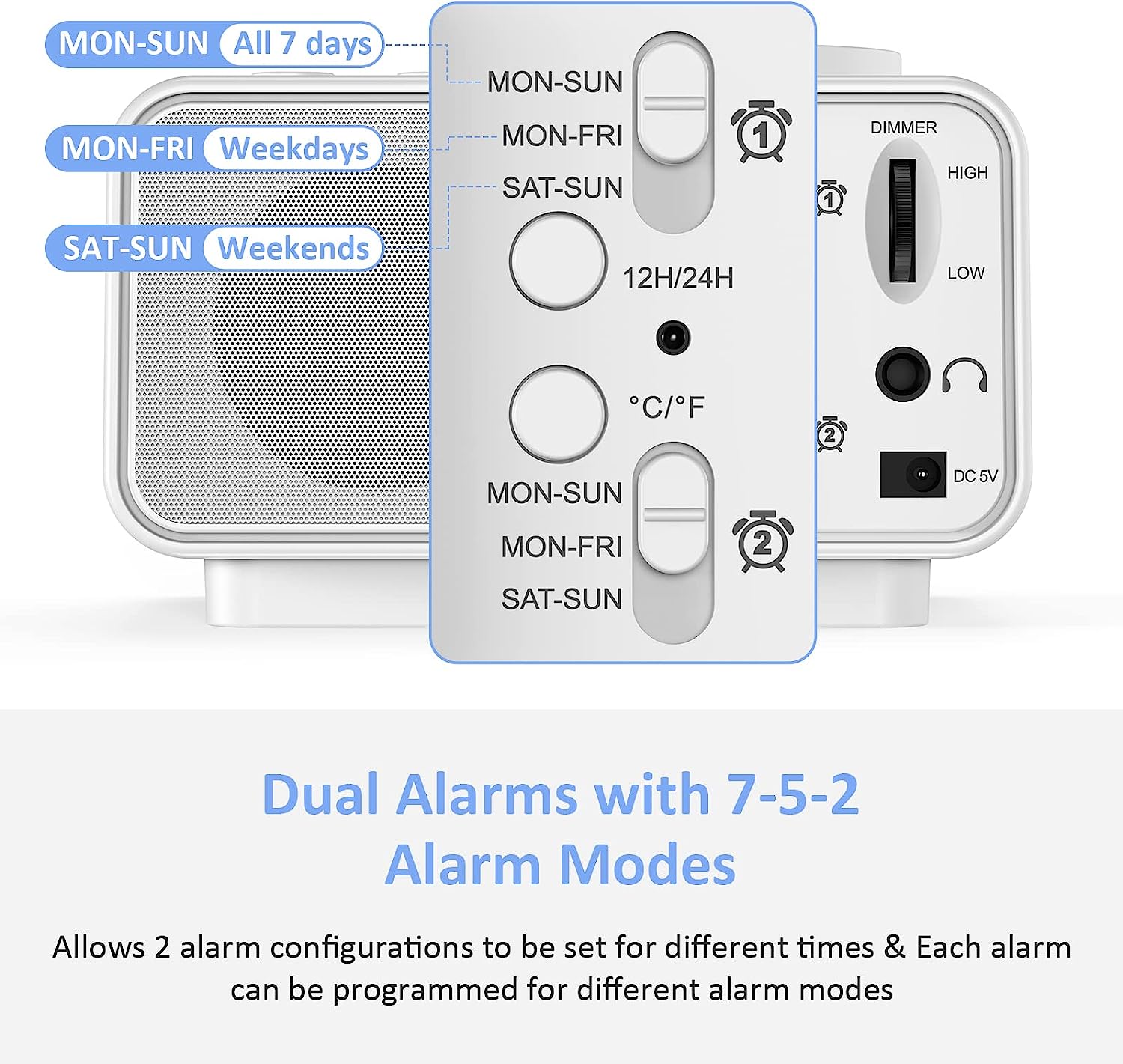 • CUSTOMIZABLE ALARM - Dual alarms with separate weekend/weekday/all-7-day mode satisfy the needs of everyone and every family. You may choose one of the 5 built-in tones (Beep/Piano/Buzzer/Bird/Soft Music) or radio as wake up sound, which gradually increases in volume from gentle to the level you set (options from level 1 to 15). Snooze allows extra 9 minutes of slumber.