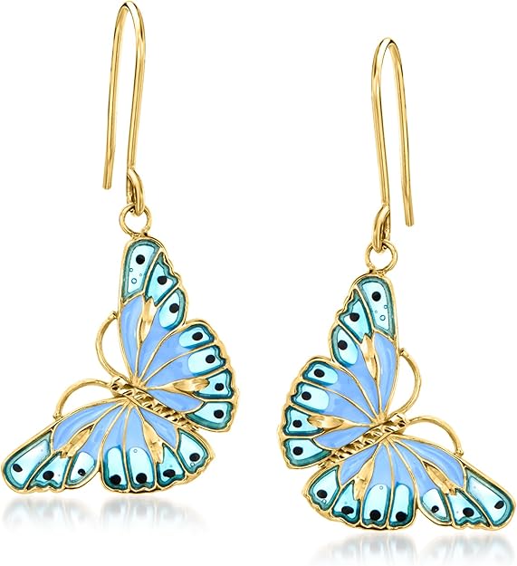 Ross-Simons Italian Tonal Blue Enamel Butterfly Drop Earrings in 14kt Yellow Gold