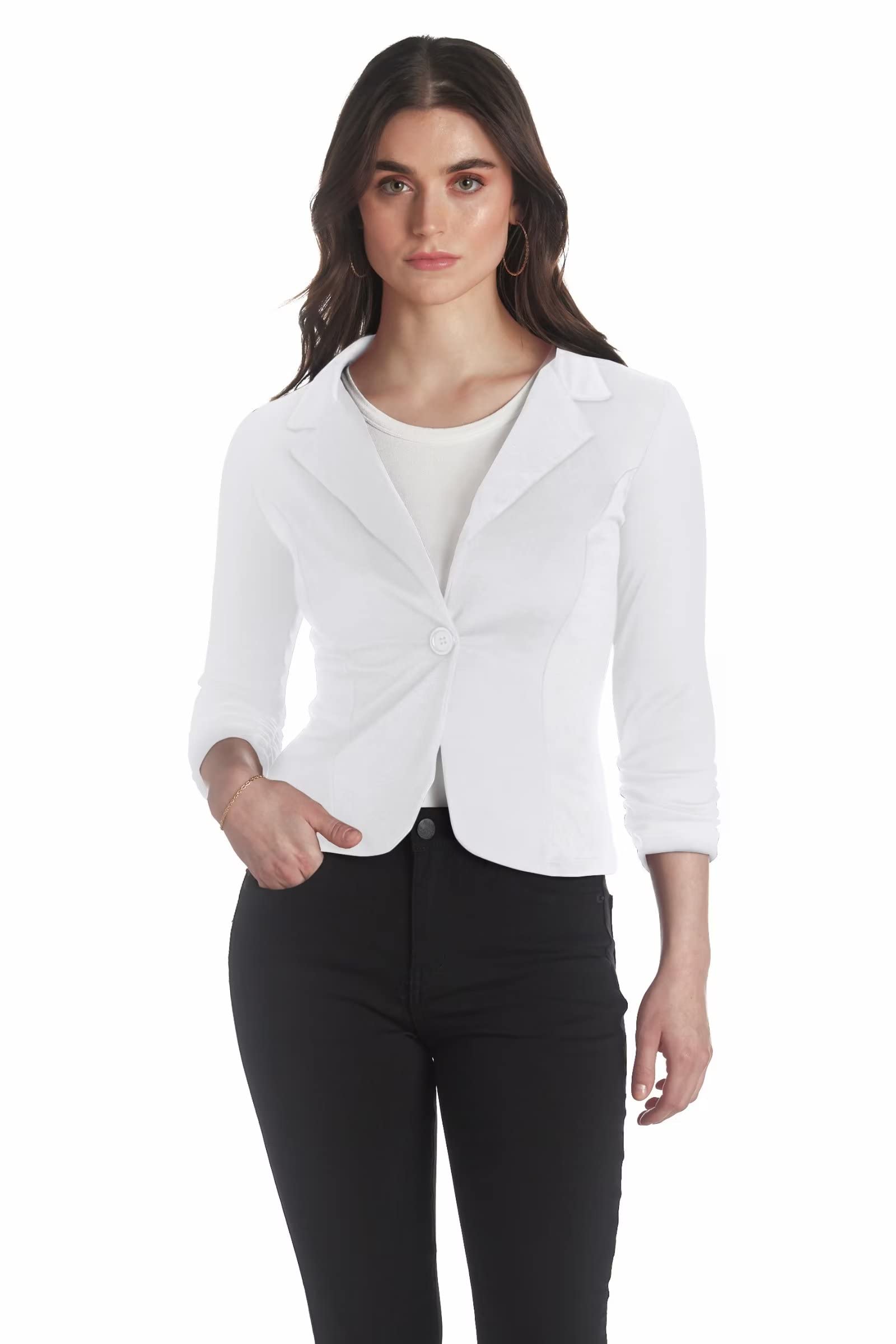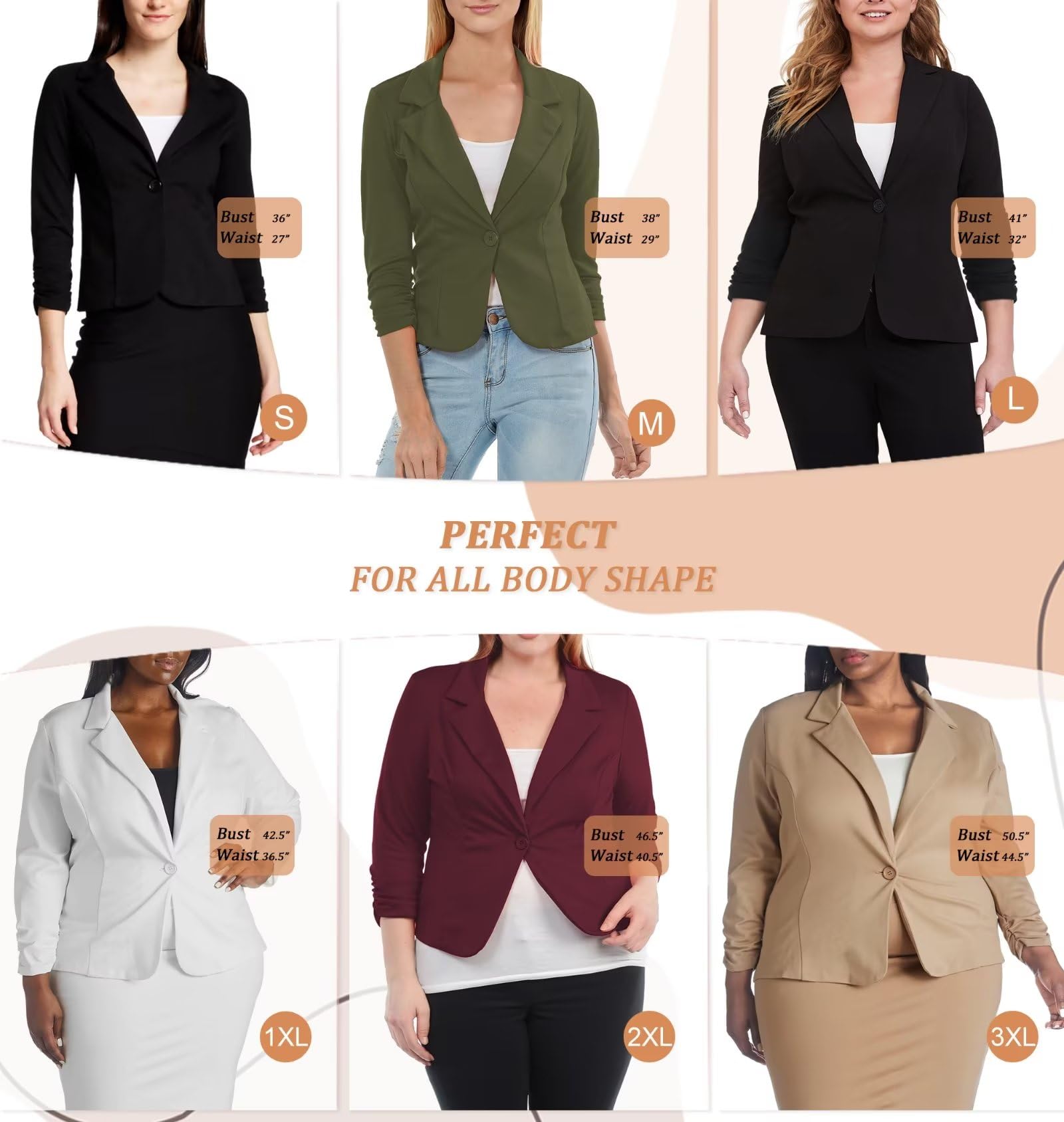 Details: Hybrid & Company Womens Casual Work Office Blazer is a timeless, professional-style blazer that will never go out of style.This blazer is a great choice for women who want to look professional but still be able to move around comfortably. The single front button and 3/4 scrunch sleeves allow for easy movement while the form-fitting cut keeps you looking your best. Hybrid & Company blazer is made in the USA from high-quality stretch fabric, which means it's both durable and comfortable. Available in junior and plus sizes, this blazer will fit most body types comfortably.