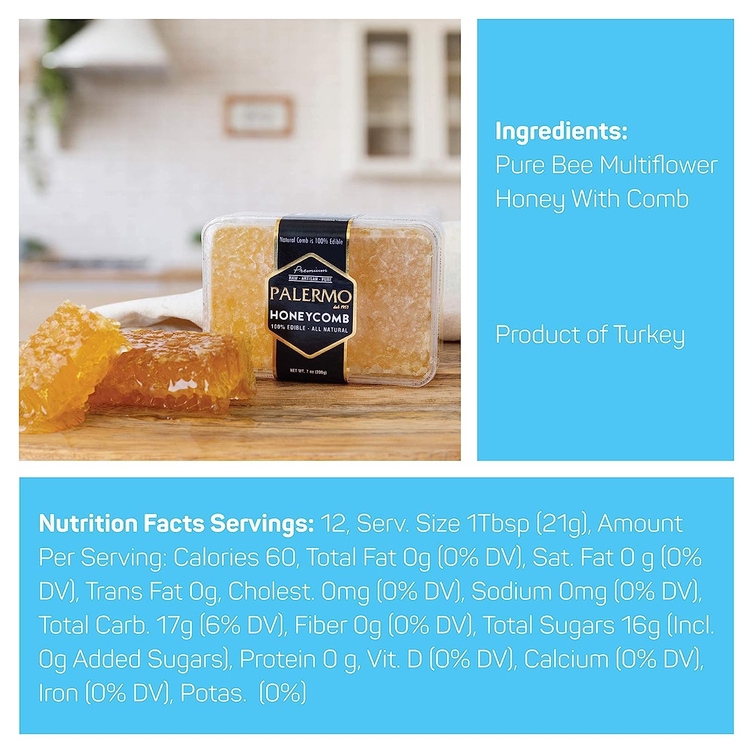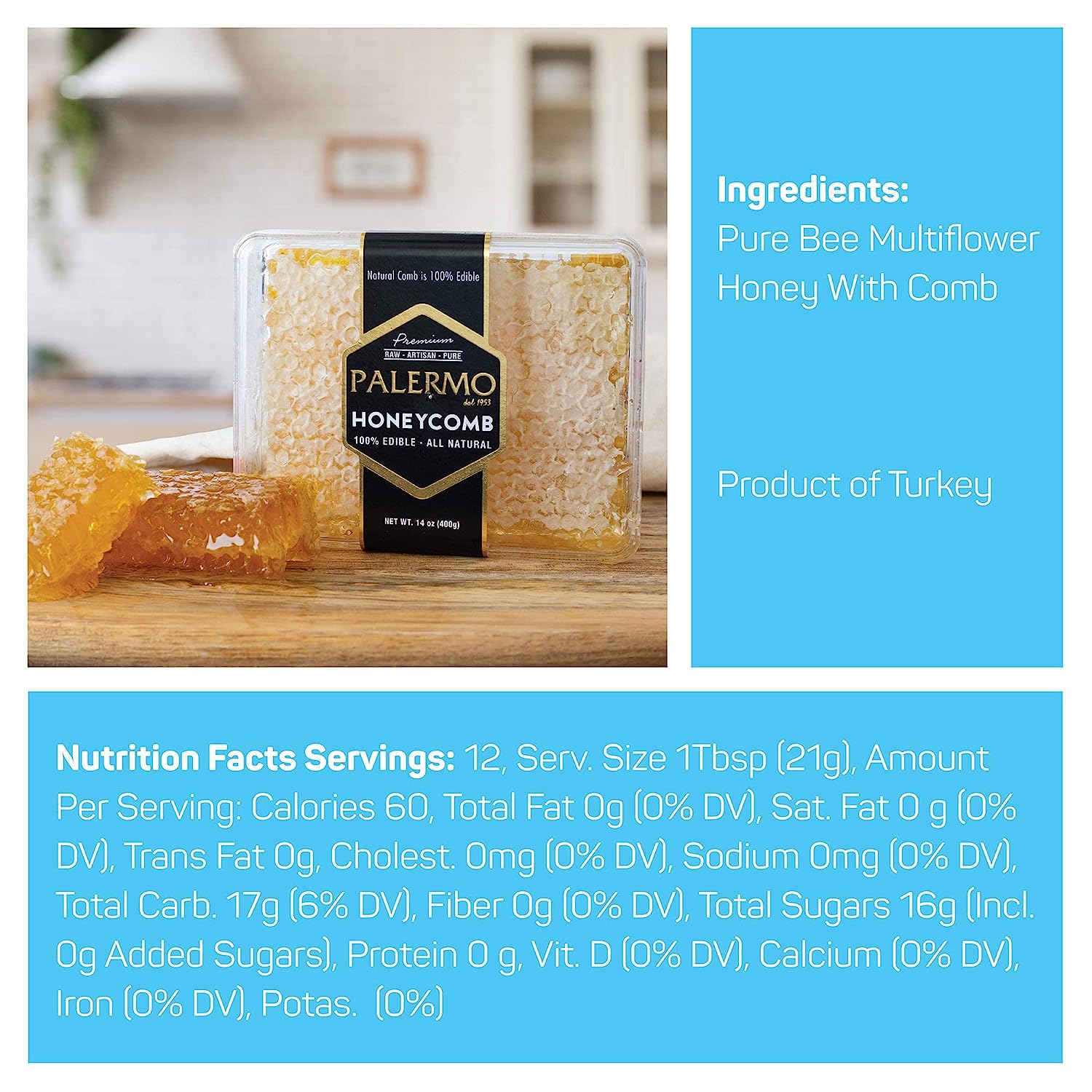 Palermo has been producing the highest quality gourmet foods for more than 25 years that are sold in more than 60 countries worldwide. Our honeycomb comes from the flowers of Mediterranean mountains in its 100% pure form. All natural without pesticides, artificial ingredients, preservatives or added sugar. Quality and safety are our top priorities: Our plants operate under strict HACCP and ISO 22000:2006 Food Safety Protocols to ensure we deliver high quality and safe products to your family. Our honeycomb comes in its raw state and is unrefined, never pasteurized or heat-treated. It is also a naturally gluten-free and dairy-free product. Please try our other Palermo brand gourmet products including organic extra virgin olive oils, organic virgin coconut oils, spices and more.