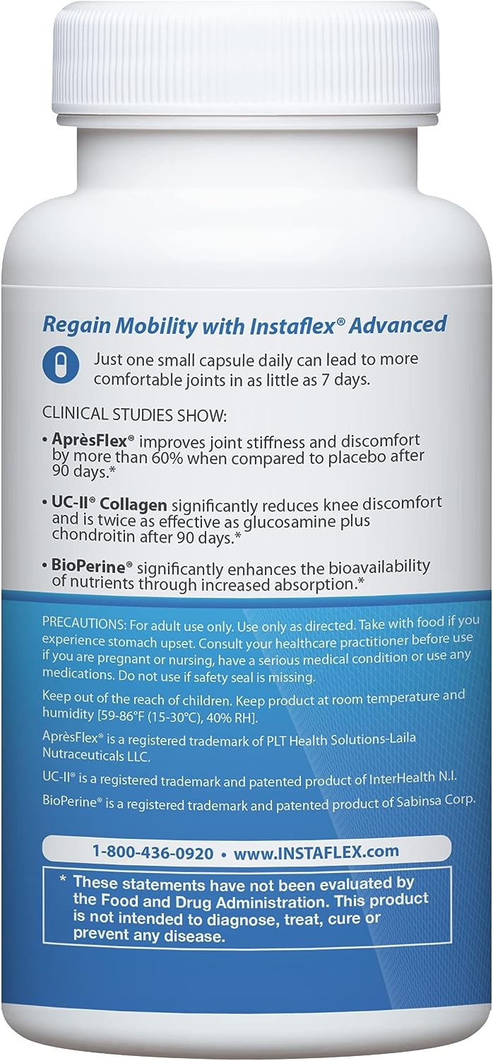 • Instaflex Advanced is made with potent, ultra-premium ingredients like UC-II Collagen, which is twice as effective as glucosamine plus chondroitin at reducing discomfort during daily activities