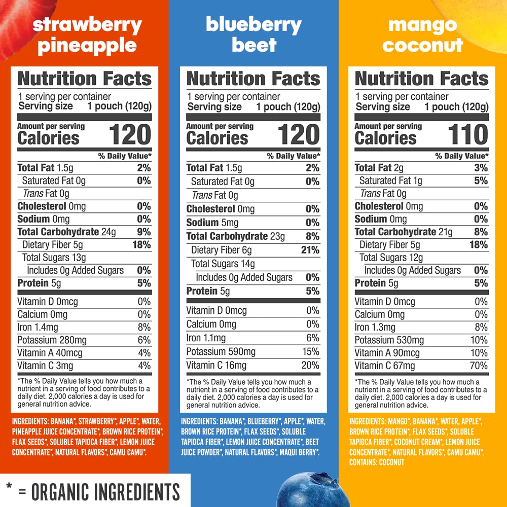 • Protein, Fiber and Healthy Fats: Each smoothie pouch contains 5g of plant protein, 5-6g prebiotic fiber, flax seed, 600mg of Omega-3s, essential vitamins and minerals, and antioxidant rich superfoods like camu camu, goji berry and maqui berry for the energy and nutrition you need.