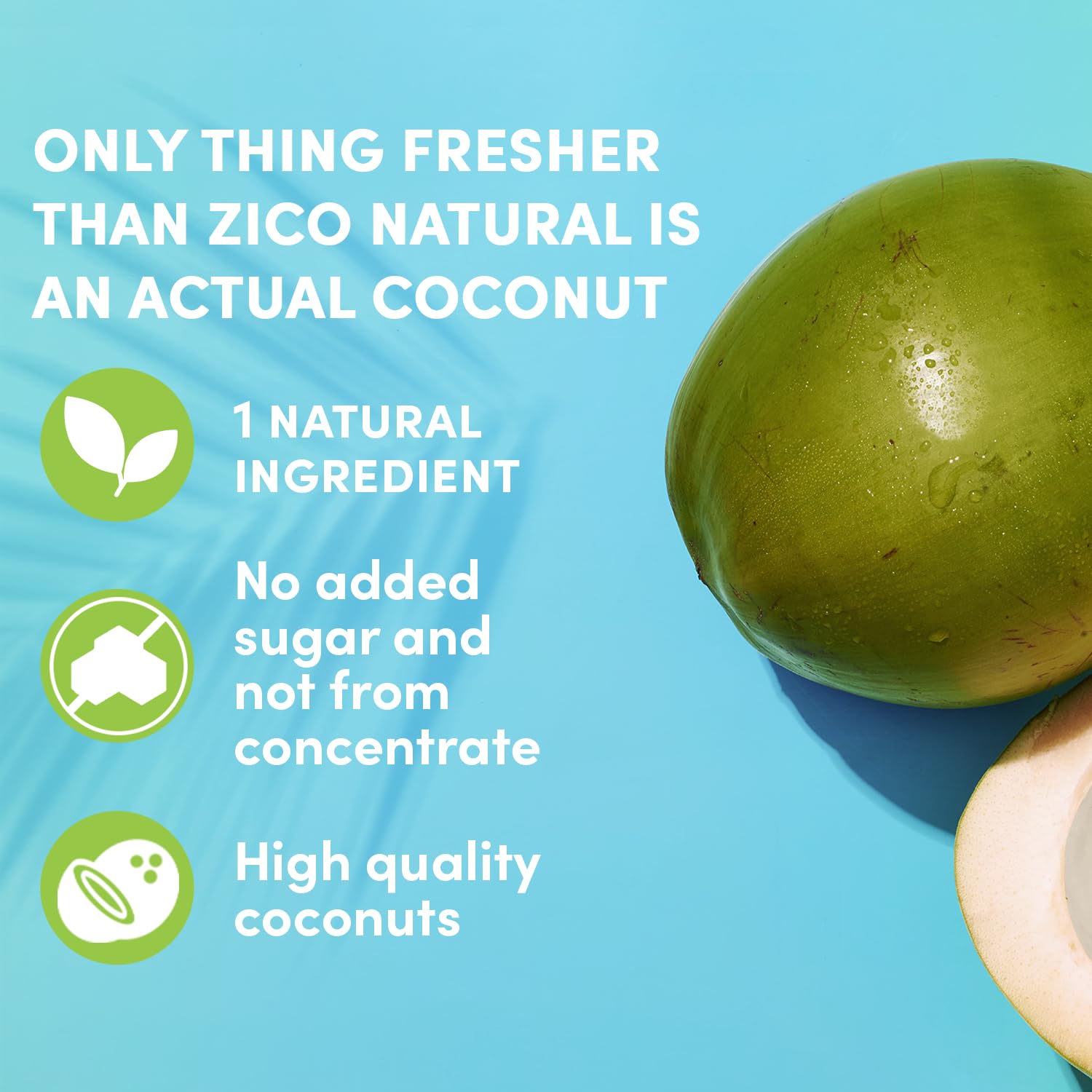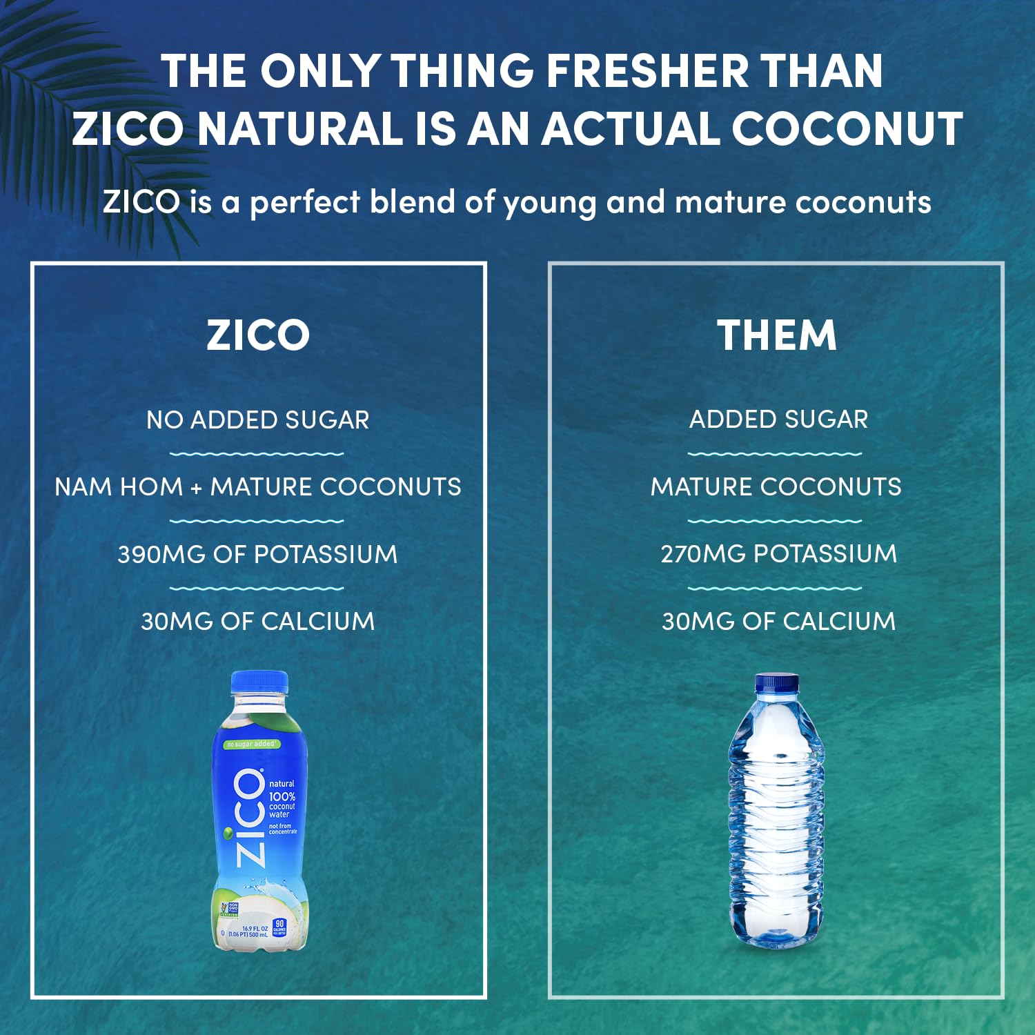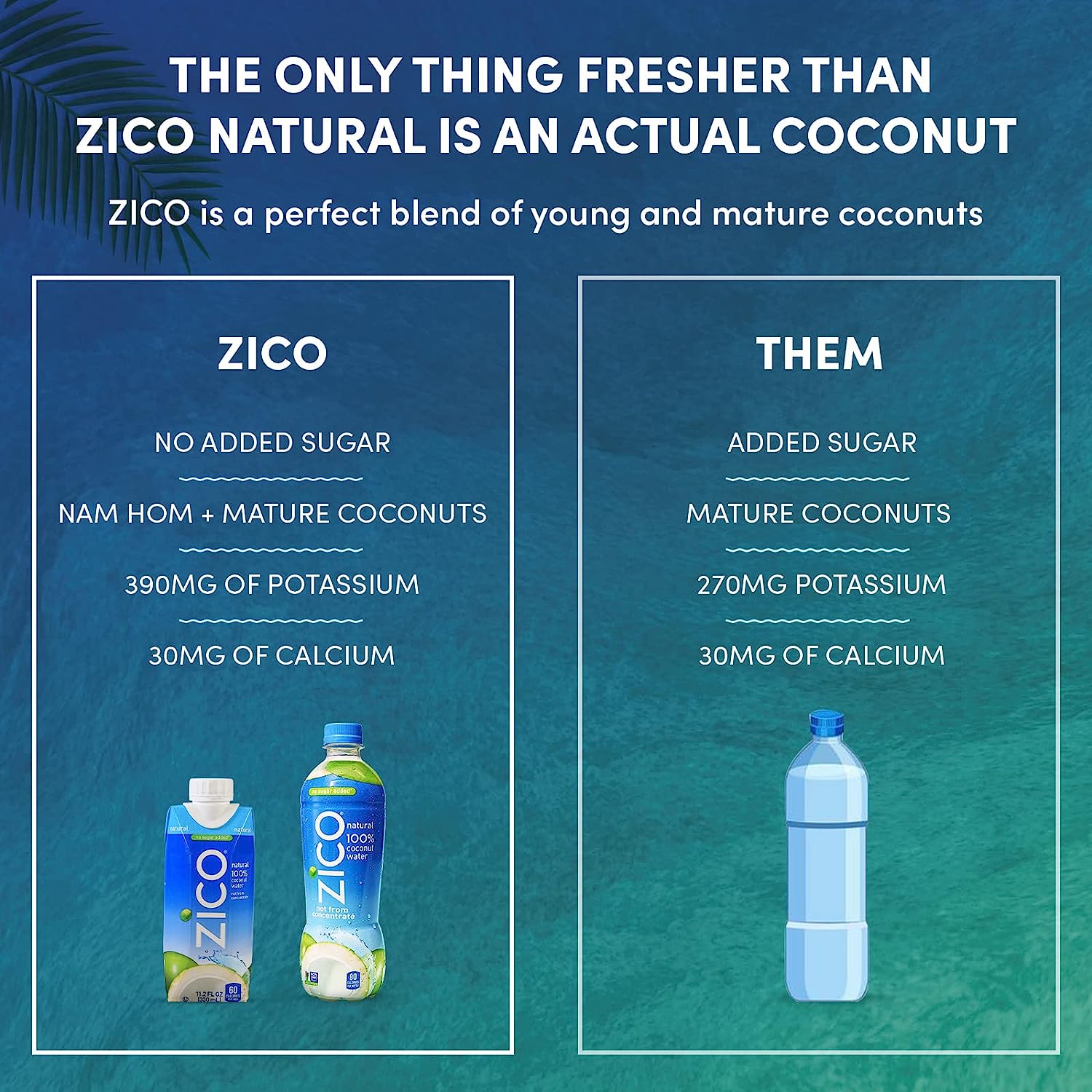 ZICO Natural 100% Coconut Water has just 1 natural ingredient – coconut water. ZICO supports hydration with five naturally-occurring electrolytes, including as much potassium as a banana per bottle. With NO added sugar, not from concentrate, fat-free, gluten-free, and cholesterol-free, you can feel good cracking open a delicious hydrating with ZICO all day long. Replenish everyday moments, naturally, with ZICO.