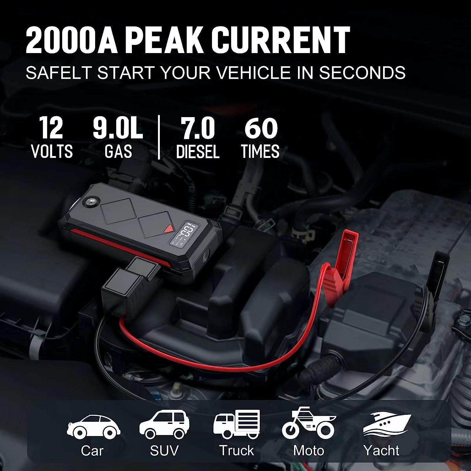 Acmount Car Jump Starter, 2000A Peak Lithium Jump Starter Battery Pack for Up to 9L Gas or 7L Diesel Engine, Safe 12V Portable Battery Starter Power Pack with LED Screen & LED Light