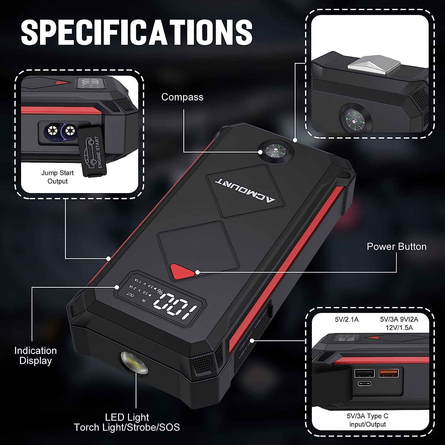 • Multi-Protection: Acmount Jump starter uses design of Integrated Battery and Intelligent Clamps, which is fully insulated and safe enough. 10 types of protection include spark-proof, reverse-polarity protection to protect you from failure problems such as short circuits or sparks.