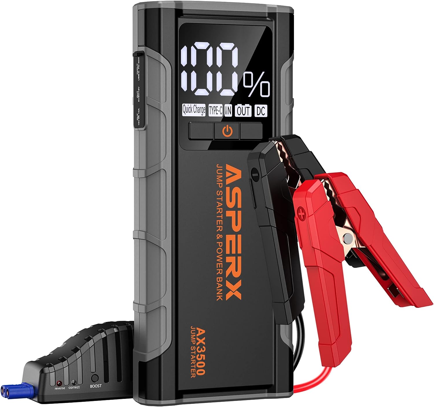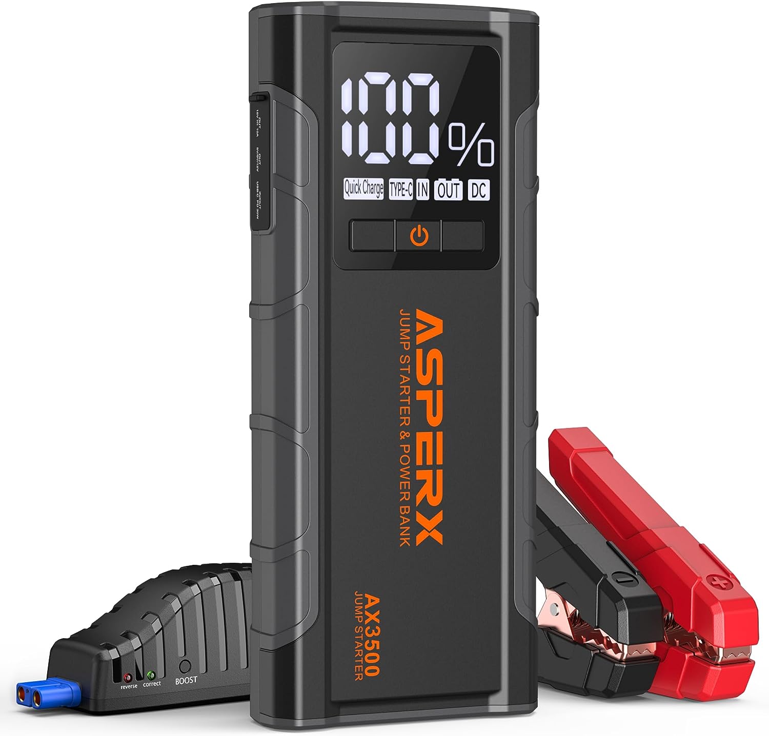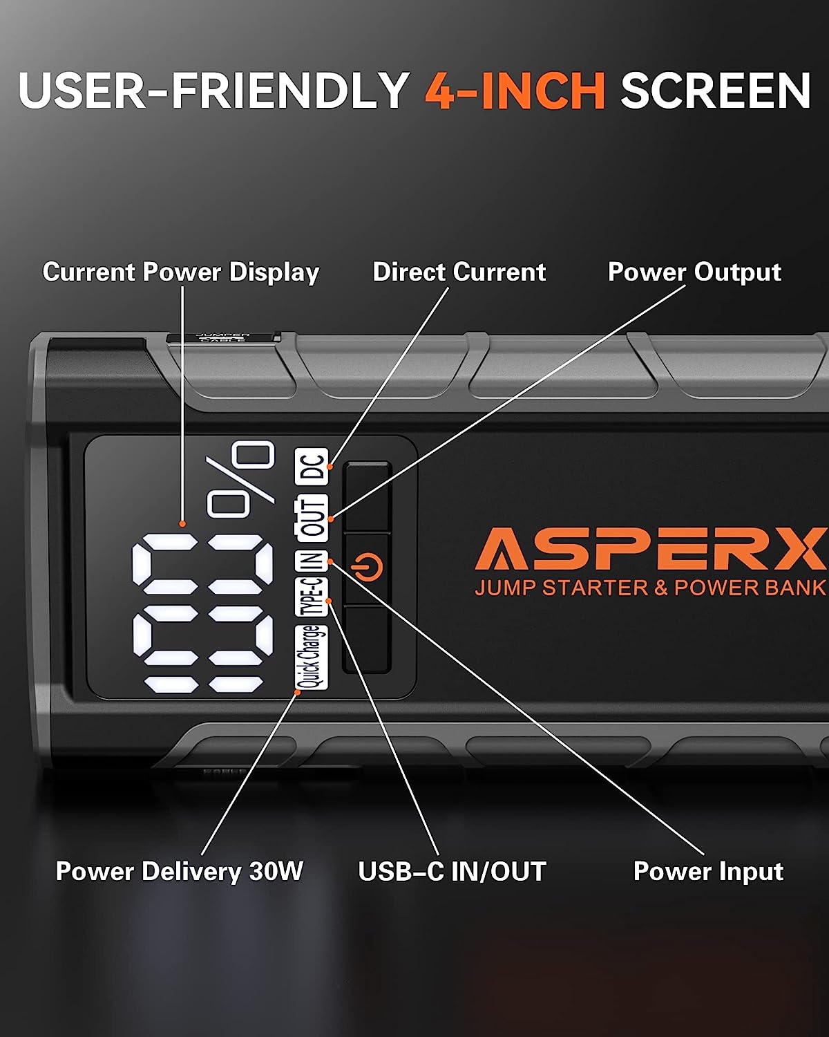 ASPERX Jump Starter, 3500A Battery Jump Starter with PD 30W Fast Charging (Up to 10L Gas/8.5L Diesel Engines), 12V Battery Starter with 4 Inch LCD Display, Lithium Battery Booster with LED Light