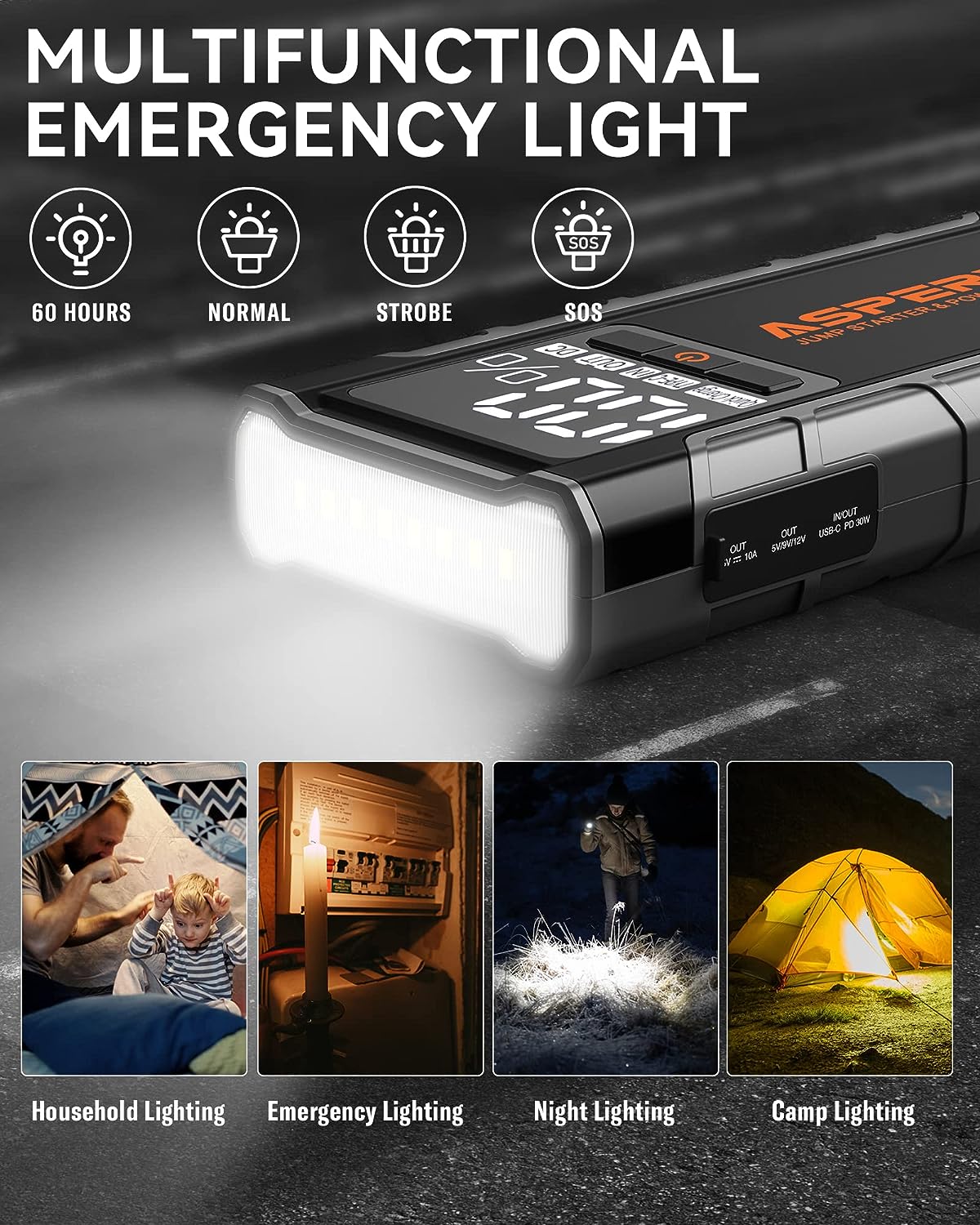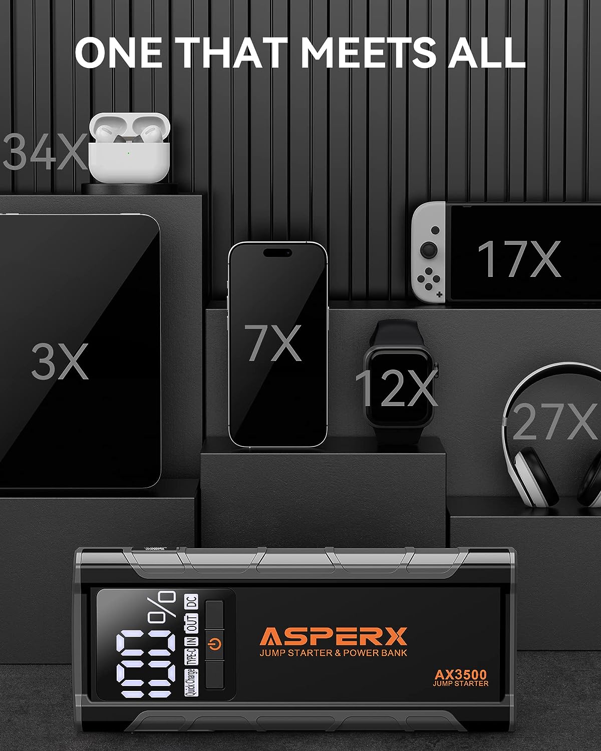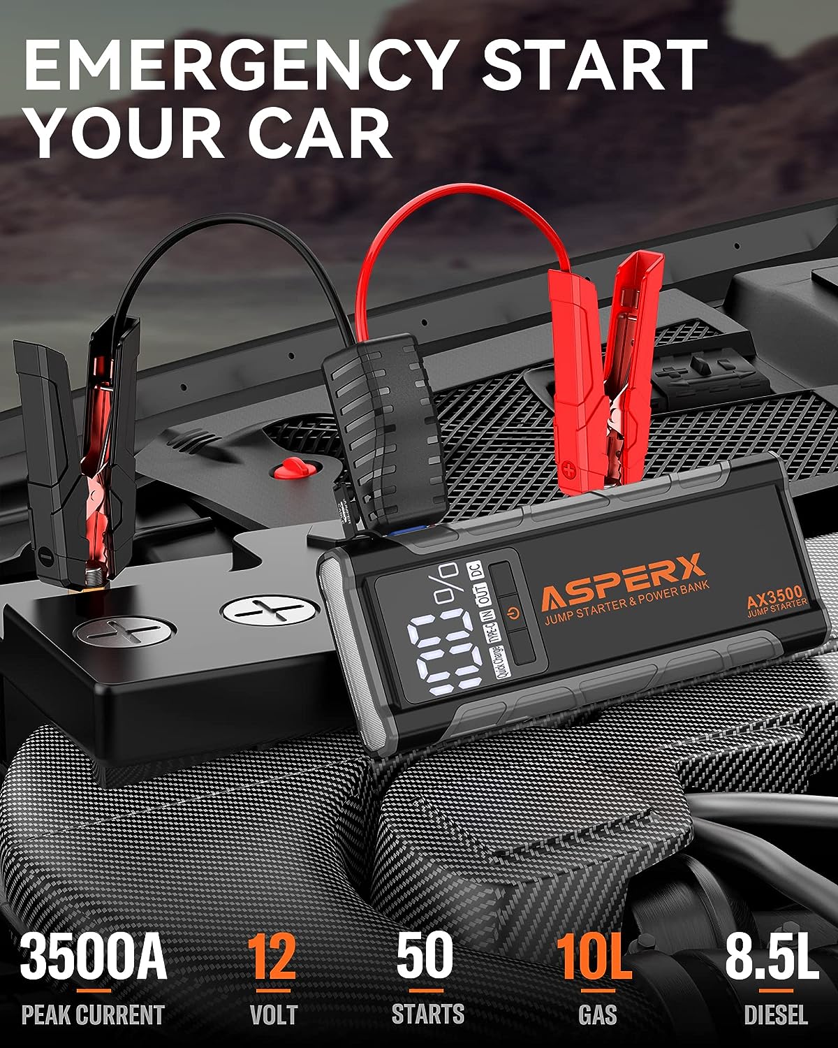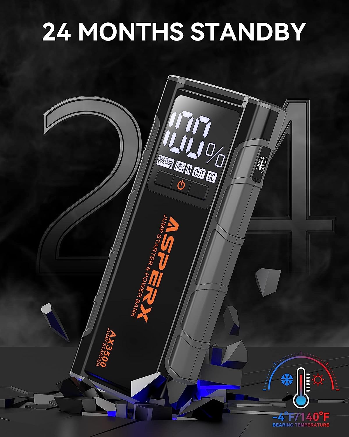 ASPERX Jump Starter, 3500A Battery Jump Starter with PD 30W Fast Charging (Up to 10L Gas/8.5L Diesel Engines), 12V Battery Starter with 4 Inch LCD Display, Lithium Battery Booster with LED Light
