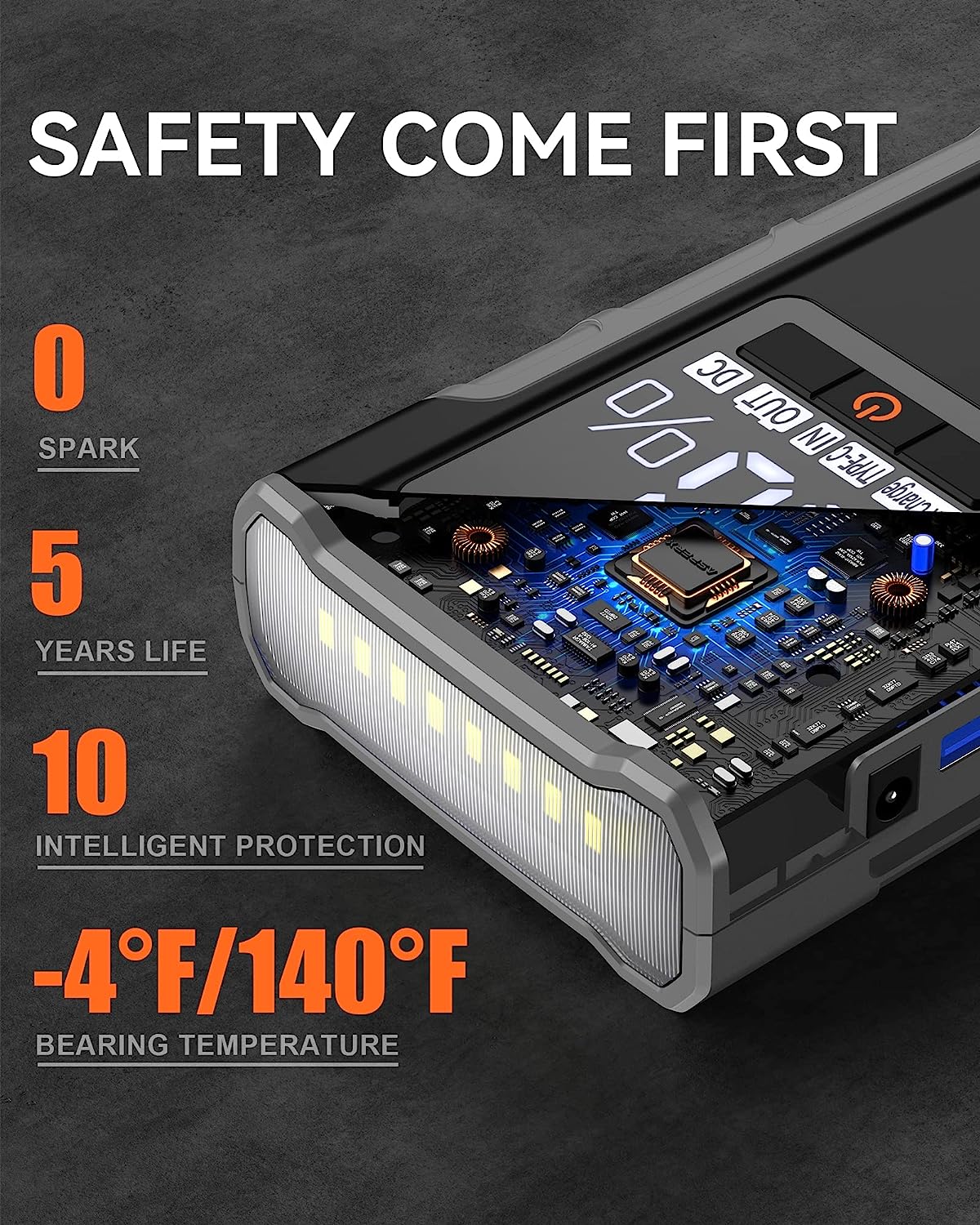 • 【ADVANCED PROTECTION SYSTEM】AX3500 portable car jump starter without the worry of incorrect connections. The battery starter has more than 10 types of safety protection, combined with heavy duty jump clamps for fast and safe start-up of a dead car battery even in extreme temperatures (-4°F~140°F). AX3500 battery booster has a 4 inch LCD display to indicate correct operation and power level.