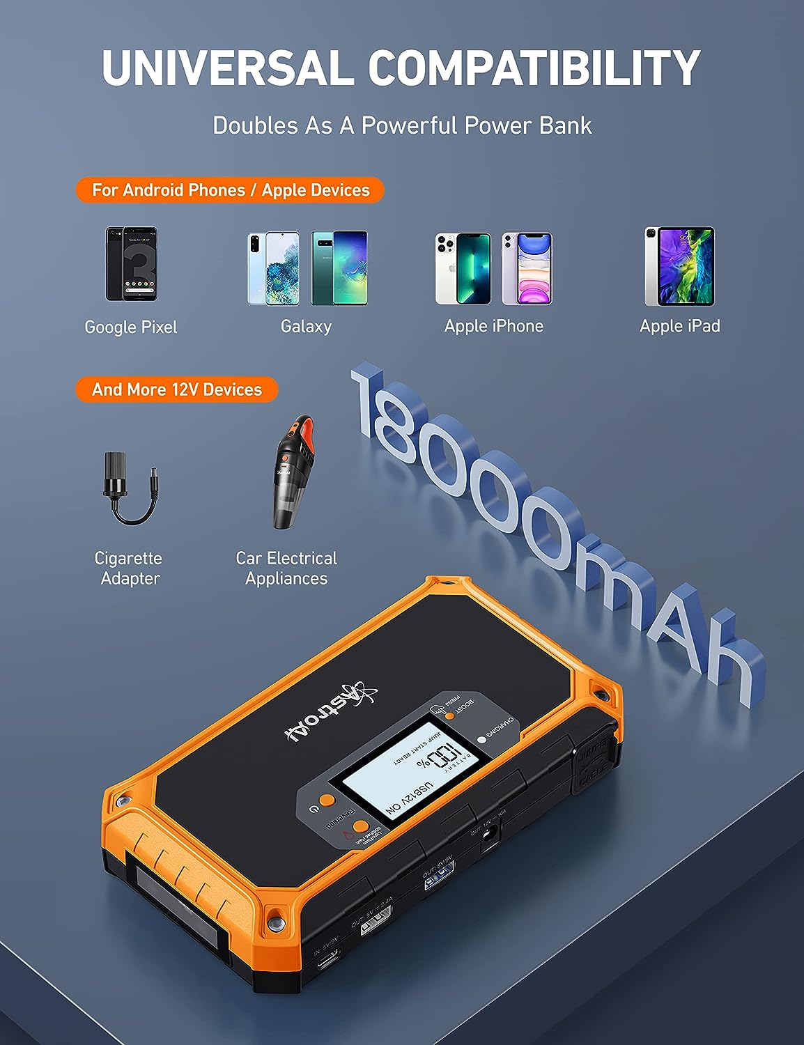 • 18000mAh POWER BANK - 18000mAh larger capacity car starter jumper power bank is equipped with 3 output ports (USB 3.0 5V/3A OR 9V/2A, USB 2.0 5V/2.4A, DC 12V10A). The extra USB 3.0 high-speed output port makes charging for your phones, smartwatches, tablets, and other devices easier and faster. The DC 12V10A output port can recharge your car refrigerator, car vacuum cleaner, tire inflators, air compressor etc.(Cigarettes adapter and charging cable are included, AC Adapter NOT Included)