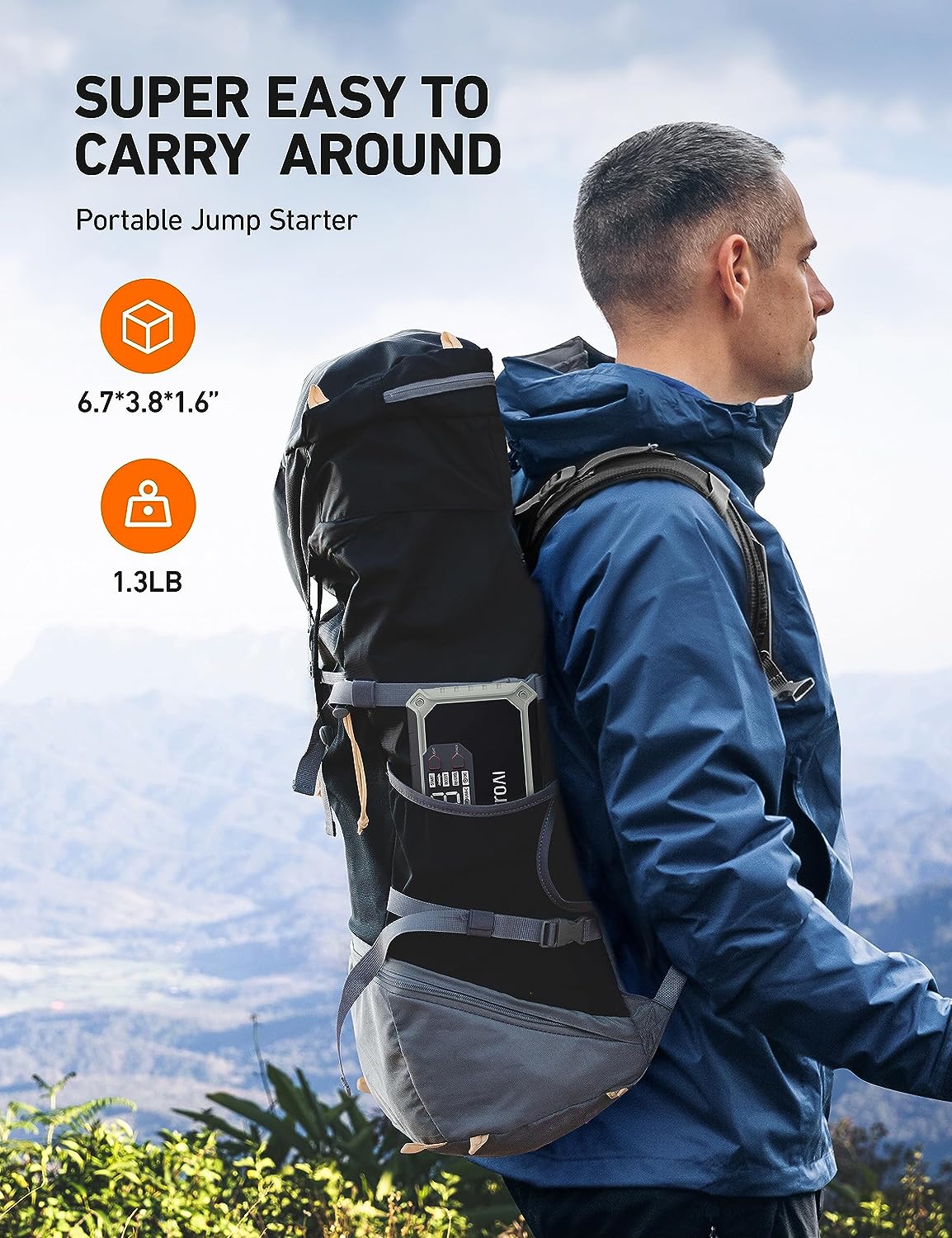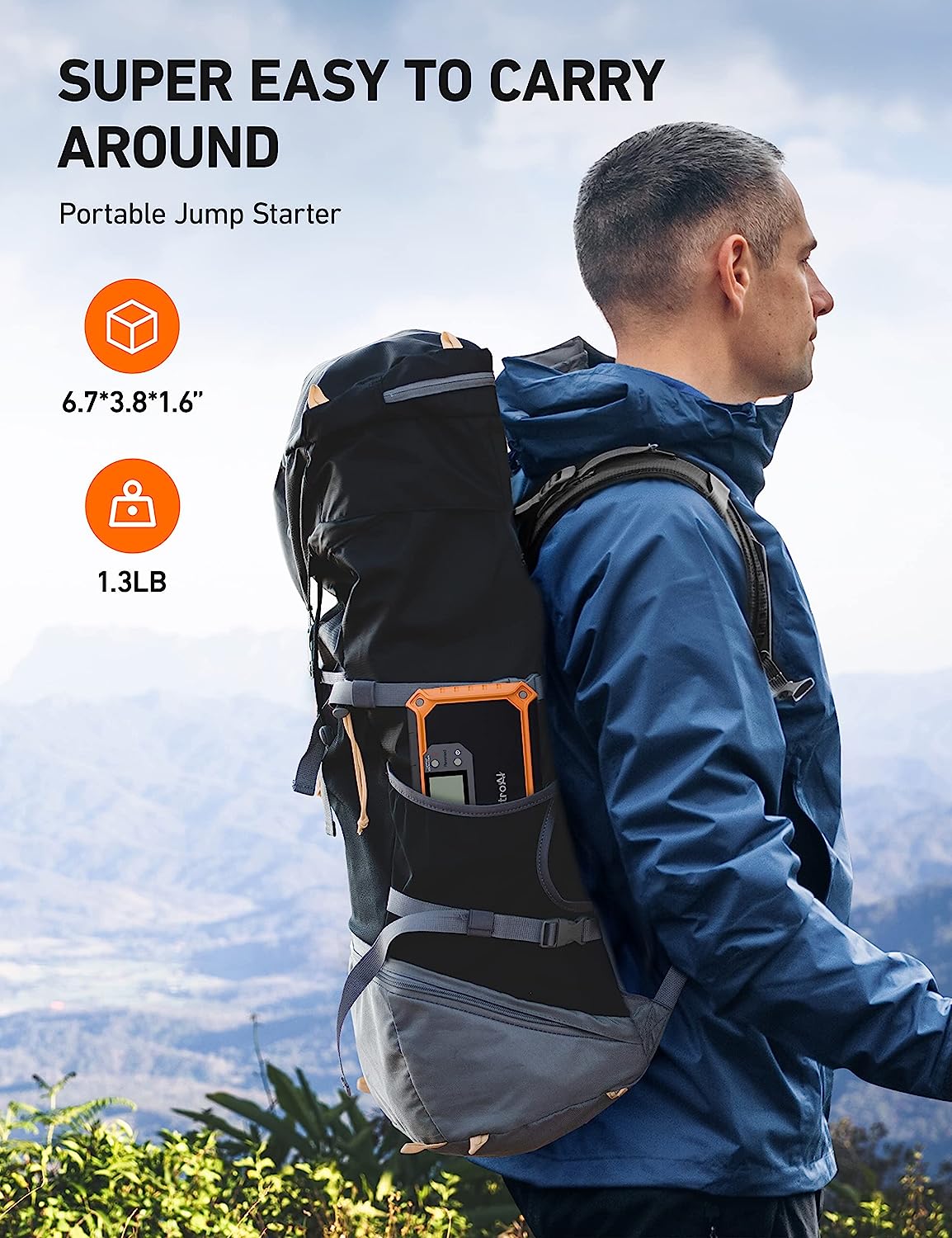 • COMPACT & PORTABLE - This portable jump starter car battery is very compact and light, with an overall size of 6.7*3.8*1.6 inches and a total weight of 1.3lbs. These dimensions make it very easy to keep in your car and carry in a travel bag. Compared with bulky lead-acid jump starters, the compact AstroAI Jump Starter brings more convenience and peace of mind to roadtrips.