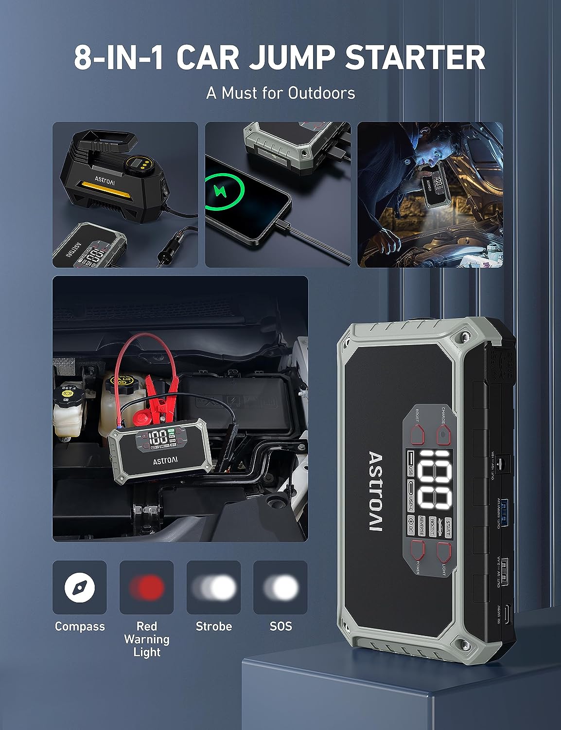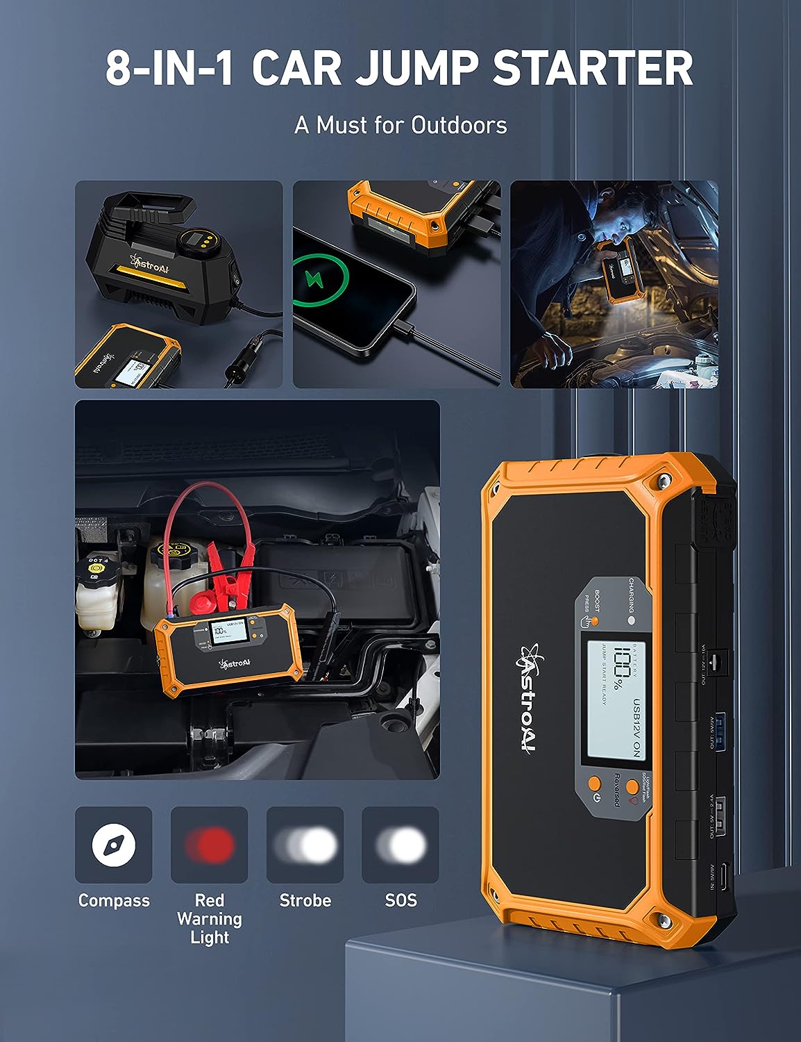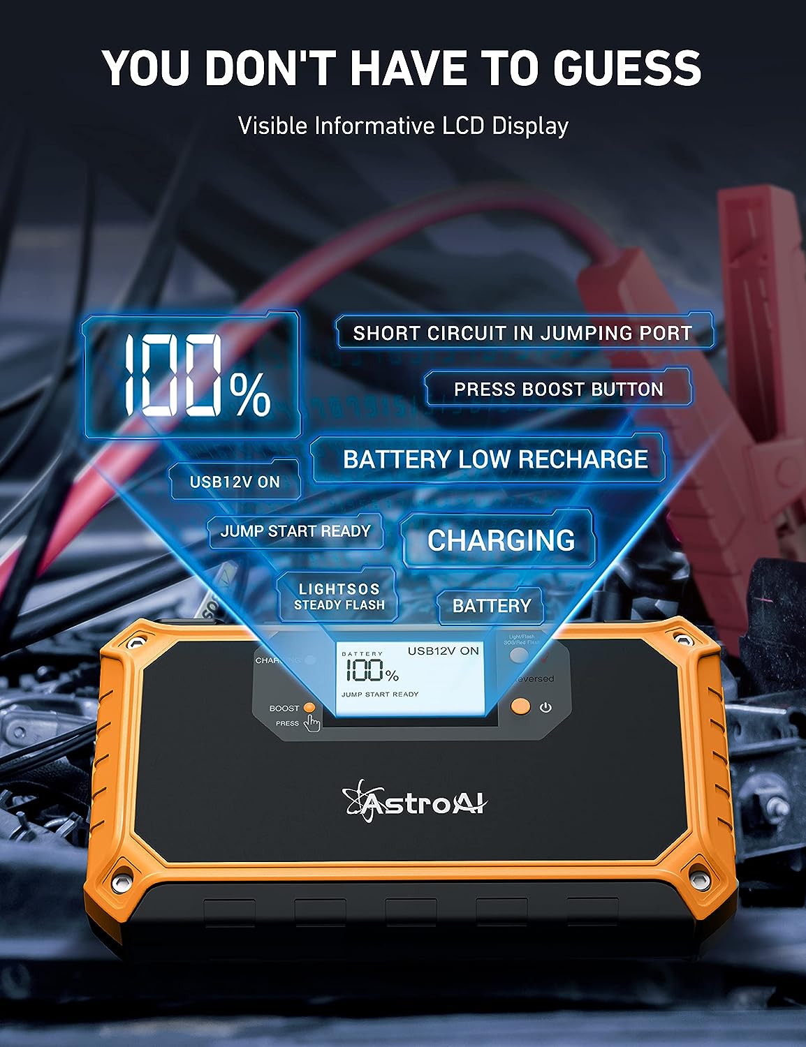 • VISIBLE 2" LCD DISPLAY - Compared with traditional portable jump starters with indicators only, AstroAI visible 2" LCD portable car jump starter clearly displays all the information you need. When you have drained batteries on a road trip, you don't have to guess by the indicators anxiously or wait hours for AAA/someone for help on desolated interstates. Just follow the instructive steps on the LCD display to save yourself clearer and easier!