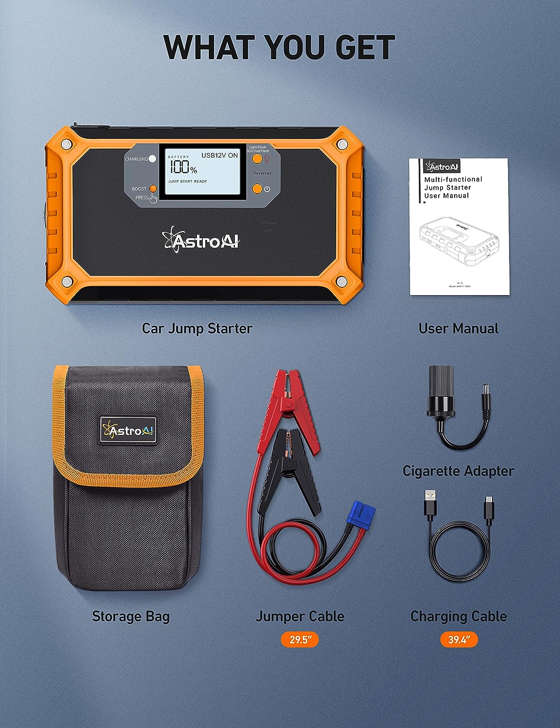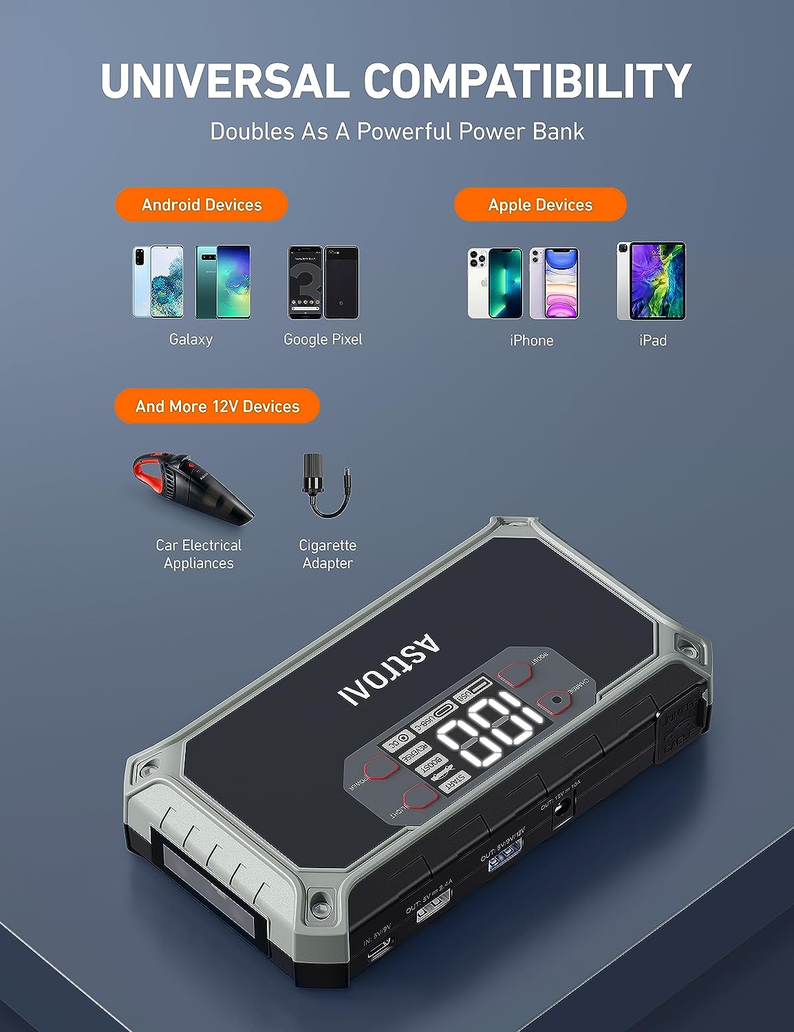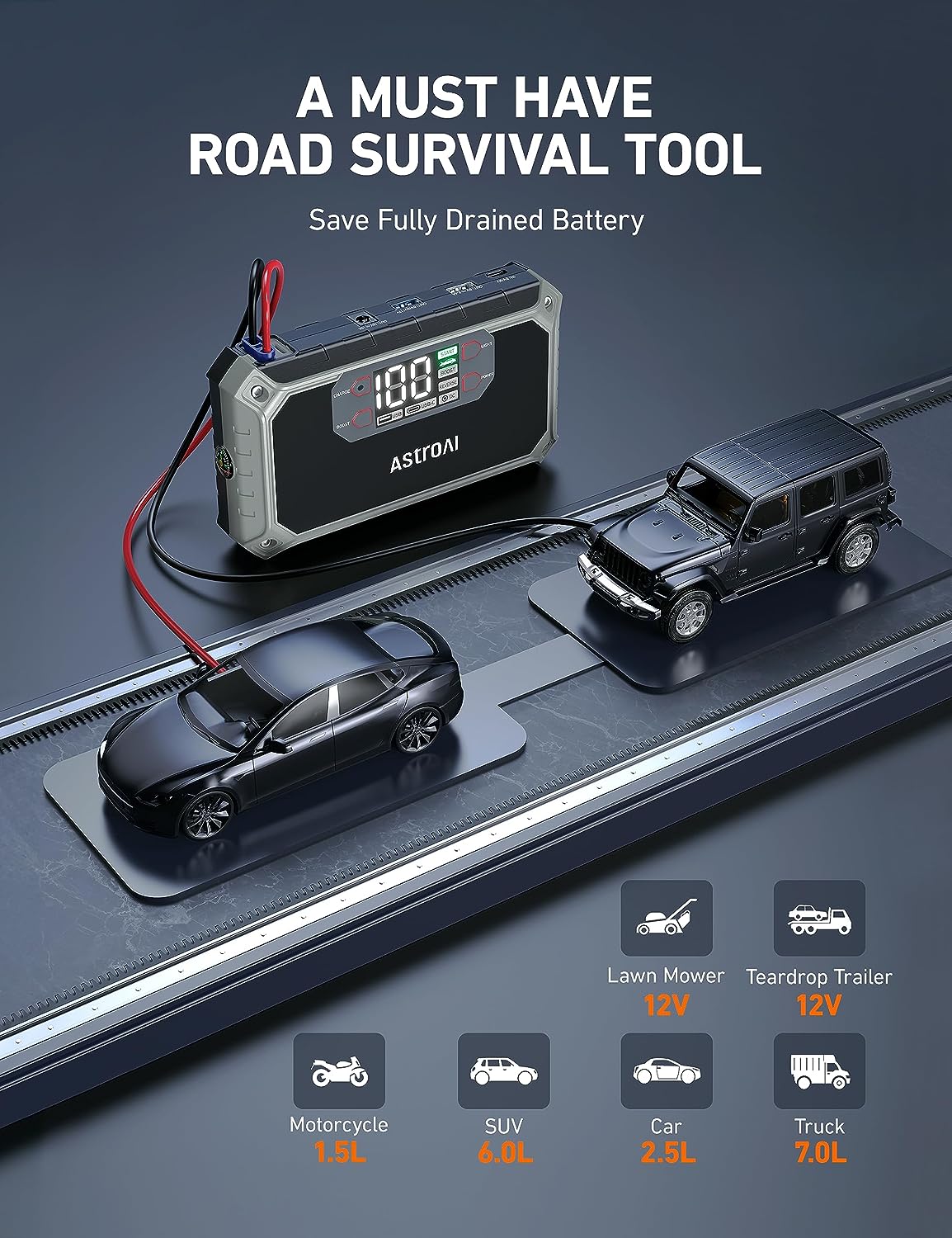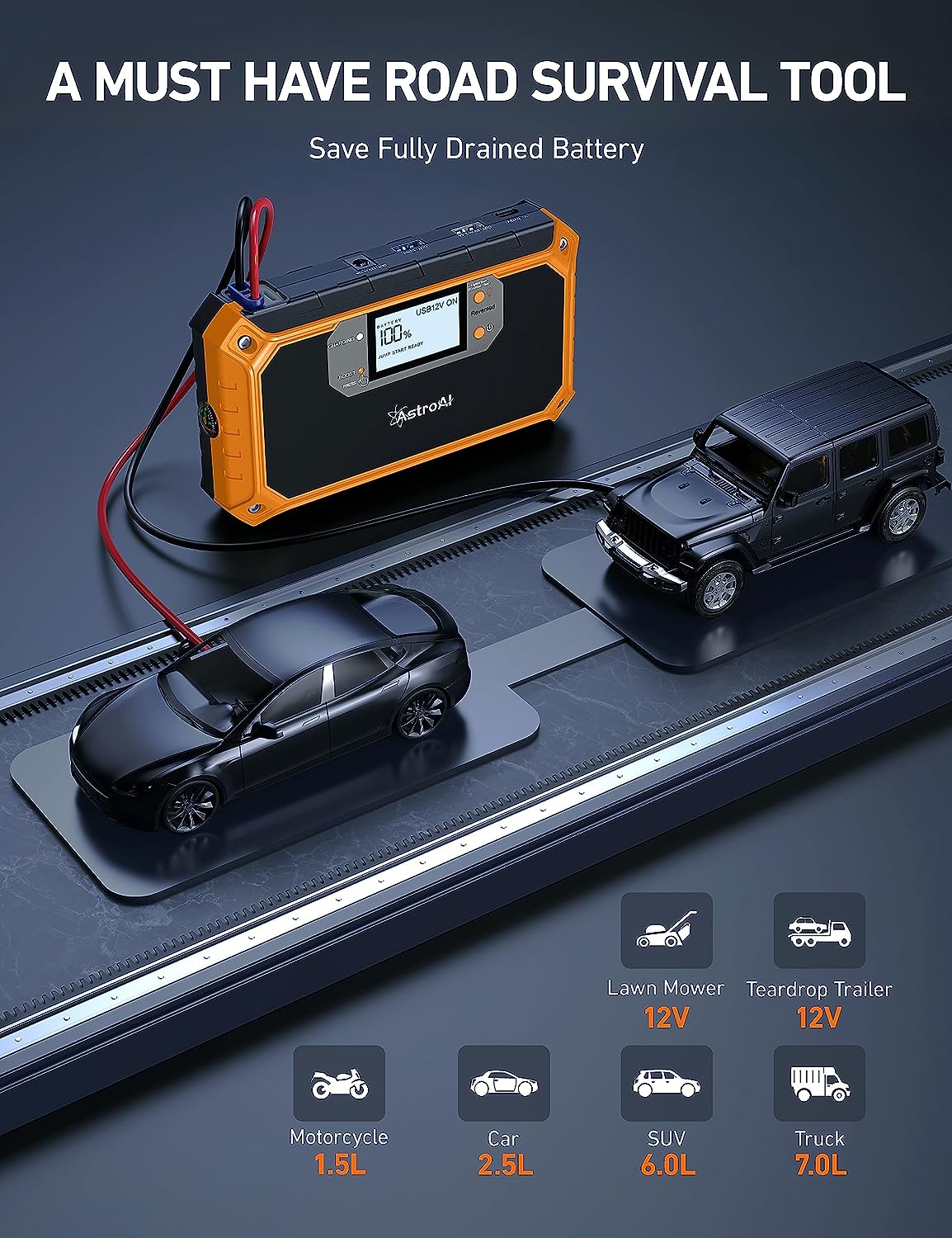 • VISIBLE 2" LCD DISPLAY - Compared with traditional portable jump starters with indicators only, AstroAI visible 2" LCD portable car jump starter clearly displays all the information you need. When you have drained batteries on a road trip, you don't have to guess by the indicators anxiously or wait hours for AAA/someone for help on desolated interstates. Just follow the instructive steps on the LCD display to save yourself clearer and easier!