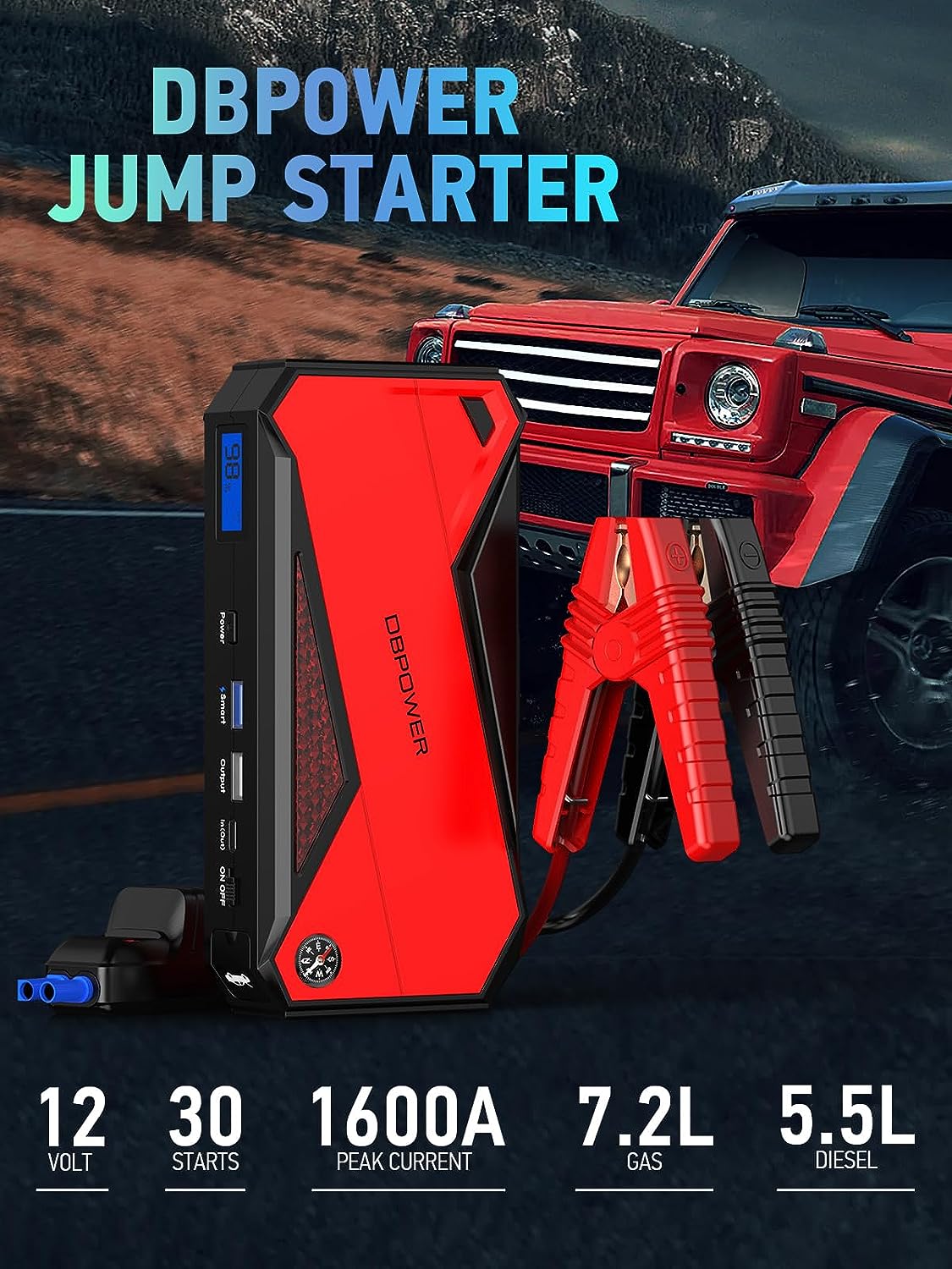 DBPOWER Peak 1600A 18000mAh Portable Car Jump Starter (up to 7.2L Gas, 5.5L Diesel Engine) Battery Booster with Smart Charging Port, Compass, LCD Screen and LED Light (Black/Red)