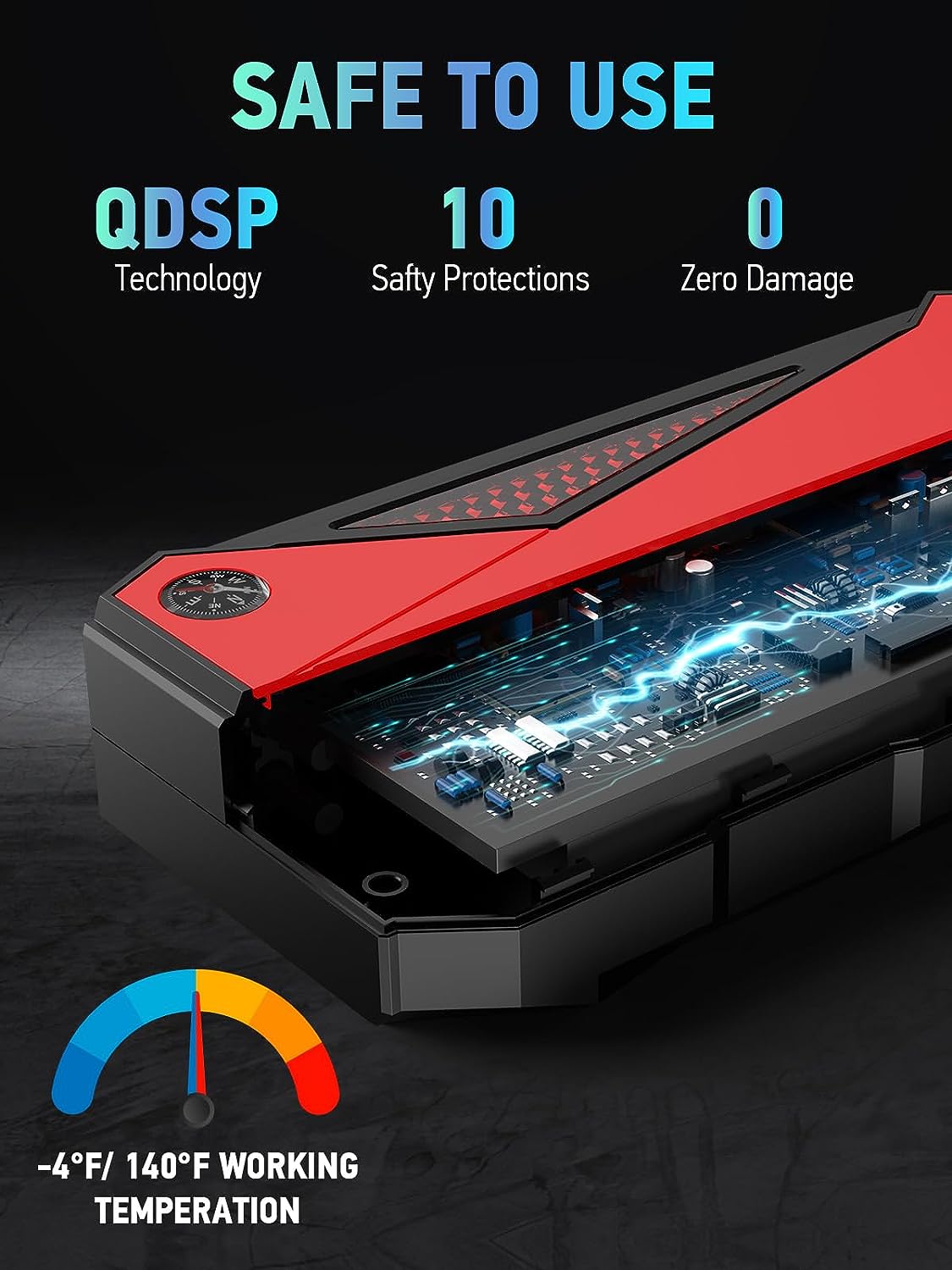 • OVER 10 MILLION UNITS SOLD: DBPOWER has over 7 years of experience in this field, we provide a safe and reliable products, 12 months of hassle-free warranty, and lifetime technical support. Contact us anytime with any questions. The package includes one Jump Starter, one intelligent jumper clamps, one USB charging cable, jump starter carry case, and user manual.