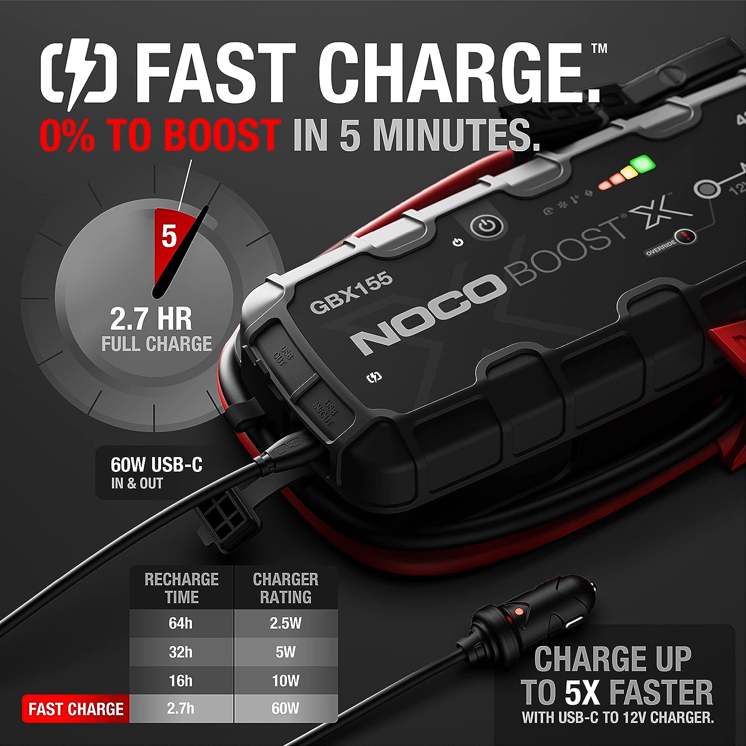 NOCO Boost X GBX155 is a portable lithium jump starter for 12-volt batteries in vehicles up to 10.0-liters gasoline and 8.0-liter diesel engines, including cars, motorcycles, trucks, ATVs, boats, RVs, vans, SUVs, tractors, and more. This all-new design for extreme jump starting power and rated at 4,250-amps releases maximum energy at every start. It comes equipped with 60W USB-C Power Delivery technology for ultra-fast recharging - go from 0% to jump starting in 5 minutes of charge - and powering your favorite USB-C devices like phones, tablets, laptops, wearables, and more. It includes our advanced safety technology - UltraSafe 2.0 - with spark-proof and reverse polarity protection but enhanced thermal efficiency and power management to provide better performance and longer battery life. Here's what you get with the all-new Boost X: GBX155 UltraSafe Portable Lithium Car Battery Booster Jump Starter Pack, Power Bank with 60W USB-C Power Delivery, Heavy-Duty Jumper Cable Clamps, USB-C Charging Cable, 12V USB-C Fast Charger, Microfiber Storage Bag, 1-Year Warranty, and Designed in the USA.