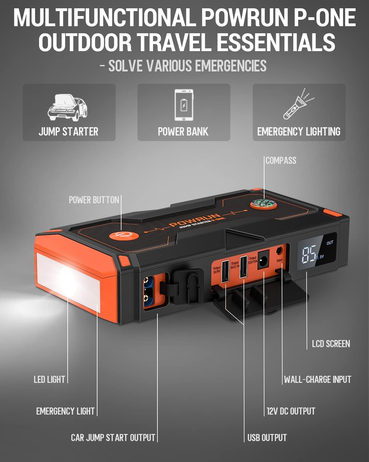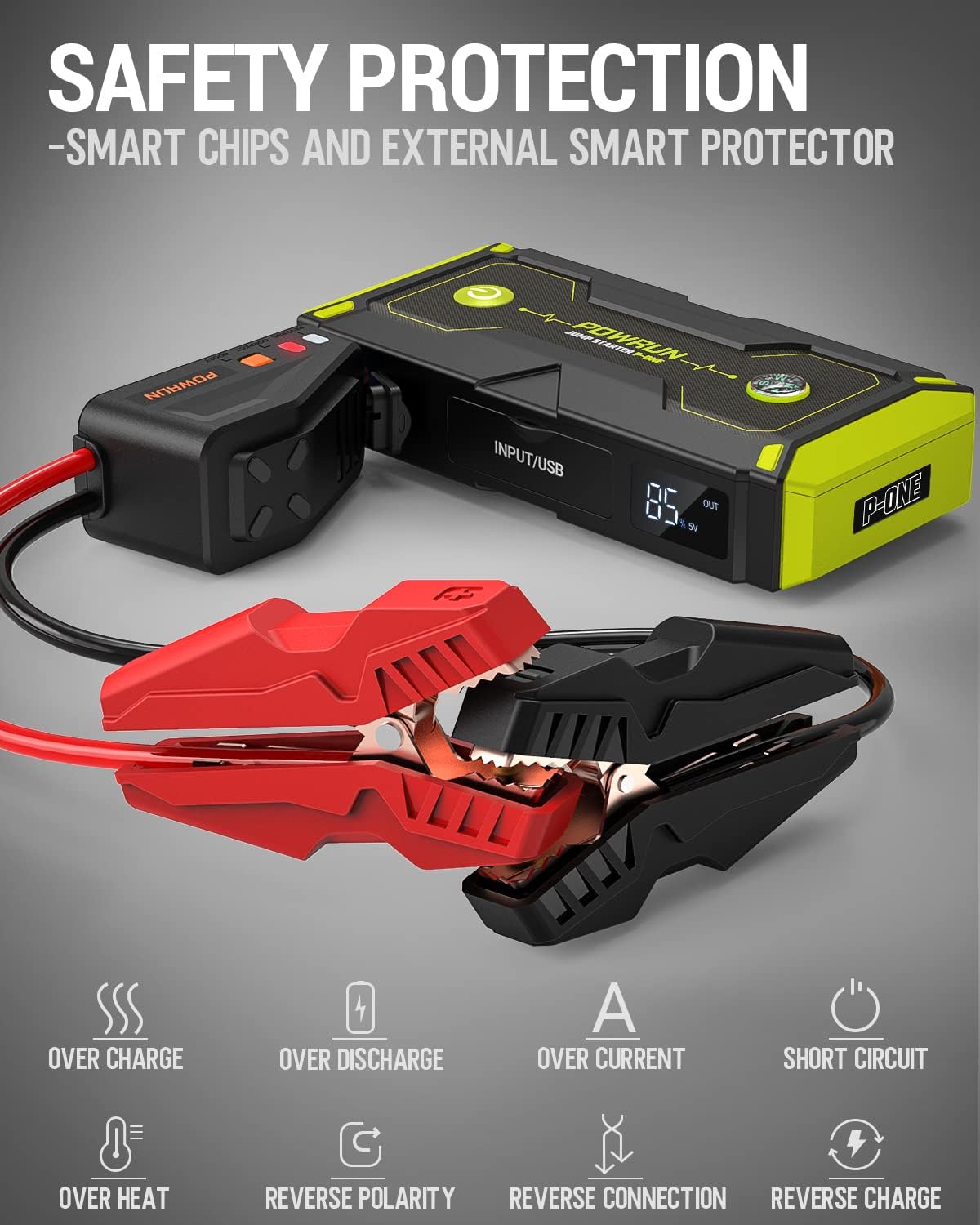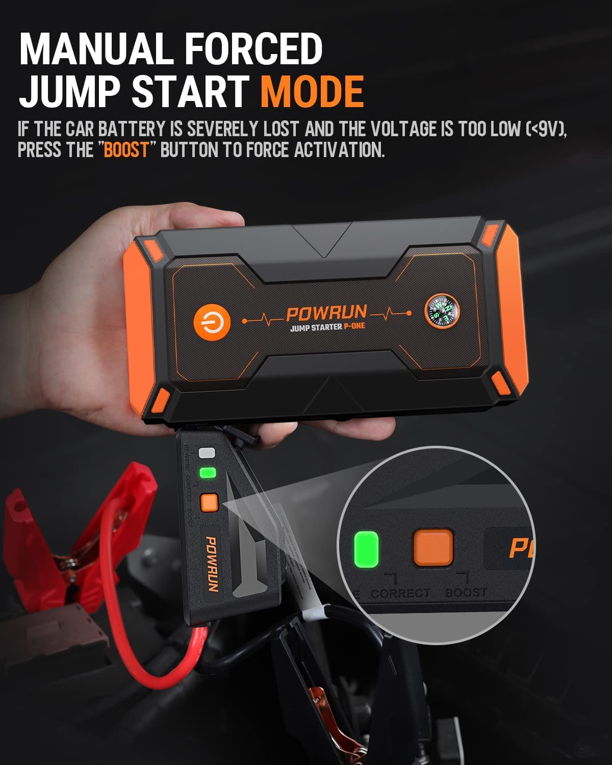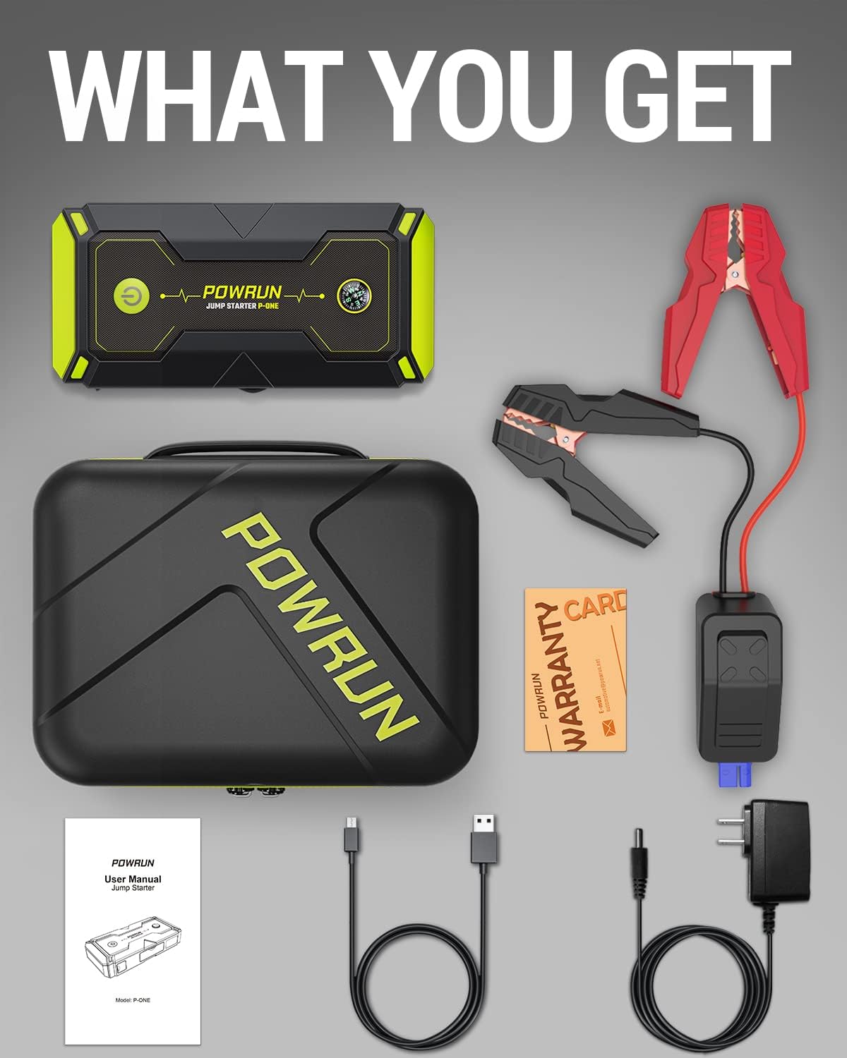 • WHAT YOU GET - Powrun P-ONE Jump Starter, Smart Jumper Cables, Wall Charger, USB Cable, EVA Storage Case, User Manual, Two years warranty, Excellent after-sales service. Please contact us for help if you have any questions, we will answer in 12 hours.
