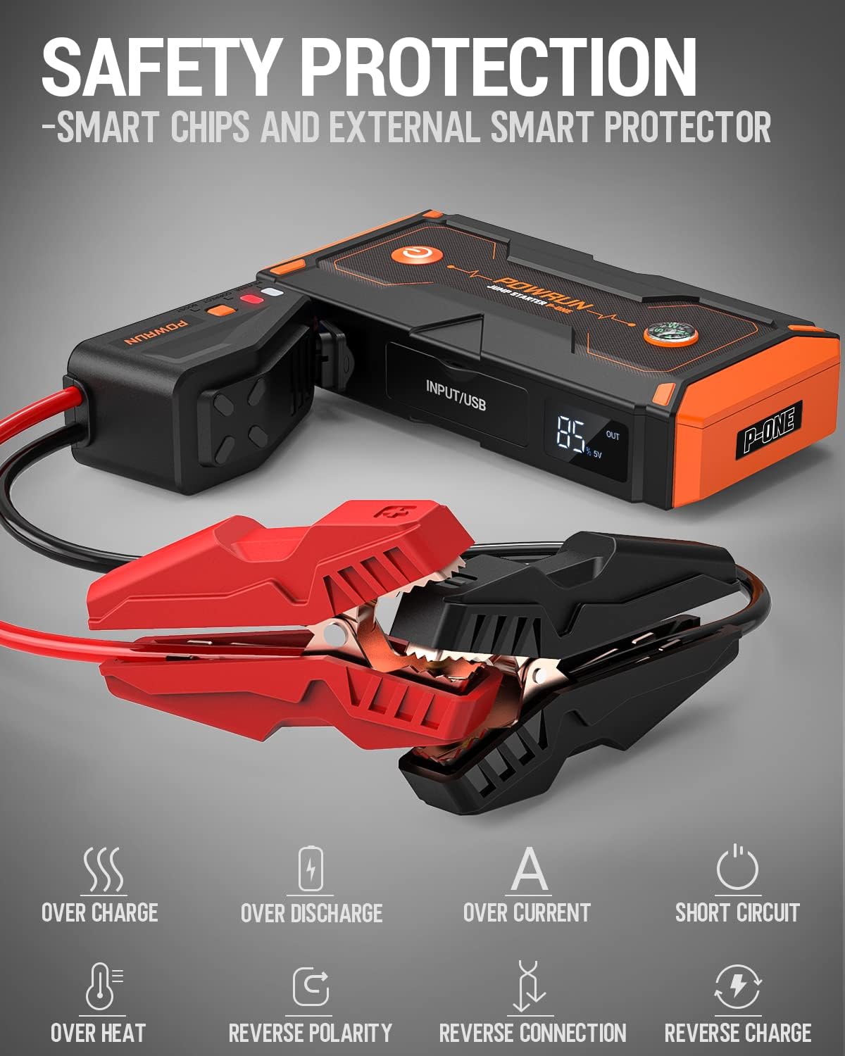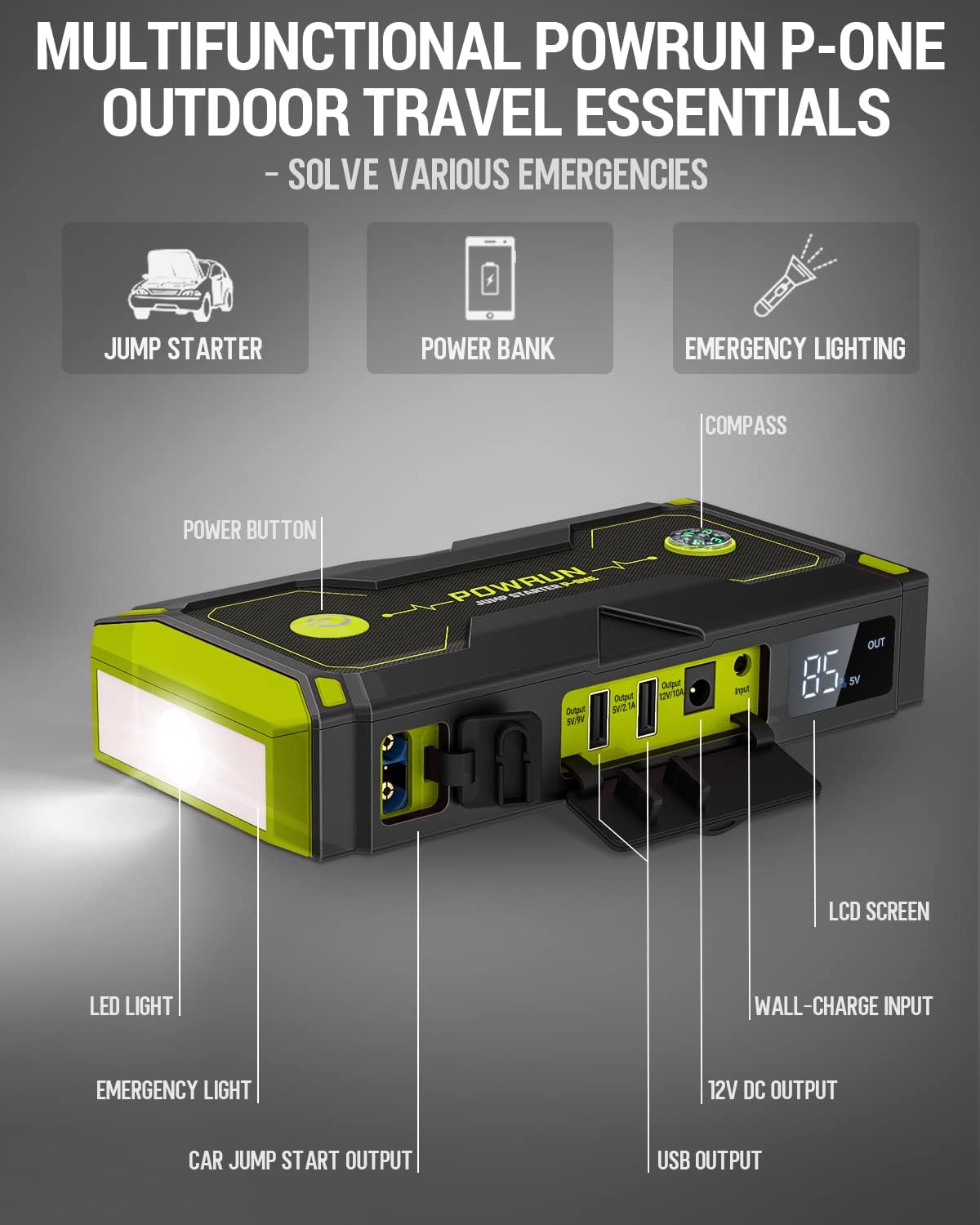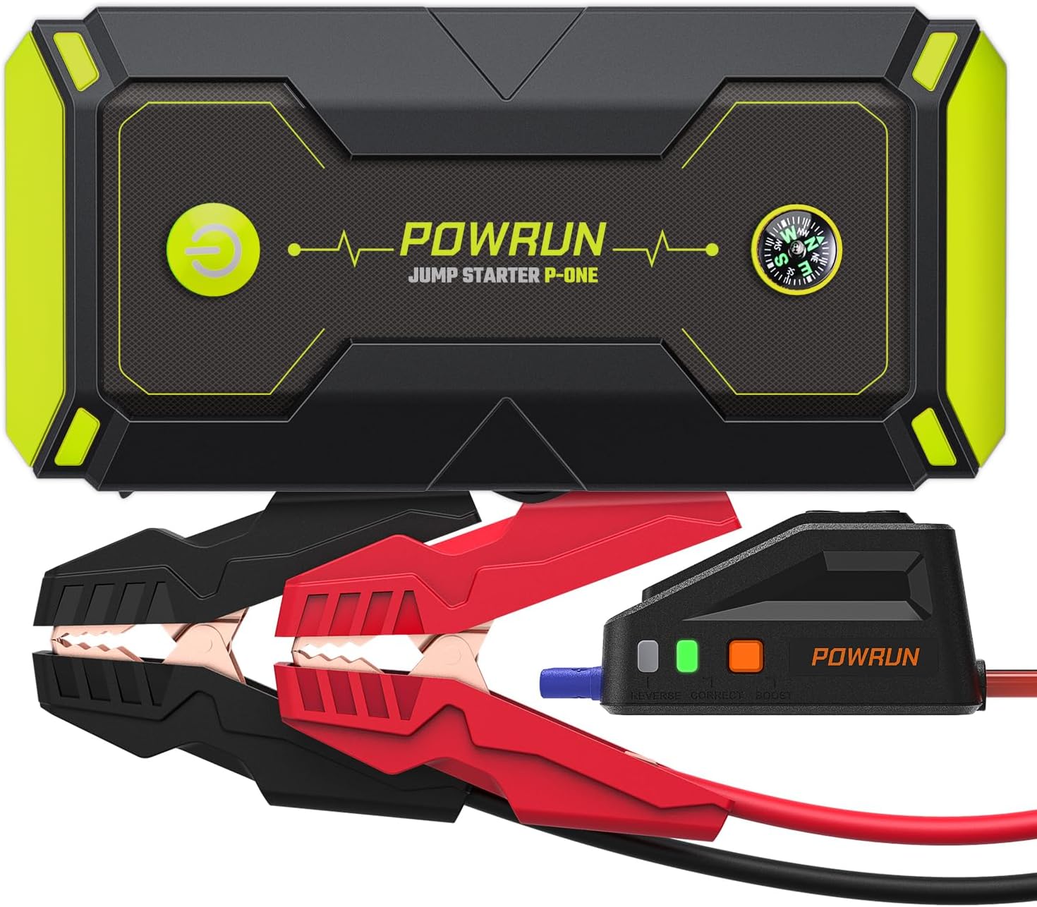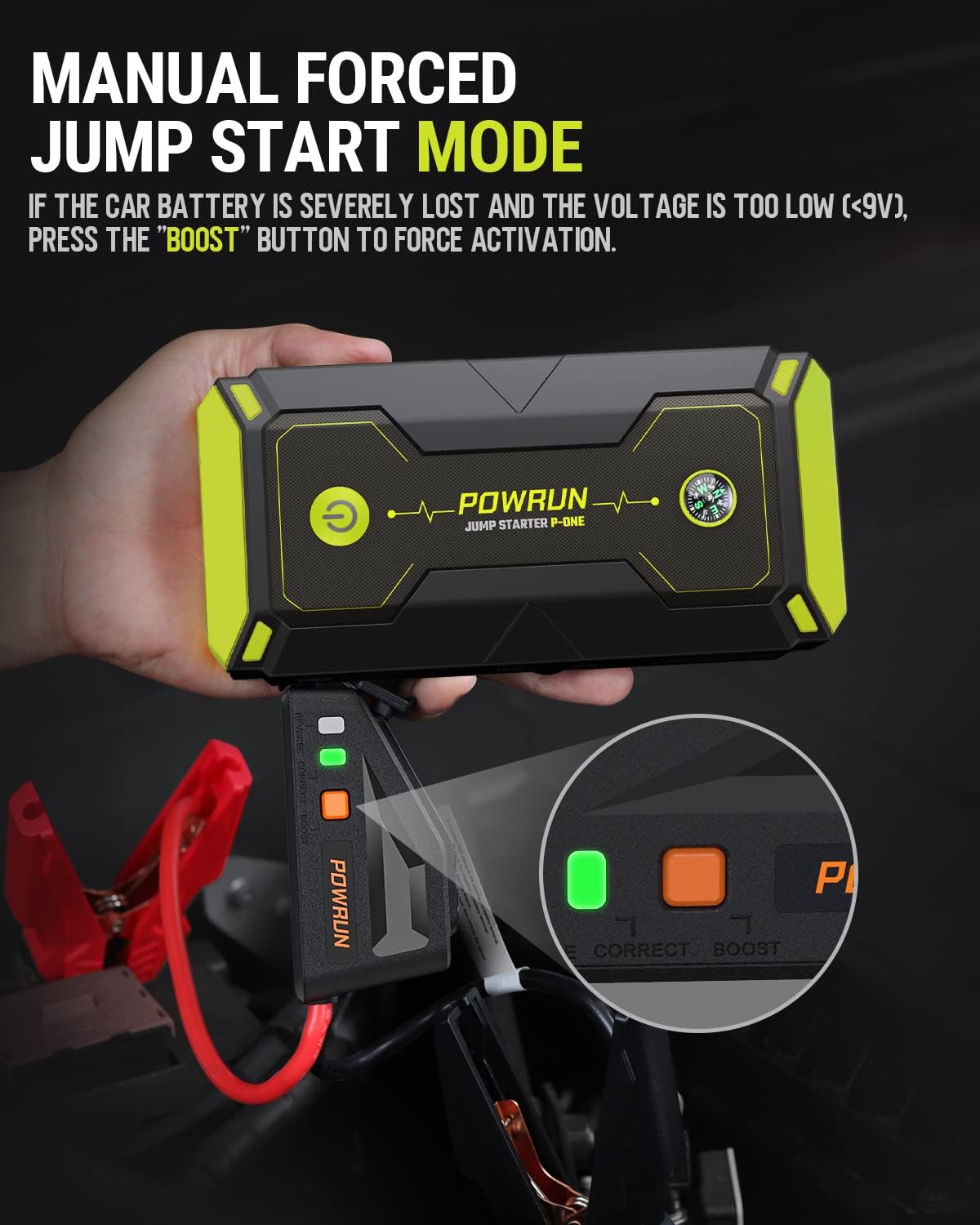 • WHAT YOU GET - Powrun P-ONE Jump Starter, Smart Jumper Cables, Wall Charger, USB Cable, EVA Storage Case, User Manual, Two years warranty, Excellent after-sales service. Please contact us for help if you have any questions, we will answer in 12 hours.