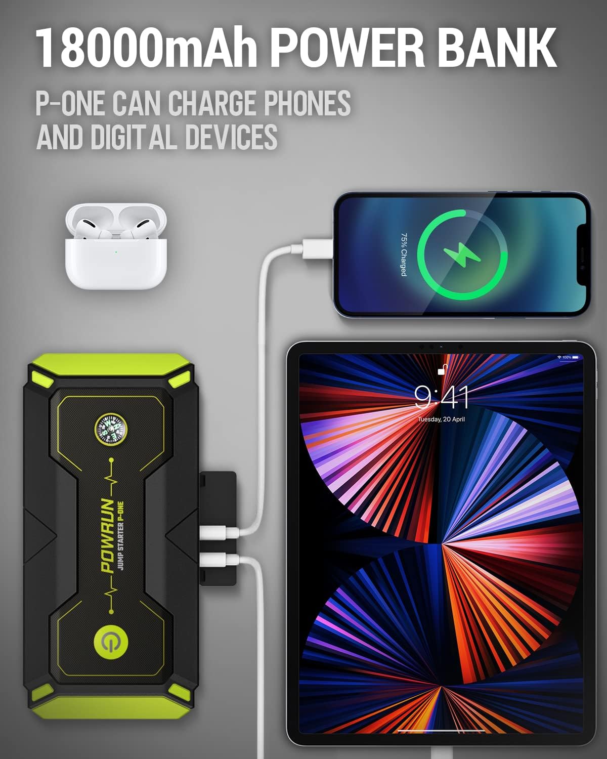 • 3 IN 1 ROAD TRIP KIT - P-ONE is a portable jump starter battery pack, also a 18000mAh portable power bank and LED emergency lamp. Two USB ports can charge your smartphones and tablets etc.; The built-in 4-mode LED light to help you in the dark or in emergency.