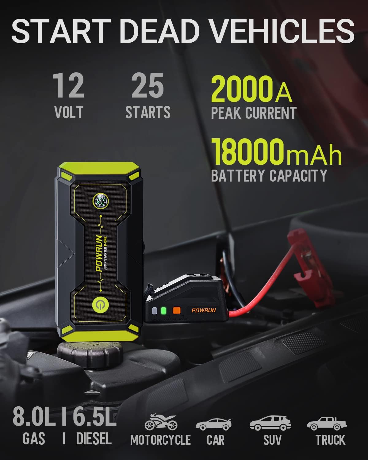 • PERFECT DESIGN - Powrun battery jump box is equipped with digital LCD screen, you can view the usage status and remaining power clearly, the rubber covered molded case is waterproof (IP65), dust-proof and shatterkproof whcih is durable enough for outdoor use. The device is always prepared for energency.