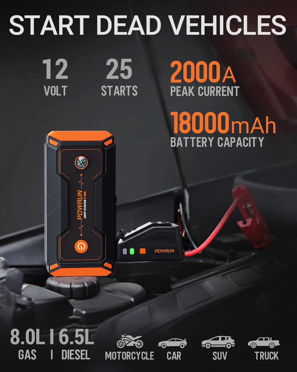 Powrun P-ONE Jump Starter, 2000A Portable Jump Box - Car Jump Starter Battery Pack for up to 8.0L Gas and 6.5L Diesel Engines, 12V Battery Jump Starter with LCD Display (Orange)